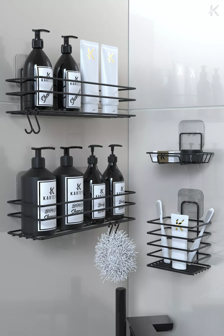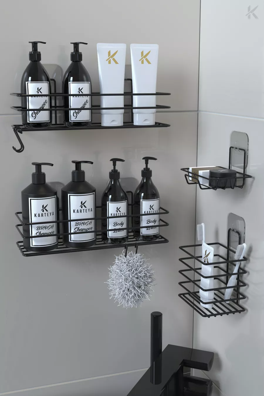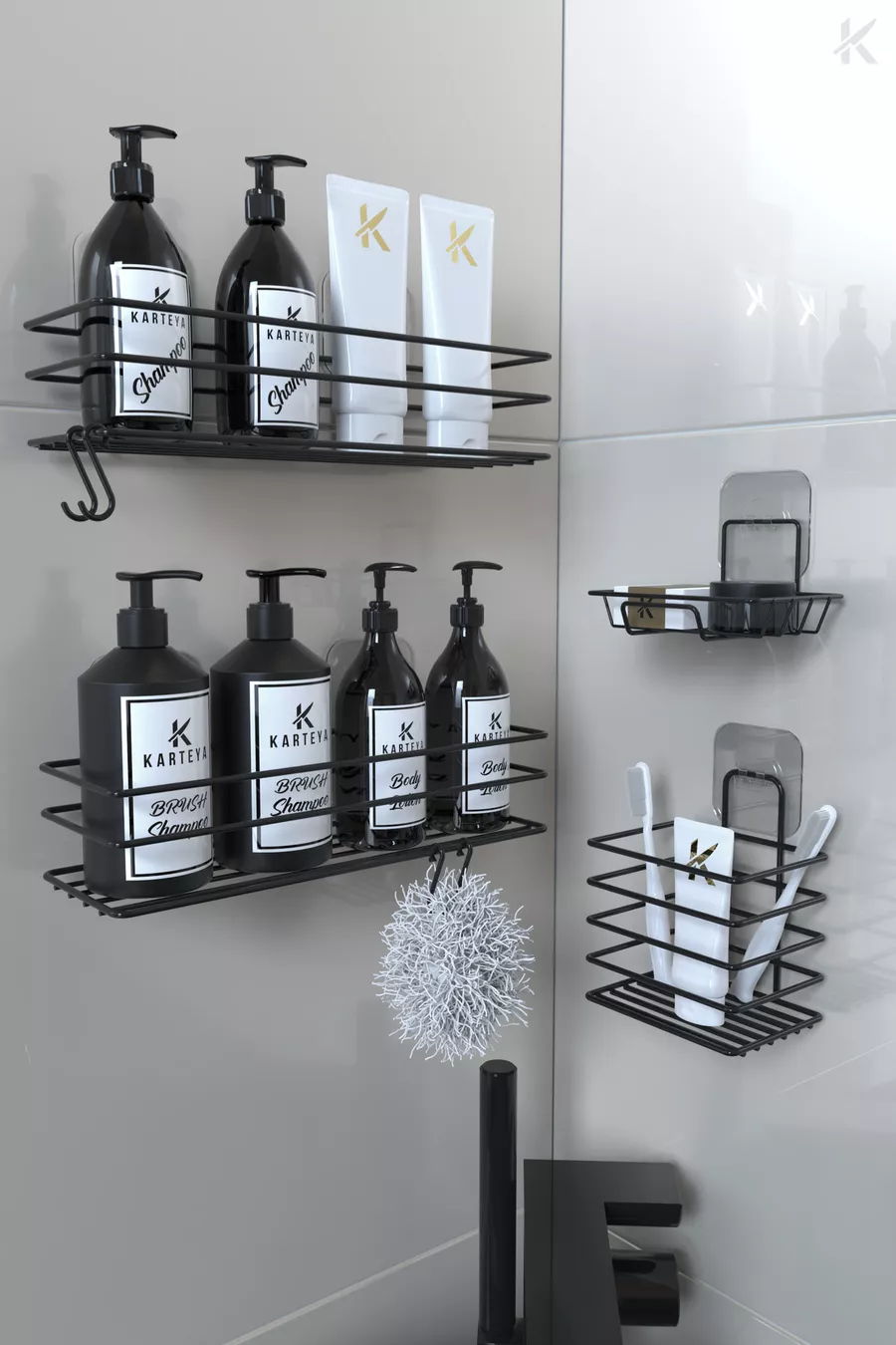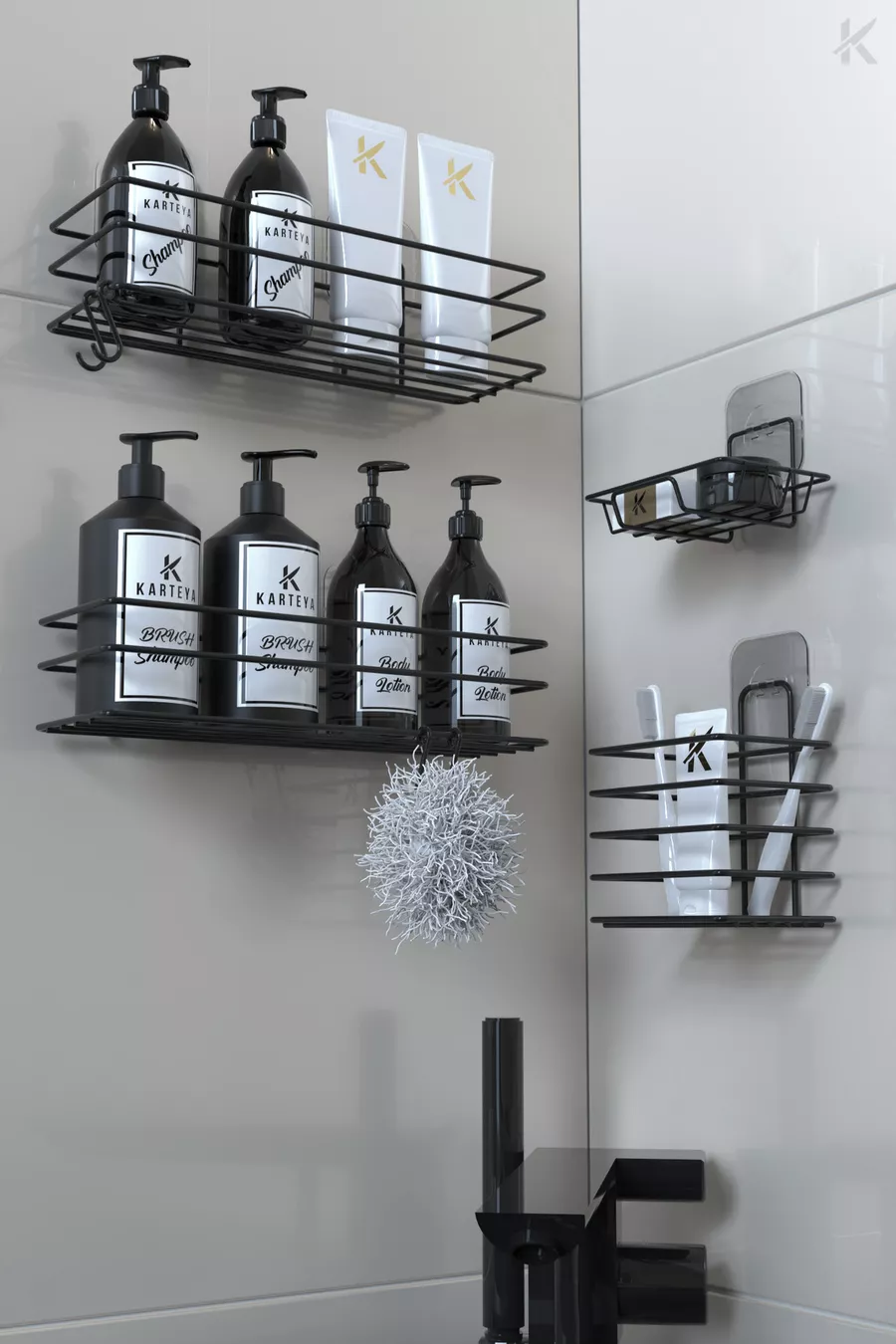 Stainless Steel Adhesive Black Metal Bathroom Shelf Organizer 4-Piece Set Hooked Shower Shelf Soap Rack