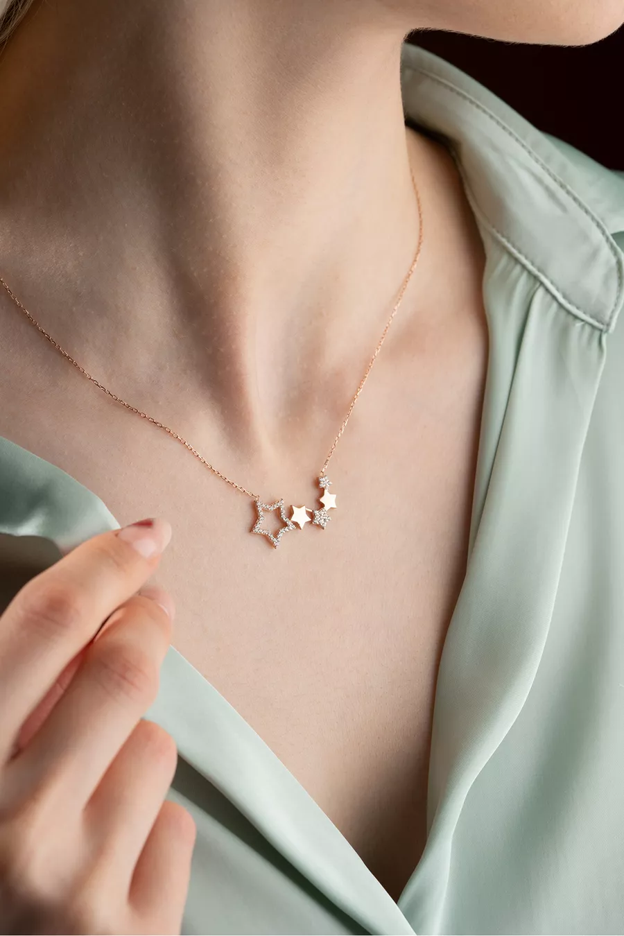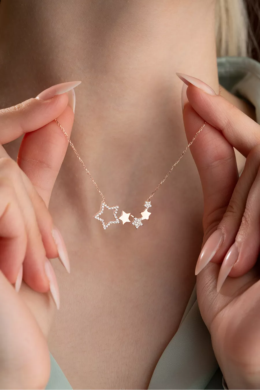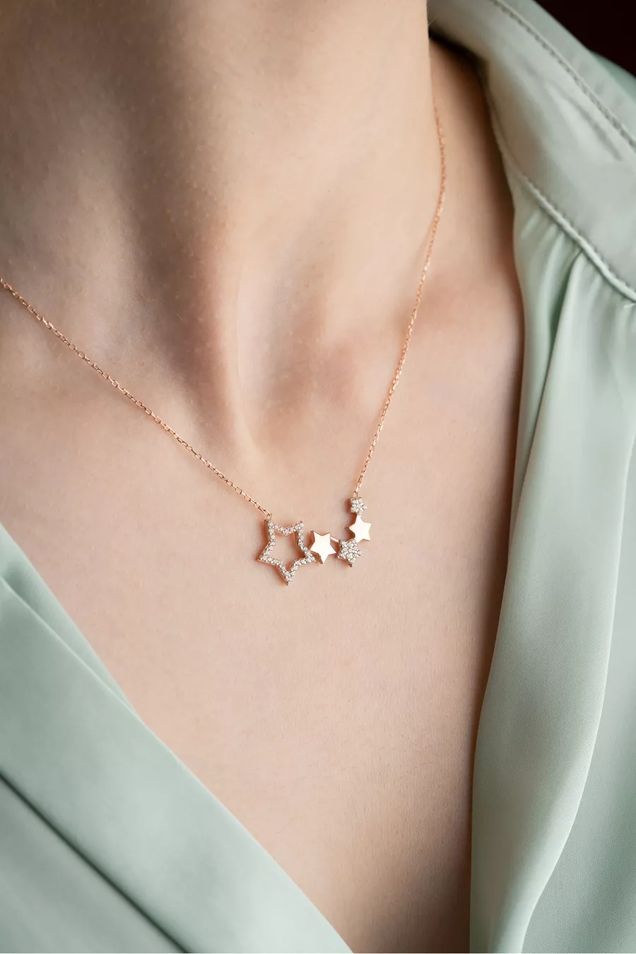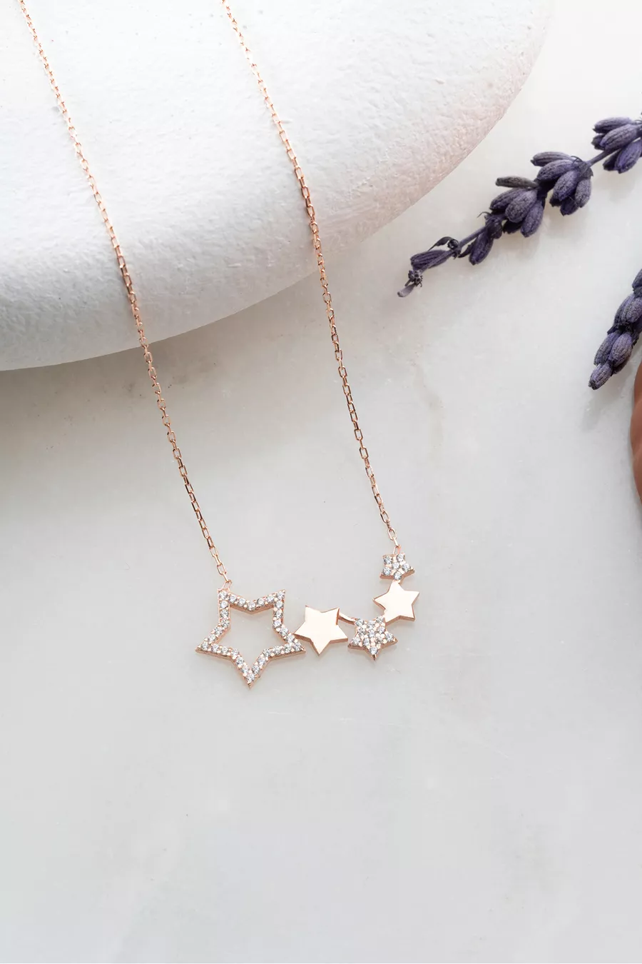 Sterling Silver Rose Plated 5-Star Path Necklace