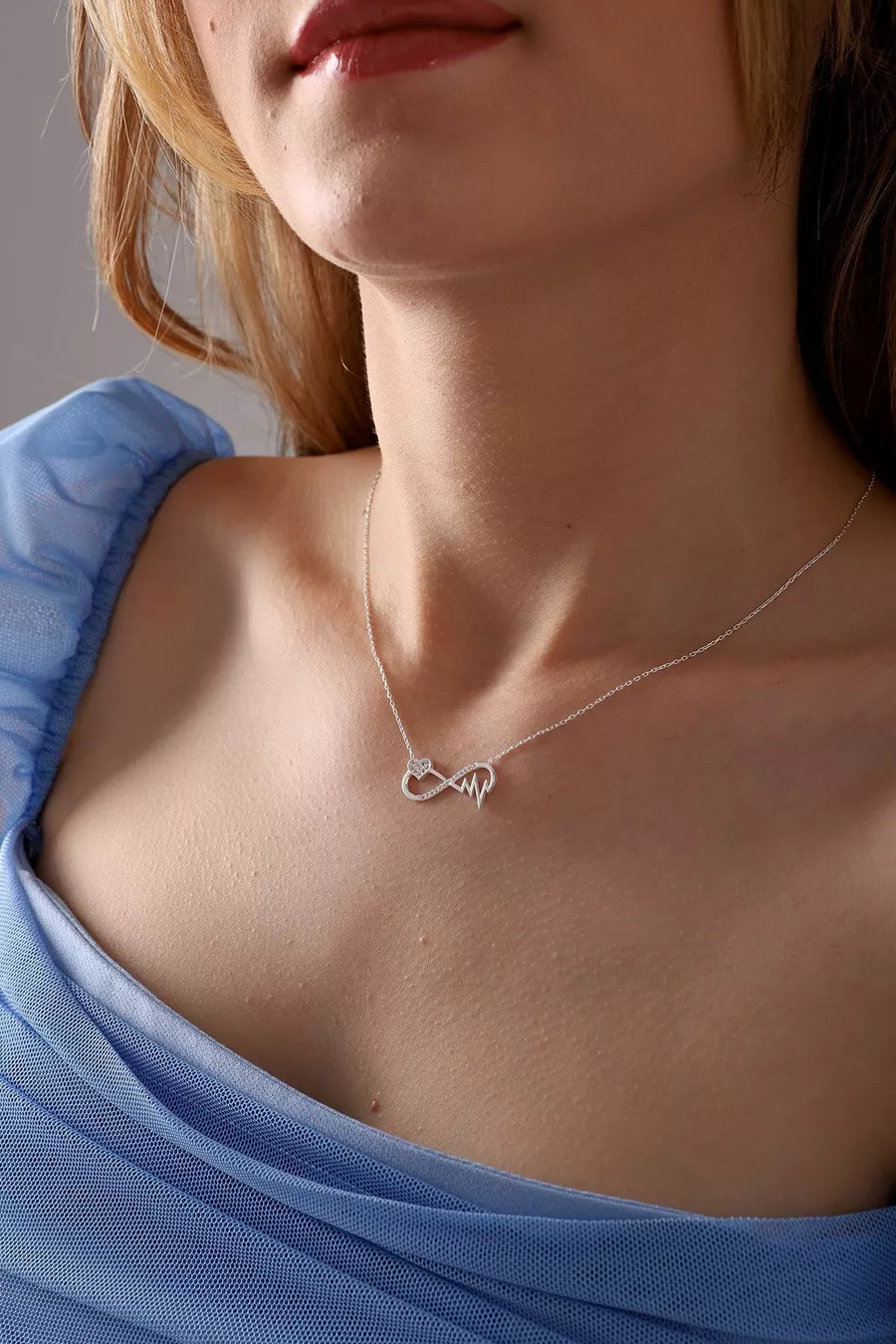 Sterling Silver Chain Necklace with Zircon Stones, Rhythm Heart Infinity Design