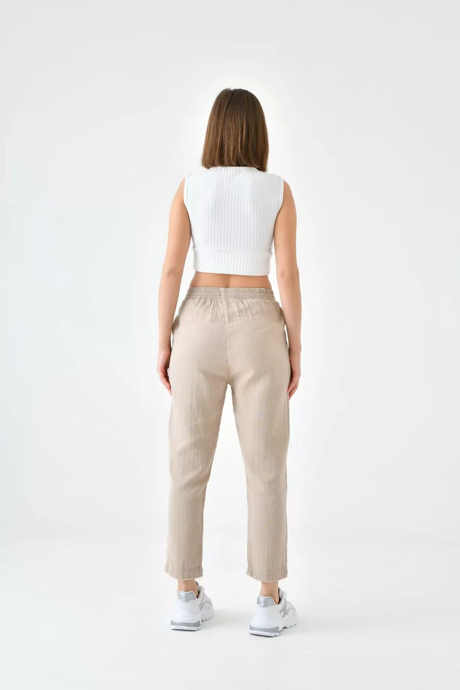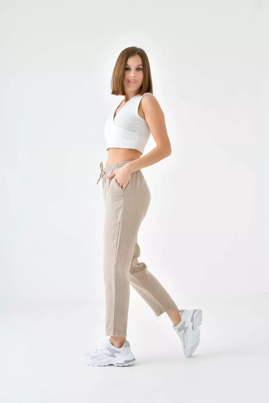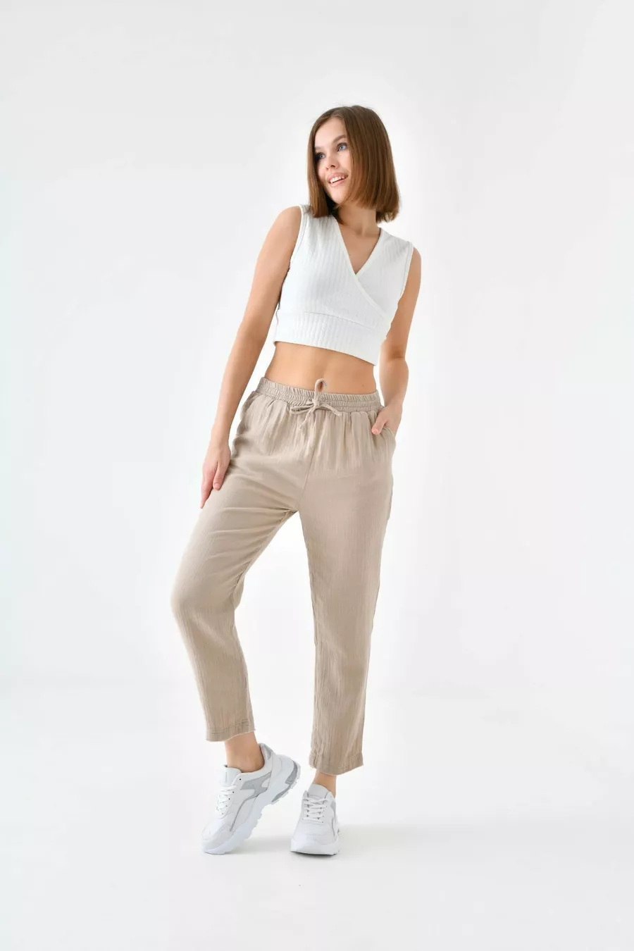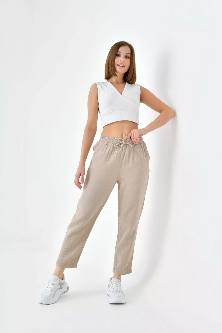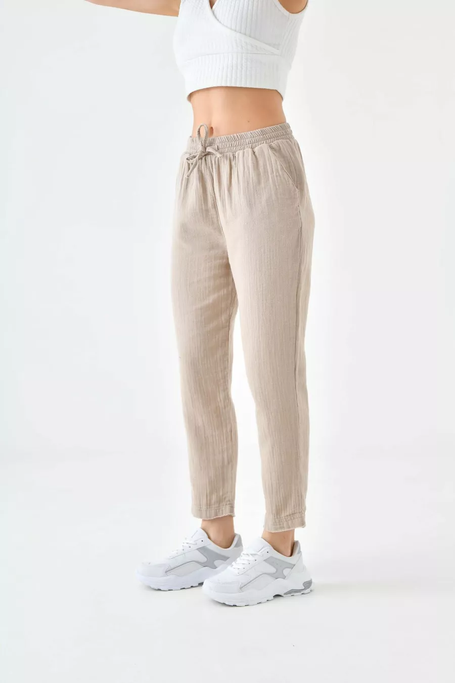 Silhouette: Regular Material: Cotton Fabric Type: Woven Closure Type: Tie / Drawstring Leg Type: Slim Leg Waist: Regular Waist Color: Gray Fit: Slim Fit Pattern: Solid Occasion: Casual Length: Long Material Composition: 100% Cotton Weaving Type: Muslin Additional Feature: Elastic Waist Persona: Cool & Comfort Thickness: Thin Washing Instructions: type 1 Collection: Design Sustainability Detail: Yes Belt / Strap: Without Belt Product Detail: Leg Season: All Seasons Origin: TR