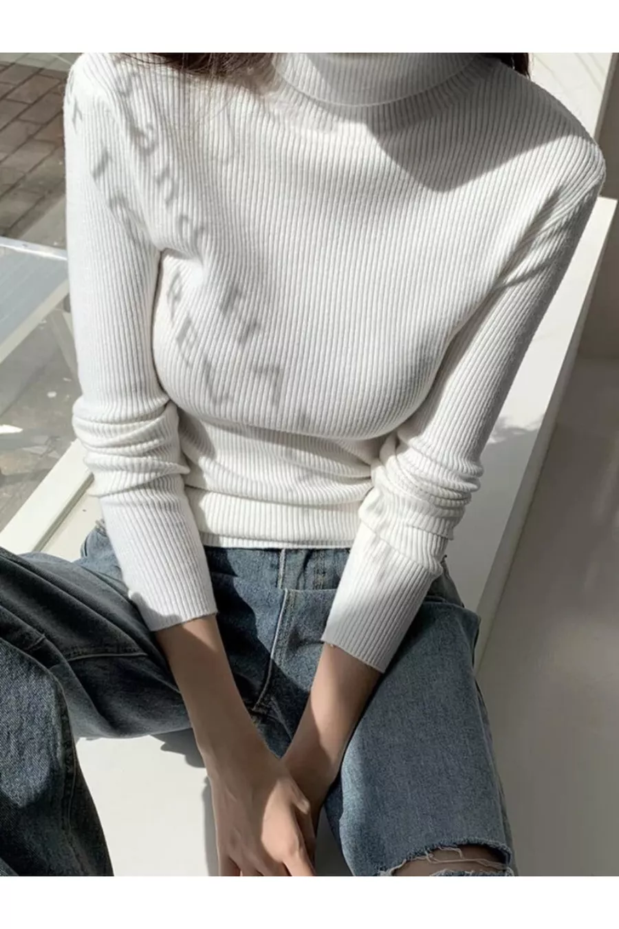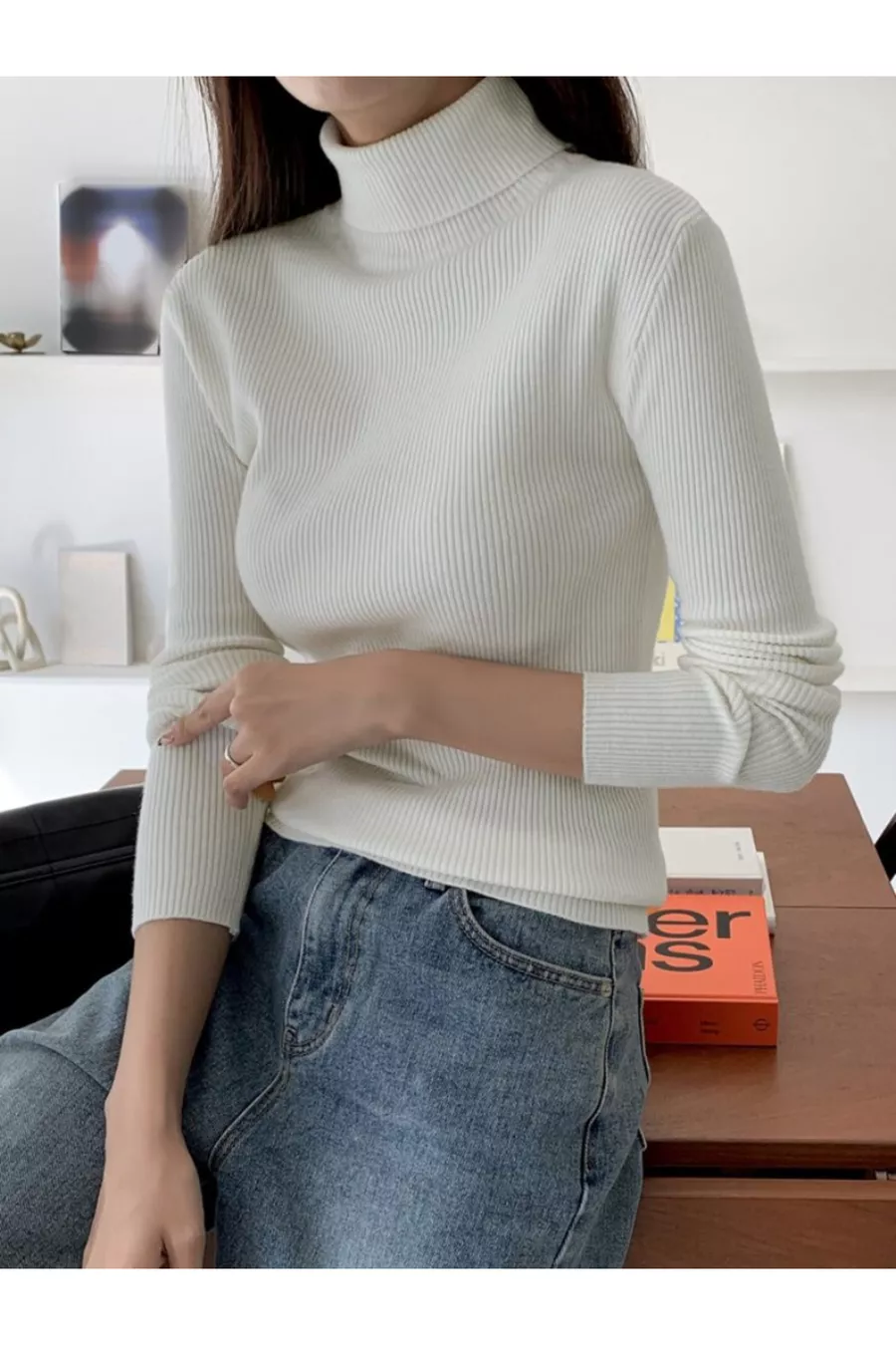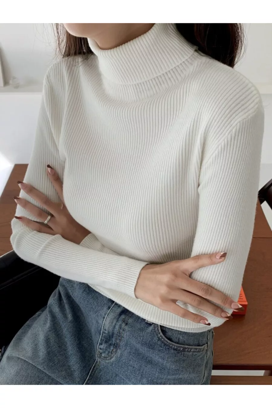Unisex White Cotton Ribbed Turtleneck Slim Fit Sweater with Brushed Finish