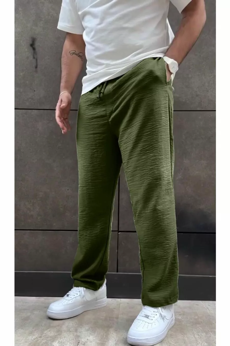 Material: Linen Blend Fabric Type: Linen Leg Type: Wide Leg Waist: Elastic Pattern: Solid Color: Khaki Pocket: Double Pocket Product Detail: Leg Collection: Linen Thickness: Thin Lining: Unlined Length: Regular Silhouette: Basic Occasion: Casual Fit: Oversize Additional Feature: Adjustable Waist Weave Type: Aerobin Persona: Fashion Forward Print/Embroidery Technique: No Print Belt/Sash: Beltless Sustainability Detail: No Washing Instructions: T09 Season: Summer Origin: TR Box Condition: Boxed Closure Type: Tie/String Package Content: Single