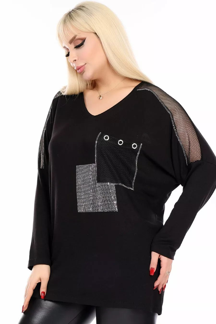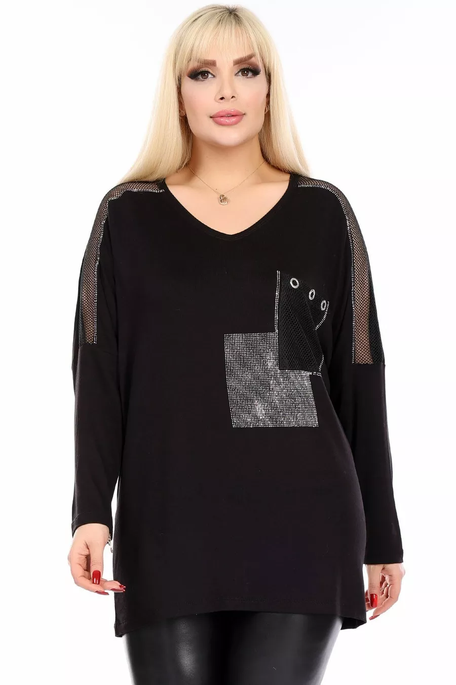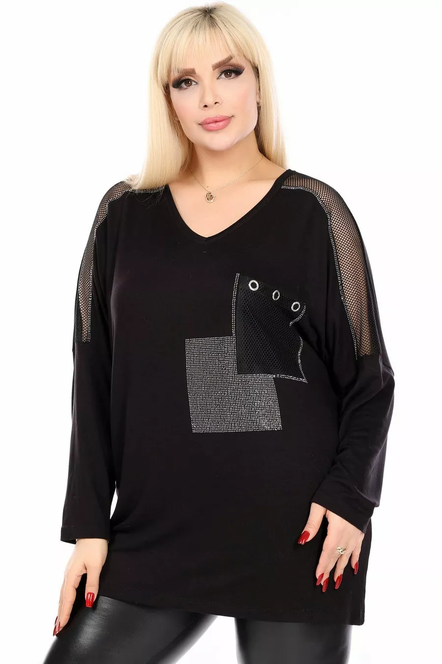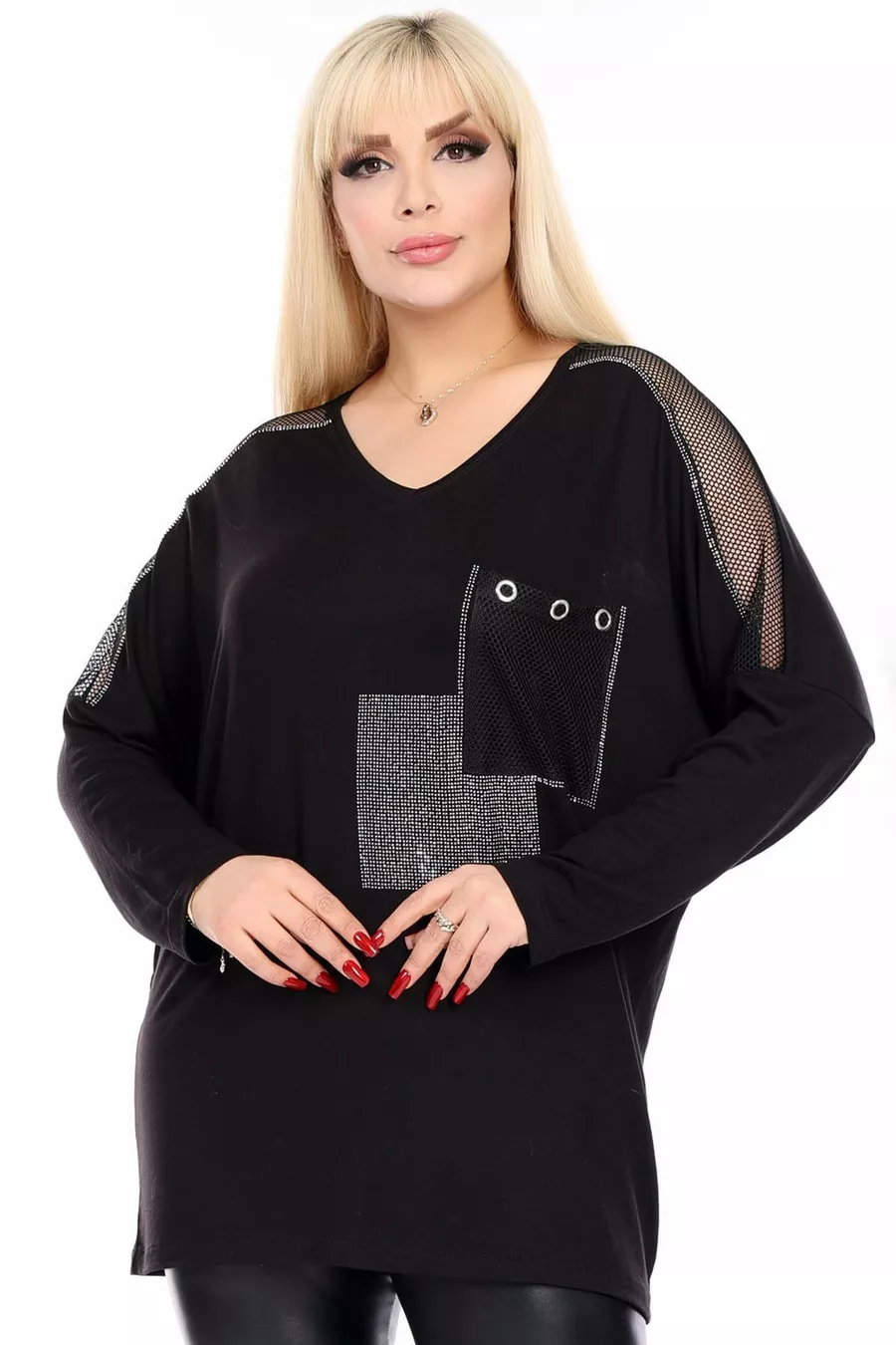 Pattern: Plain Fit: Plus Size Neck Type: V-Neck Fabric Type: Knit Material: Cotton - Elastane Sleeve Type: Regular Sleeve Color: Black Occasion: Casual/Daily Length: Regular Sleeve Length: Long Print/Embroidery Technique: Applied Stones Additional Feature: Stretchy Persona: Cool & Comfort Pocket: With Pocket Weave Type: Pompom Viscose Belt/Tie Status: None Sustainability Detail: Yes Silhouette: Relaxed Material Composition: 95% Viscose, 5% Lycra Thickness: Medium Washing Instructions: type 1 Collection: Plus Size Origin: TR Package Contents: Single