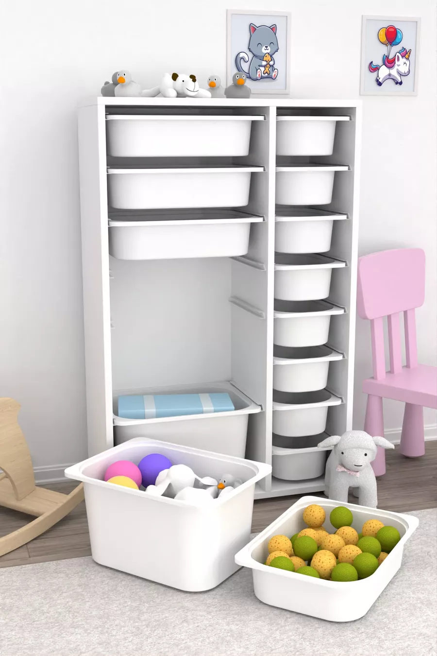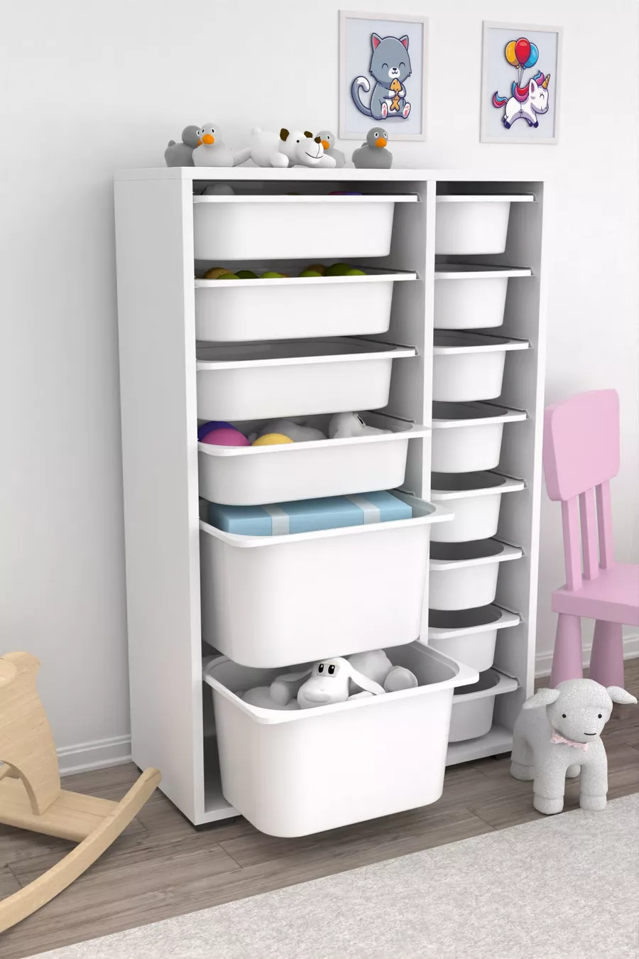 Material: Chipboard Number of Drawers: 14 Width: 69 cm Depth: 30 cm Height: 109 cm Color: White Theme / Style: Modern Origin: TR Age: 4 - 8 Years