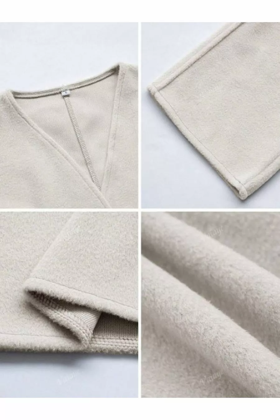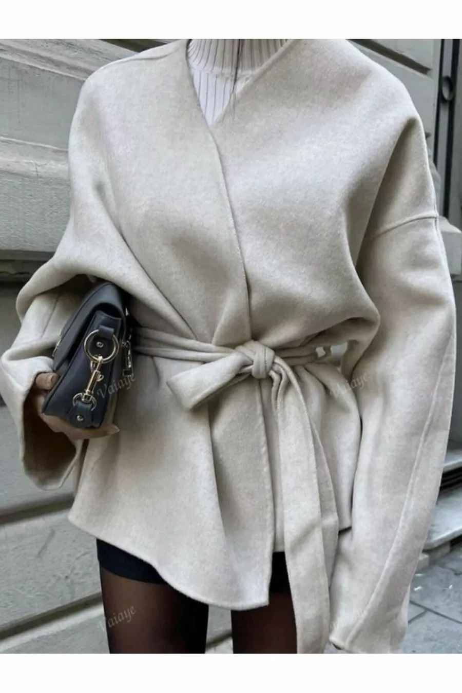 Sleeve Type: Batwing Sleeve Pattern: Plain Fit: Oversize Neck Type: V-Neck Material: Cashmere Fabric Type: Not specified Color: Cream Closure Type: Tie/String Product Detail: With Belt Pocket: Hidden Sleeve Length: Long Collection: Tall Thickness: Thick Lining: Unlined Length: Maxi Silhouette: Mom Occasion: Elegant/Evening Additional Feature: Licensed Weave Type: Melton Sustainability Detail: Yes Persona: None Persona Belt Status: With Belt Product Type: Plain Material Component: Cotton Washing Instructions: Dry Clean Recommended / Wash at 30 degrees without spinning Season: Winter Origin: TR Box Status: No Box