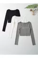Pattern: Plain Fit: Slim Fit Neck Type: Square Neck Fabric Type: Woven Material: Cotton Sleeve Type: Long Sleeve Color: Gray Pocket: No Pockets Product Type: Plain Thickness: Medium Lining: Unlined Length: Crop Collection: Underwear Sleeve Length: Long Occasion: Casual/Daily Silhouette: Crop Weave Type: RIB Additional Feature: Non-See-Through Persona: Cool & Comfort Belt/Strap Status: Without Belt Print/Embroidery Technique: No Print Closure Type: No Closure Sustainability Detail: No Washing Instructions: T01 Package Content: Set of 3 Cup: Without Cup Season: Winter Box Status: No Box