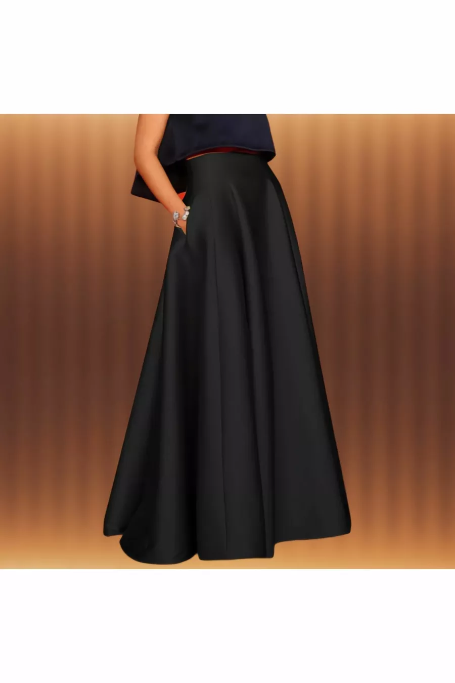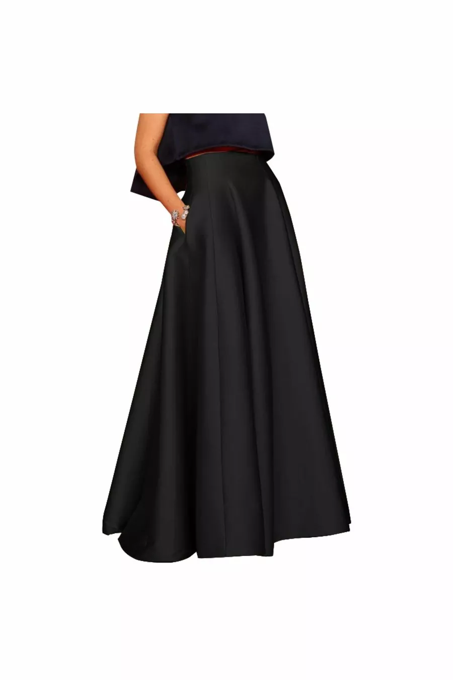 Women's Black Pocket High Waist Maxi Long A-line Pleated Satin Skirt