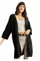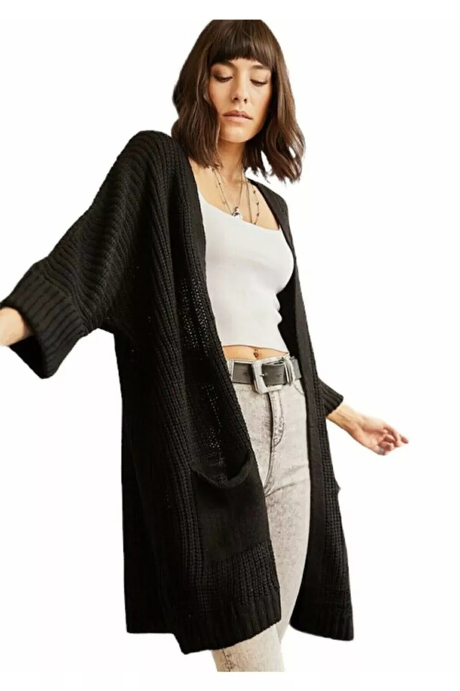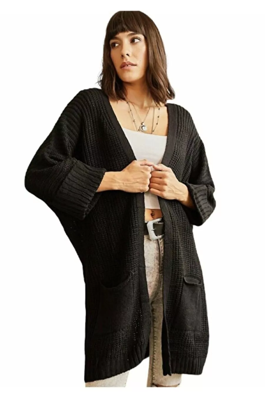 Women's Black Oversized Pocket Loose Knit Cardigan with Double Sleeves