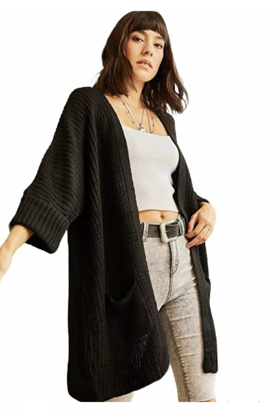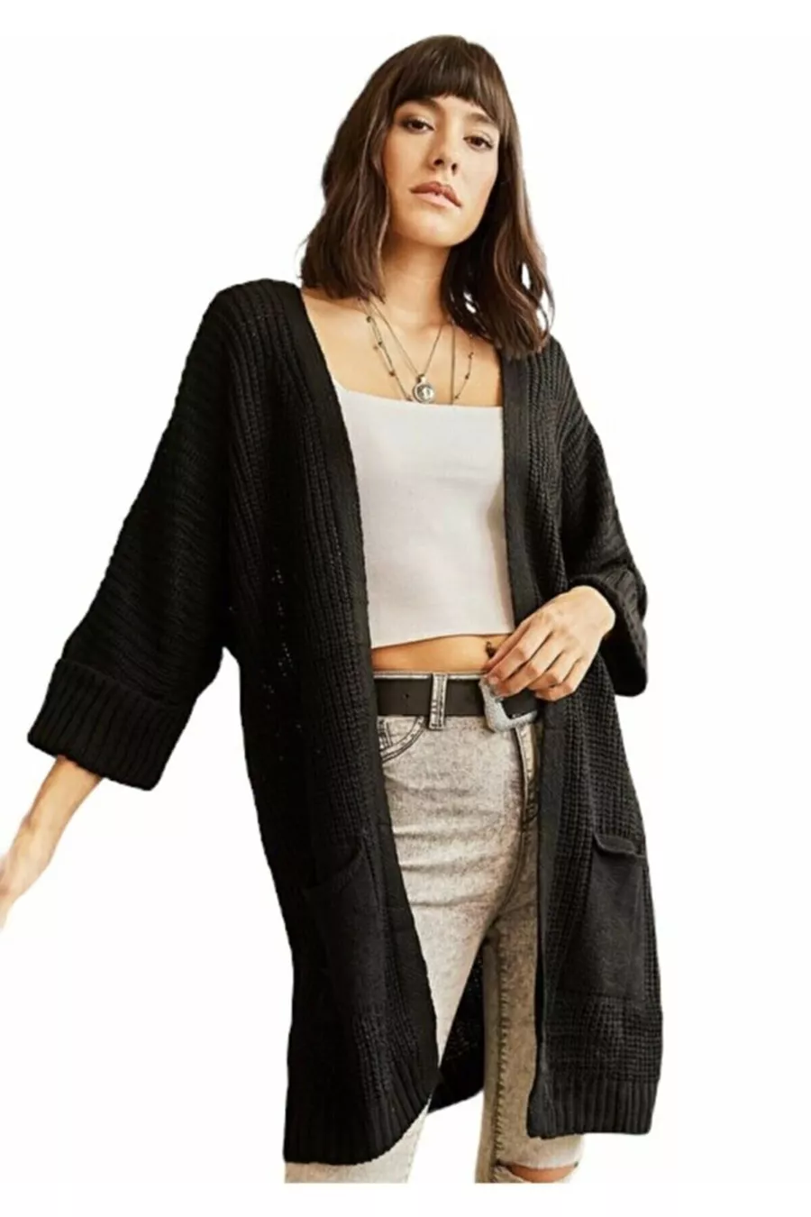 Material: Acrylic Sleeve Type: Standard Sleeve Pattern: Plain Fit: Oversize Fabric Type: Knit Color: Black Neckline Type: Crew Neck Product Detail: With Pockets Product Type: Plain Pocket: Double Pocket Sleeve Length: Long Collection: Modest Wear Length: Long Silhouette: Basic Occasion: Casual Additional Feature: No Additional Feature Print/Embroidery Technique: No Print Closure Type: No Closure Number of Pieces: 1 Sustainability Detail: No Weave Type: Knitted Belt/Strap Status: Without Belt Material Composition: 100% Acrylic Washing Instructions: T44 Country of Origin: TR Box Status: No Box