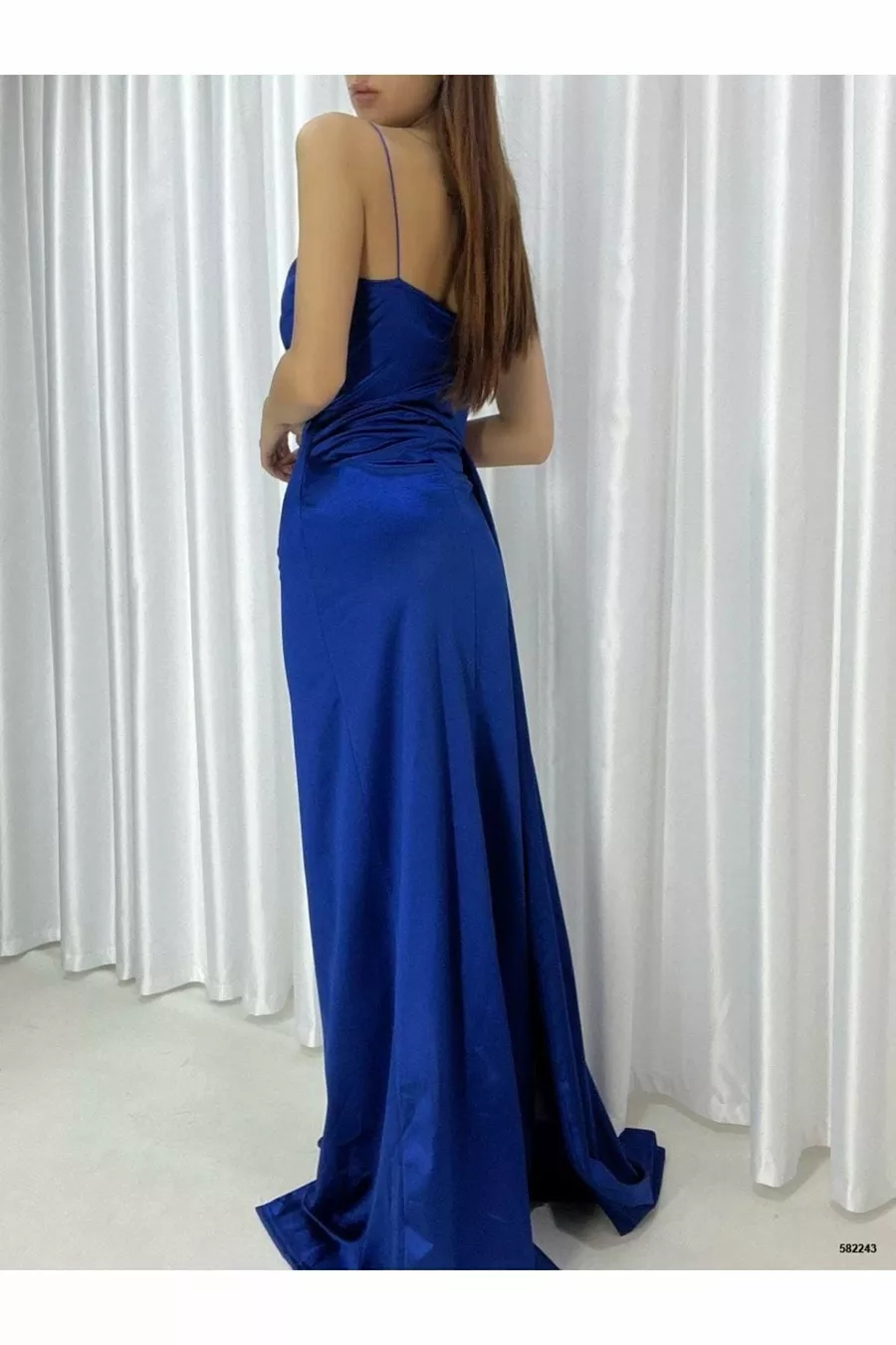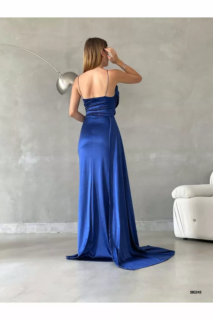 Women's Blue Strapless Decaere Collar Thin Strap Drape Detail Long Tail Slit Satin Evening Dress