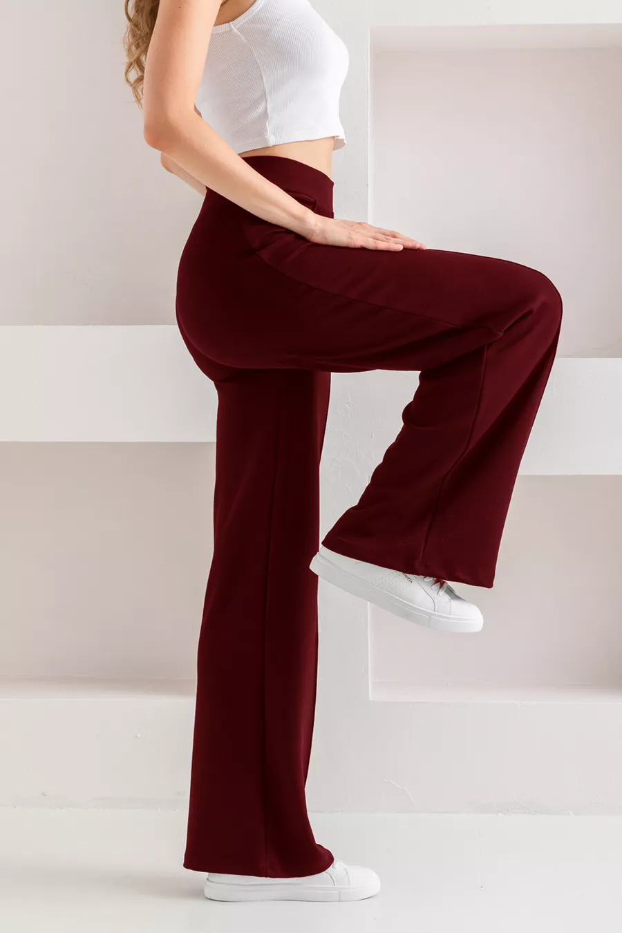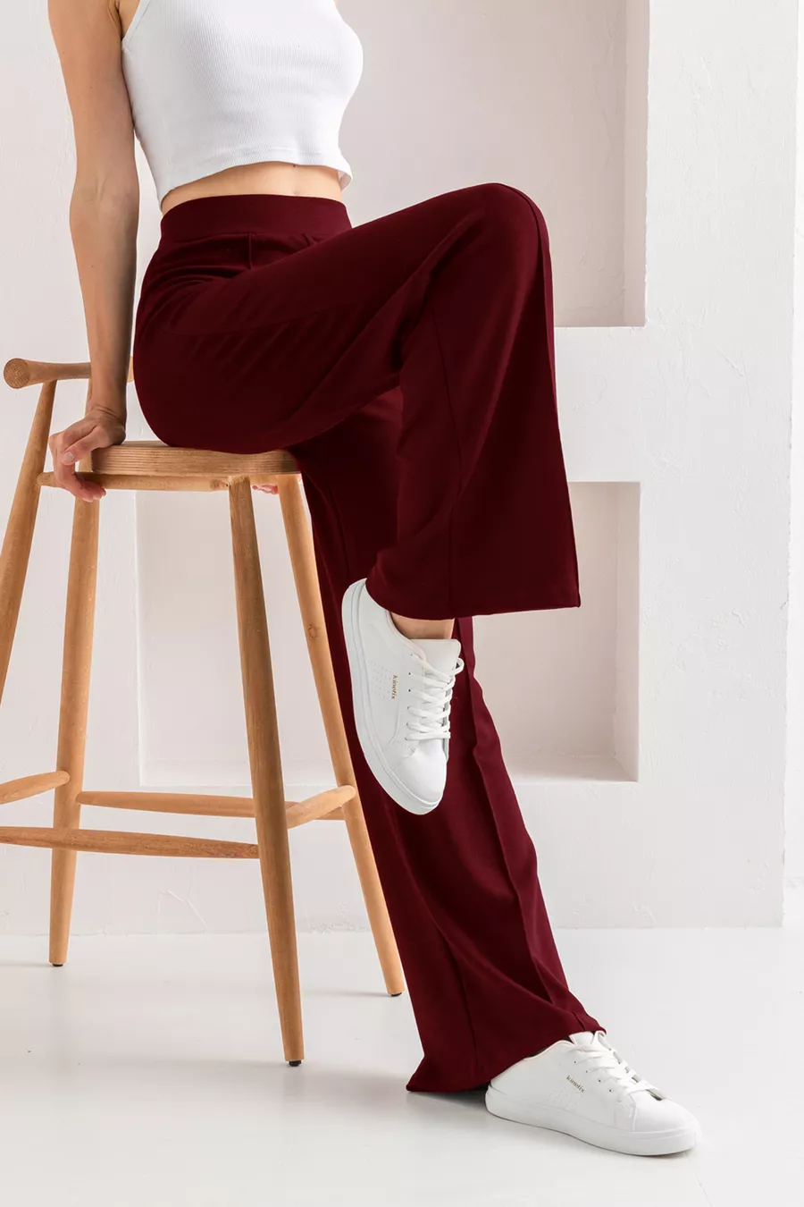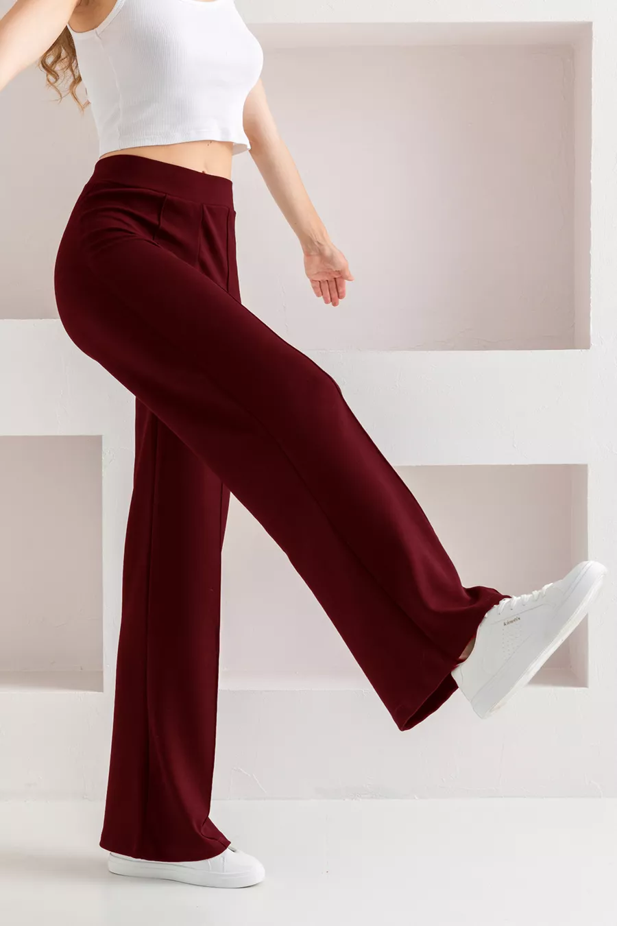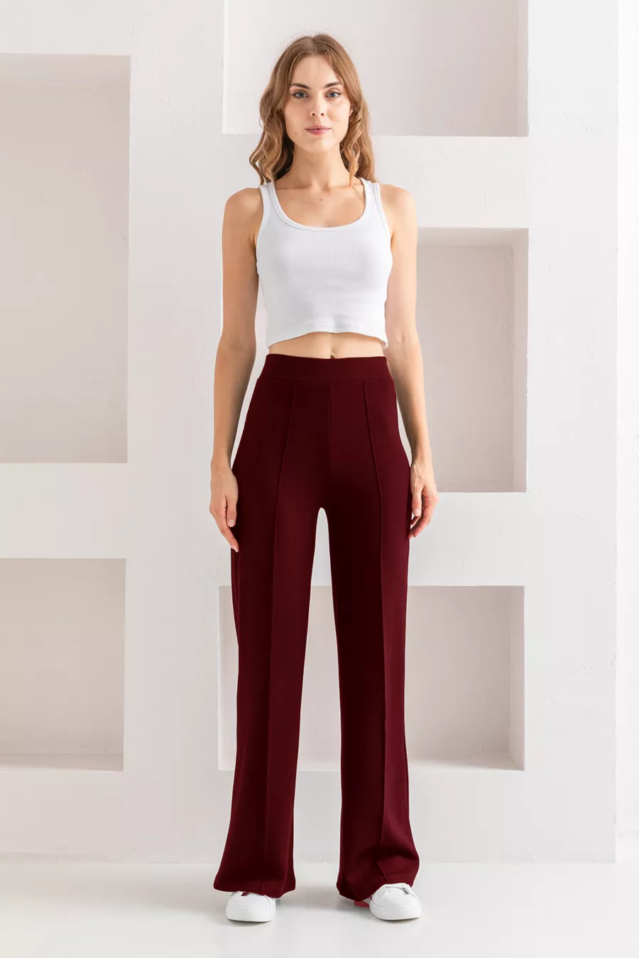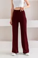 Material: Cotton - Polyester - Elastane Fabric Type: Woven Leg Type: Wide Leg Waist: High Waist Pattern: Solid Color: Burgundy Pocket: No Pockets Product Detail: Ribbed Collection: Young Thickness: Medium Lining Status: Unlined Length: Regular Silhouette: Slim Occasion: Casual Fit: Loose Additional Feature: Stretchy Weave Type: Modal Fabric Persona: Young Print/Embroidery Technique: No Print Belt/Tie Status: No Belt Sustainability Detail: Recycled + Organic Material Composition: 82% Polyester, 18% Elastane (Lycra) Washing Instructions: Recommended to wash inside out at 30 degrees Celsius. Season: All Seasons Origin: TR Box Status: No Box