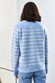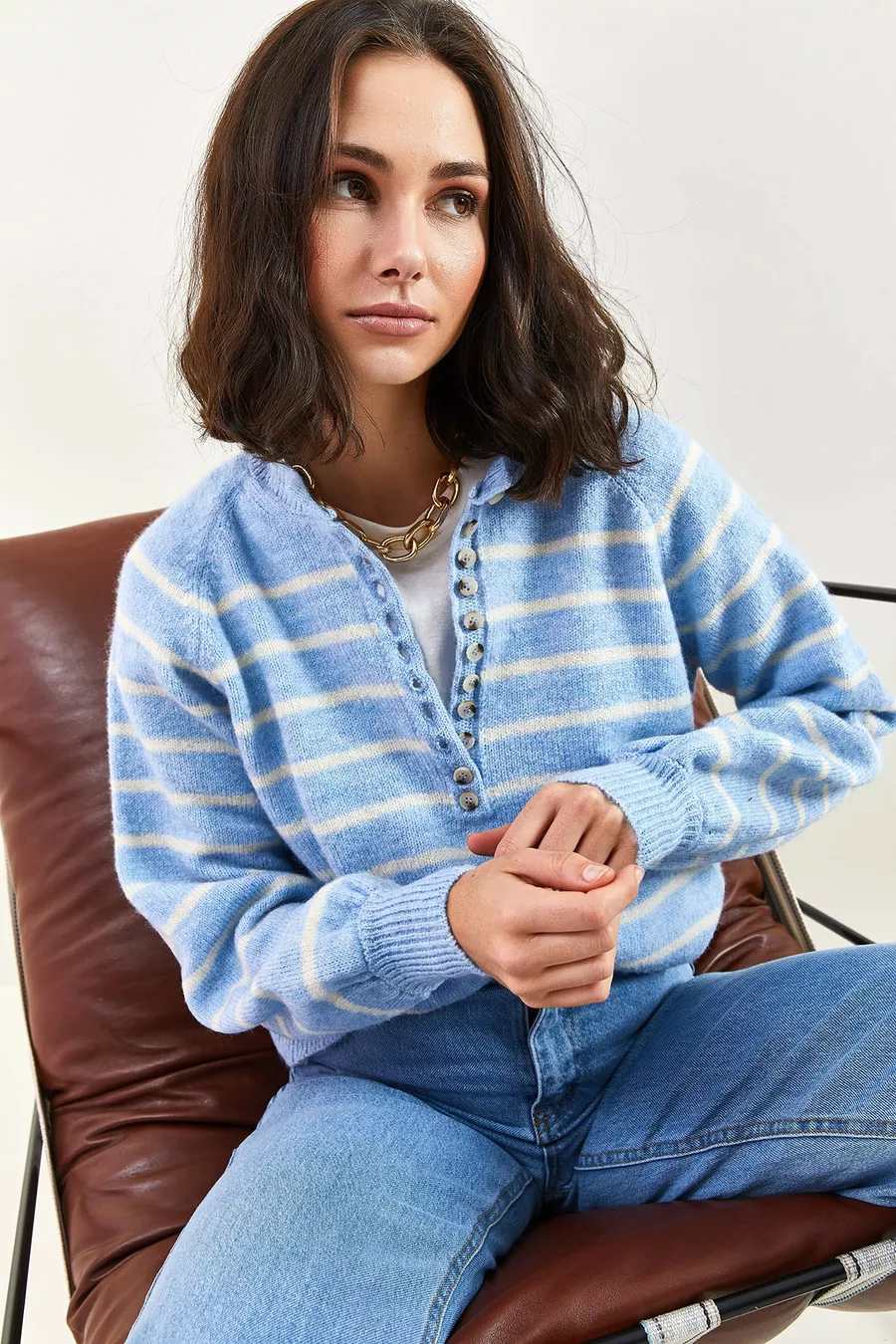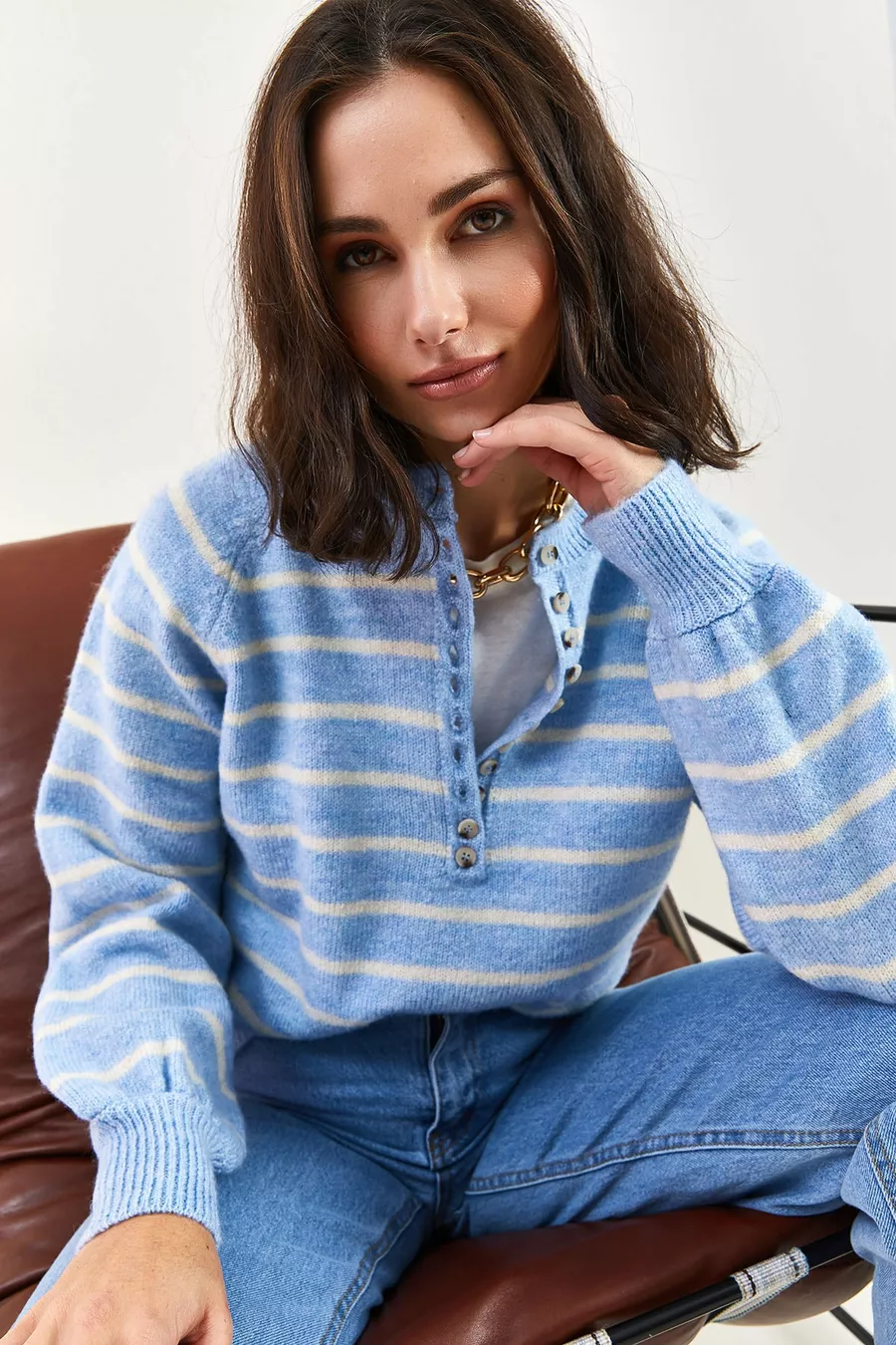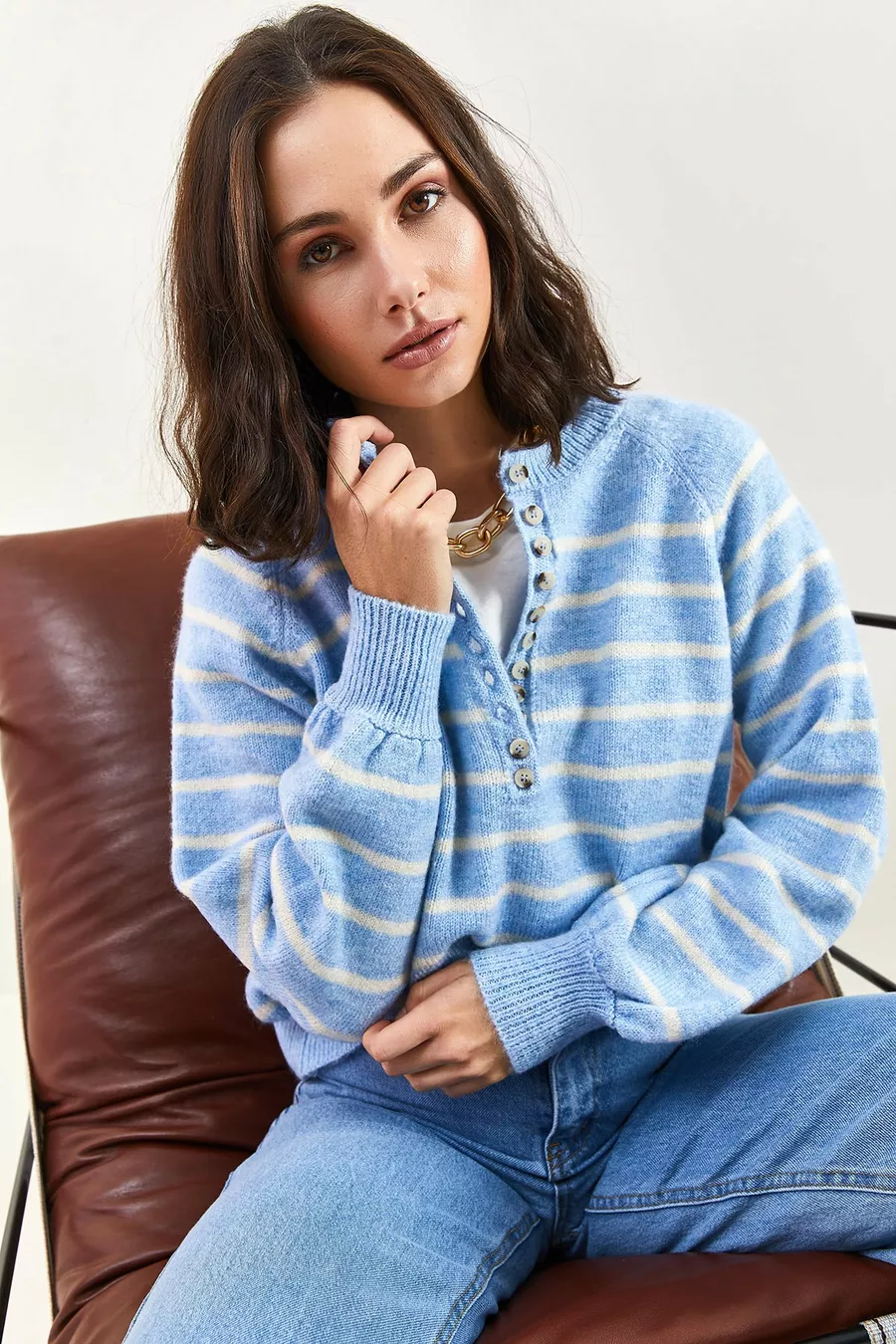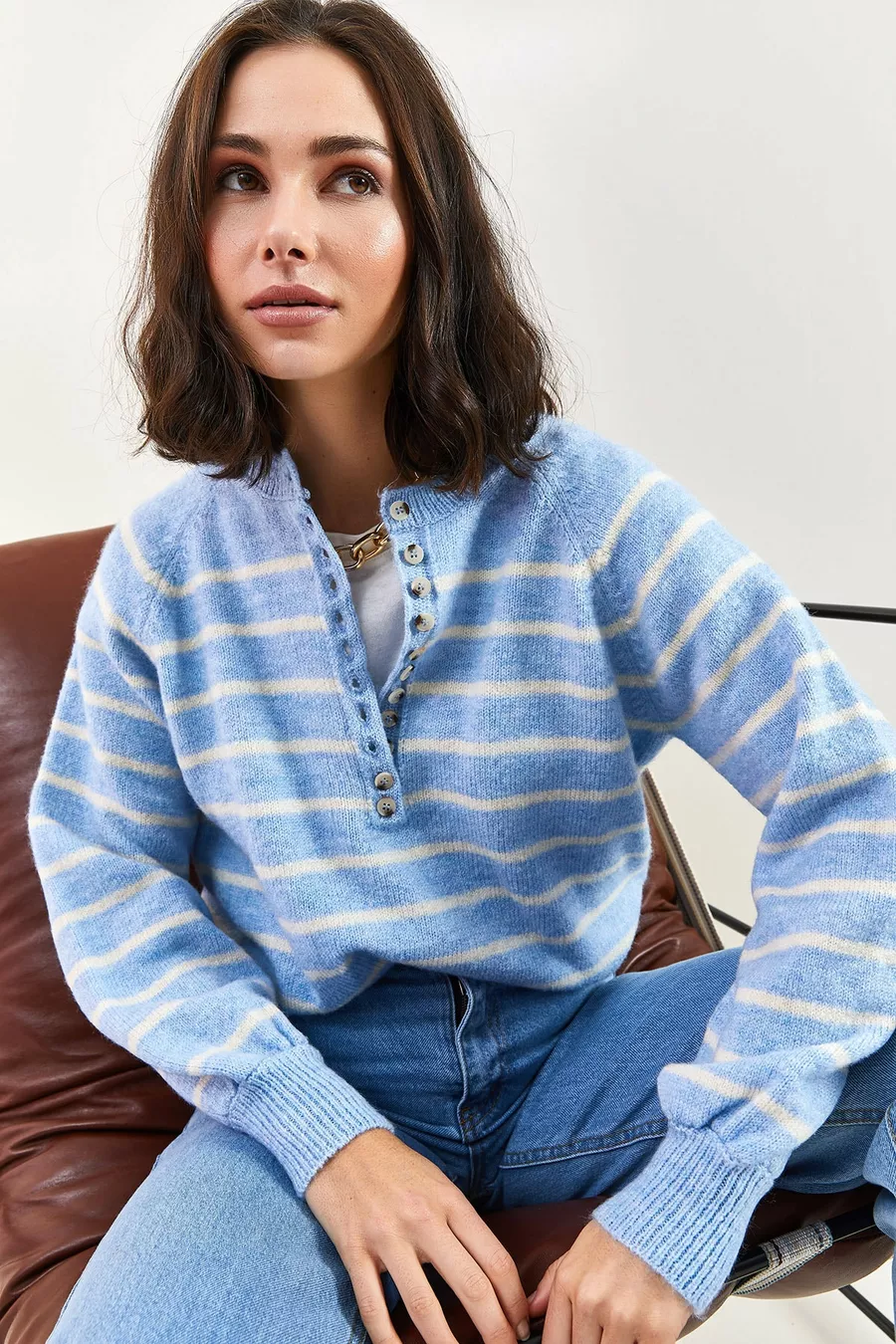 Women's Buttoned Turtleneck Striped Knit Sweater