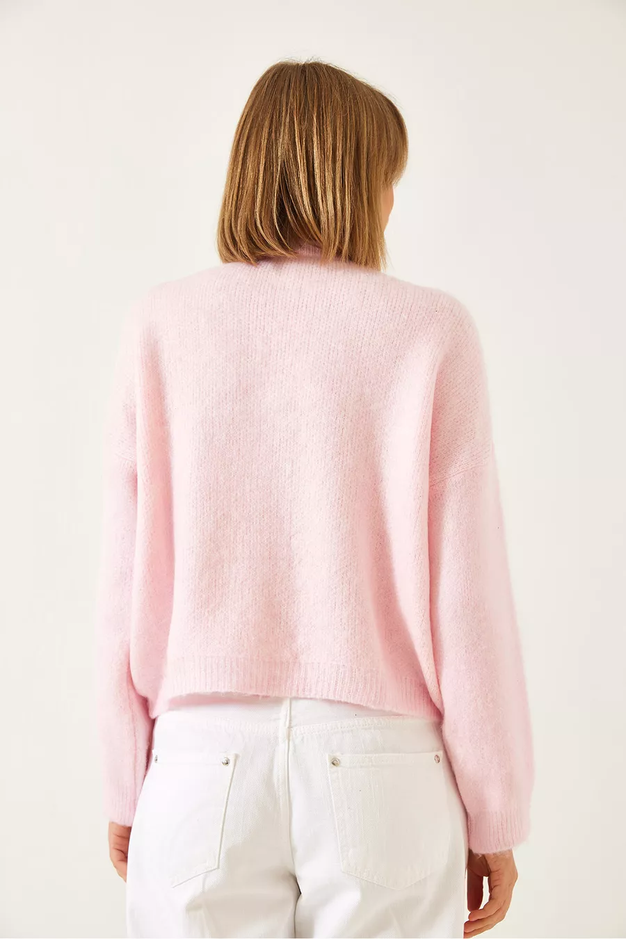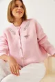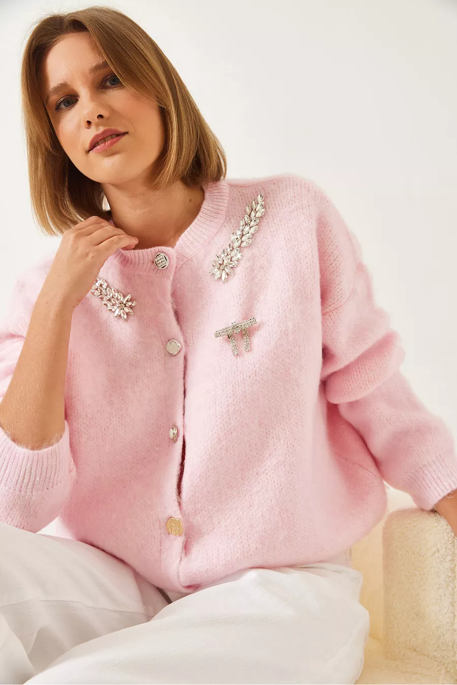Material: Acrylic - Polyester Sleeve Type: Standard Sleeve Pattern: Plain Fit: Regular Color: Pink Fabric Type: Knit Neck Type: Crew Neck Product Detail: Buckled Product Type: Brushed Pocket: No Pockets Sleeve Length: Long Collection: Glam Thickness: Thick Length: Standard Silhouette: Basic Occasion: Trend Additional Feature: Straight Cut Print/Embroidery Technique: Adhesive Stones Closure Type: Buttoned Number of Pieces: 1 Persona: Fashion Forward Sustainability Detail: No Weave Type: Knit-look Belt/Sash Status: Without Belt Material Composition: 75% Acrylic, 20% Polyester, 5% Elastane Washing Instructions: T02 Season: Winter Origin: TR Box Status: No Box