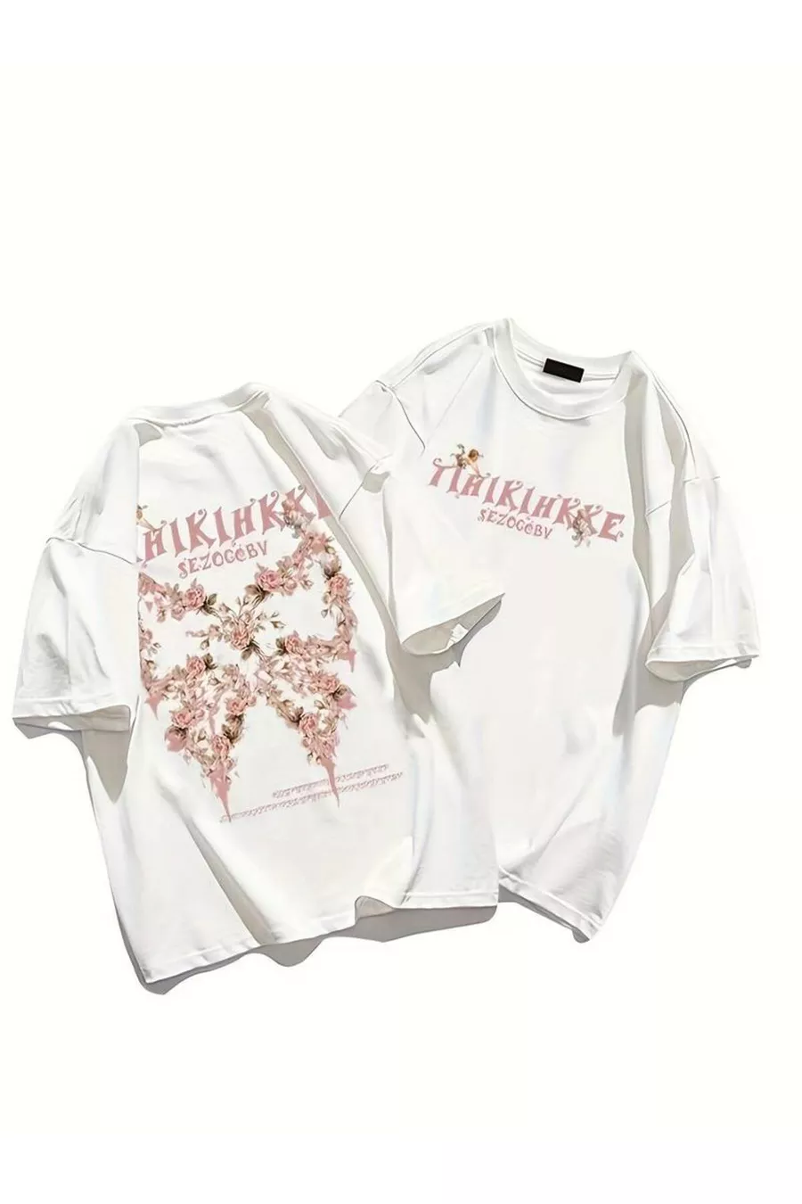 Women's Floral Print Oversized Short Sleeve White Pinterest T-Shirt