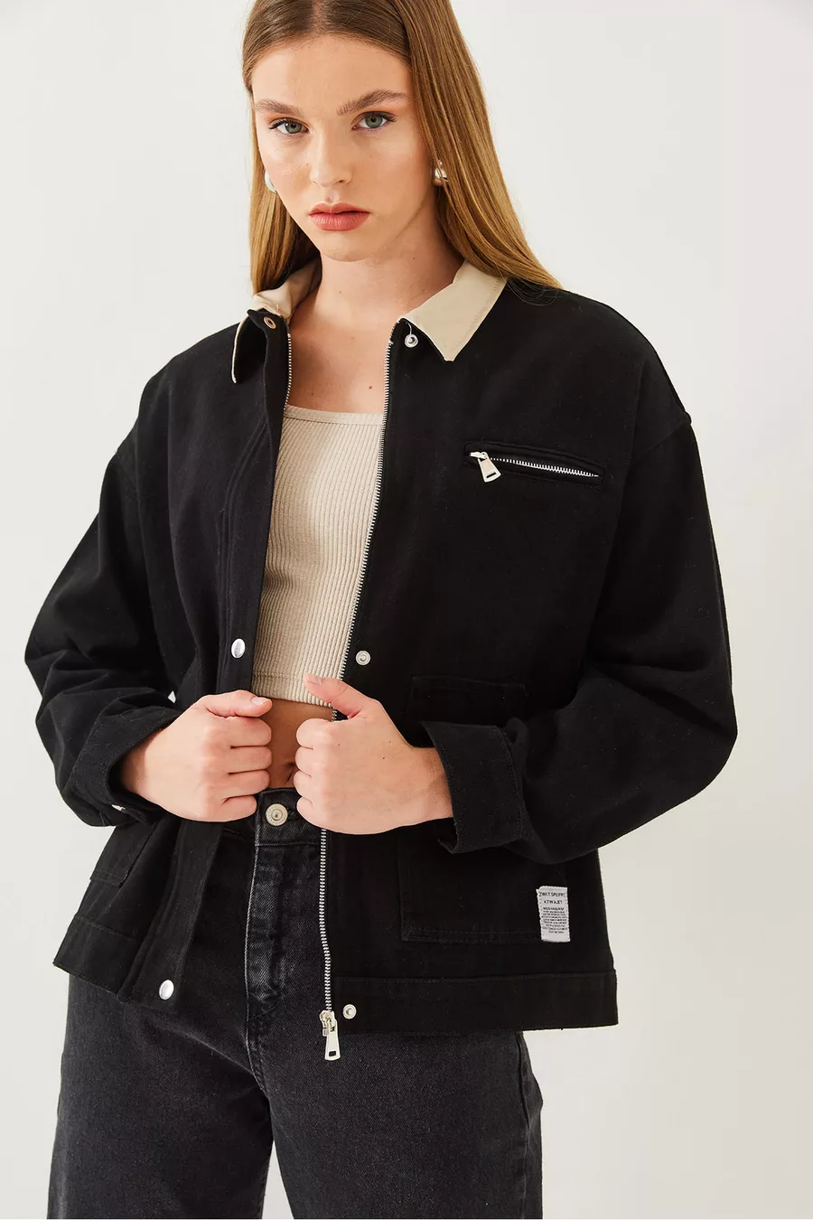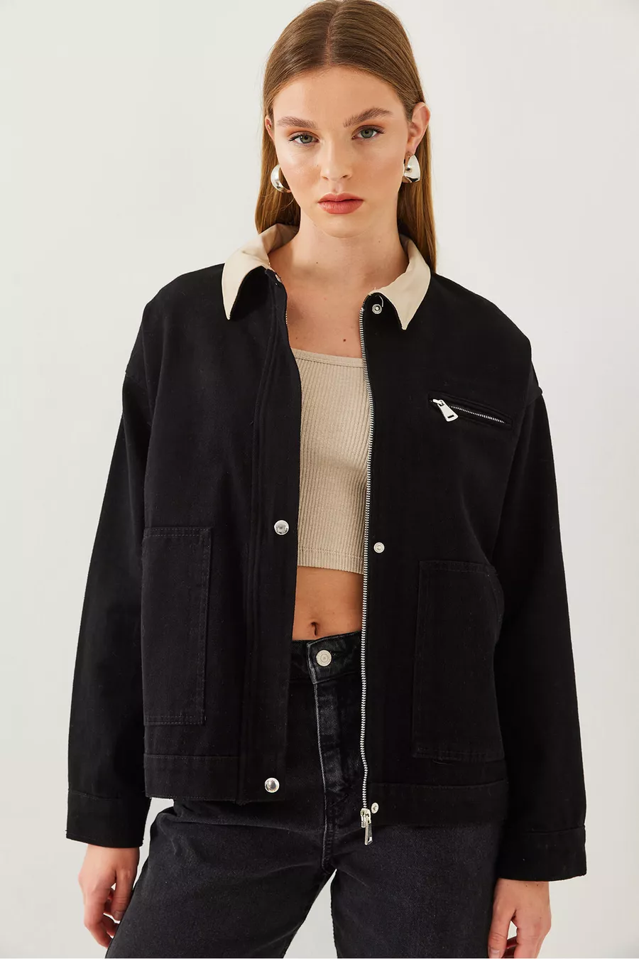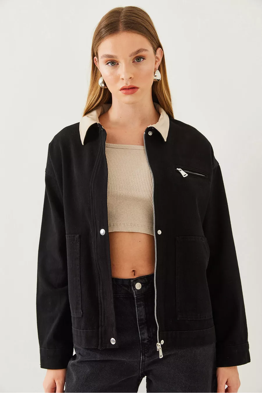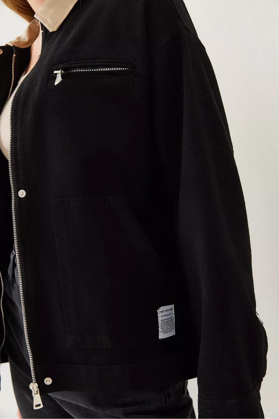 Sleeve Type: Long Sleeve Pattern: Solid Fit: Regular Collar Type: Blazer Collar Material: Cotton Fabric Type: Woven Color: Black Closure Type: Zipper Pocket: No Pockets Sleeve Length: Long Lining: Unlined Length: Regular Silhouette: Basic Occasion: Casual/Daily Weave Type: Gabardine Sustainability Detail: No Belt/Strap: Without Belt Product Type: Solid Material Composition: 95% Cotton, 5% Polyester Washing Instructions: Type 2 Origin: TR