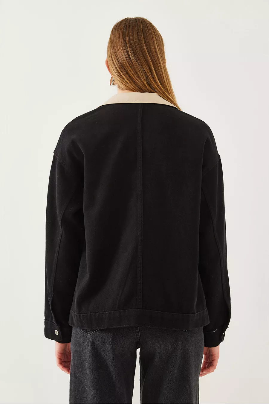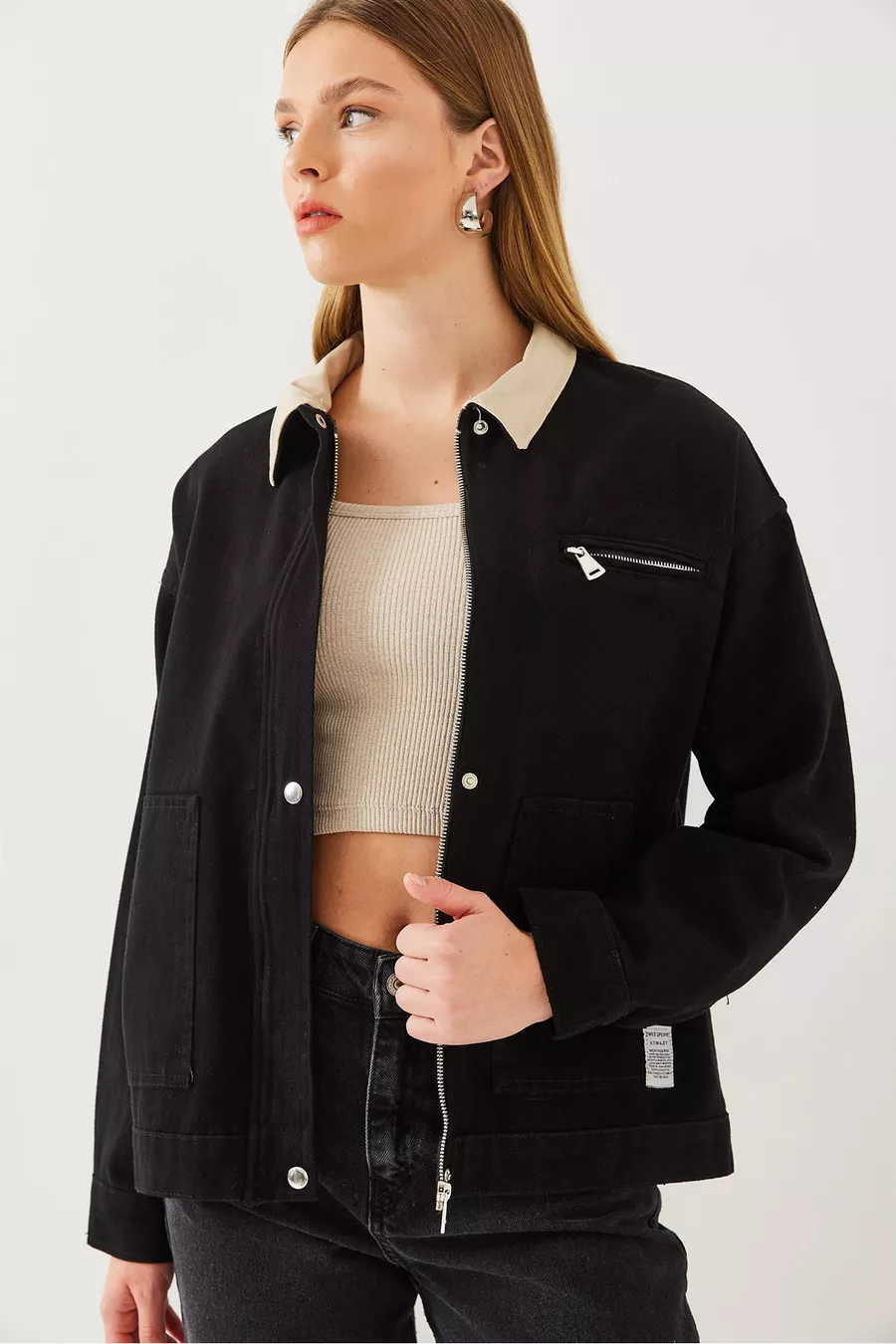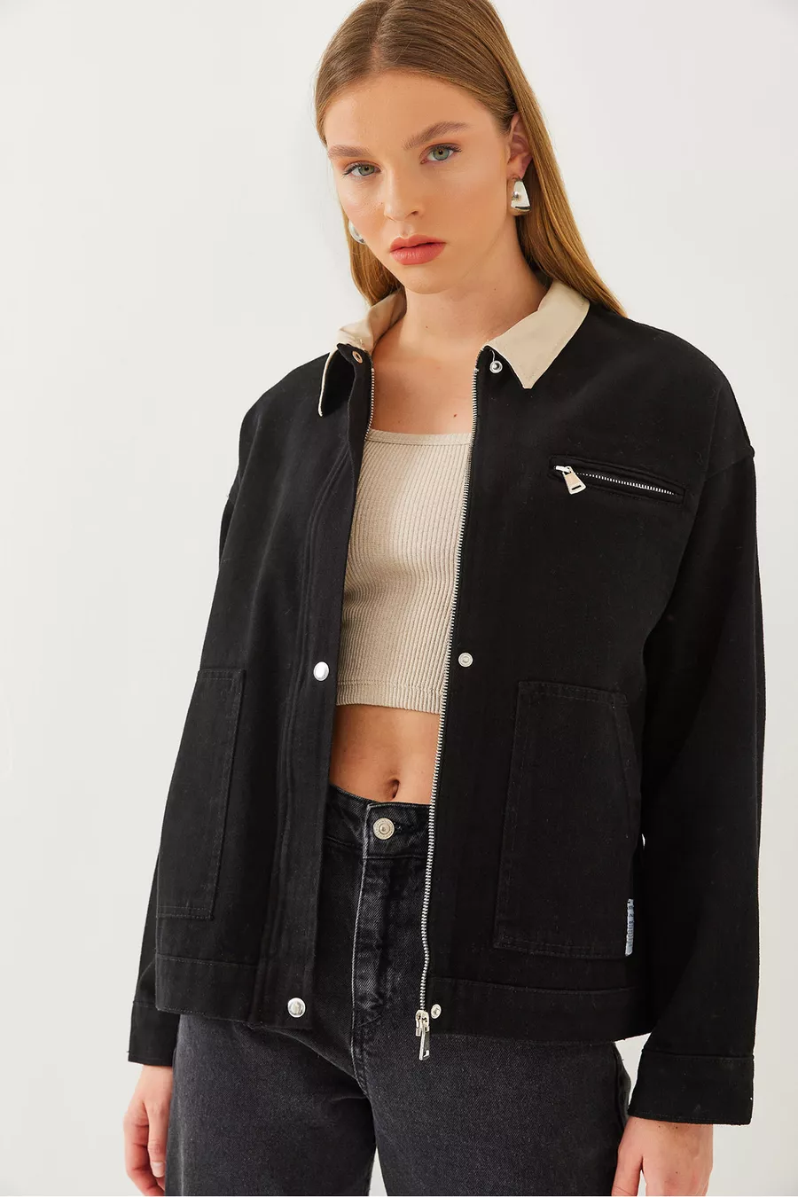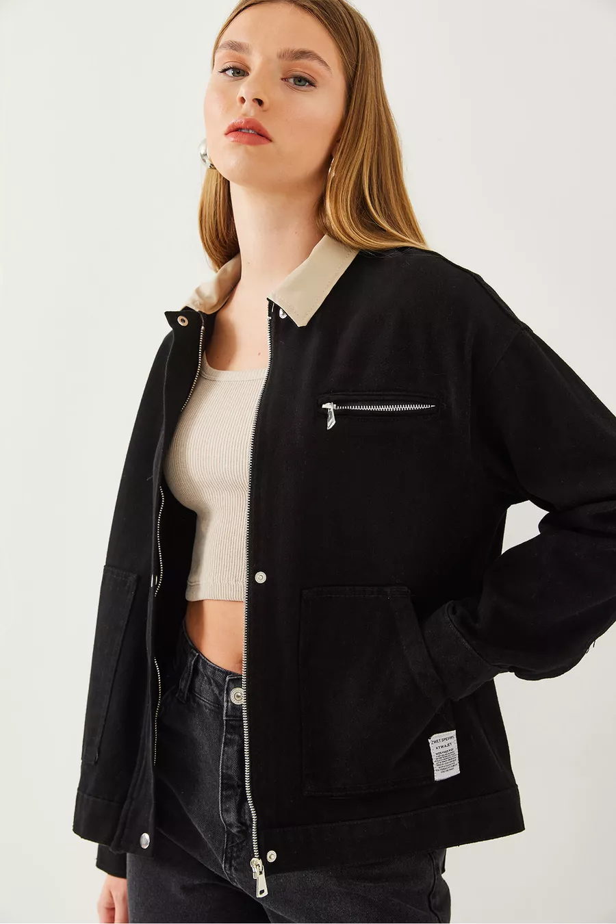Sleeve Type: Long Sleeve Pattern: Solid Fit: Regular Collar Type: Blazer Collar Material: Cotton Fabric Type: Woven Color: Black Closure Type: Zipper Pocket: No Pockets Sleeve Length: Long Lining: Unlined Length: Regular Silhouette: Basic Occasion: Casual/Daily Weave Type: Gabardine Sustainability Detail: No Belt/Strap: Without Belt Product Type: Solid Material Composition: 95% Cotton, 5% Polyester Washing Instructions: Type 2 Origin: TR