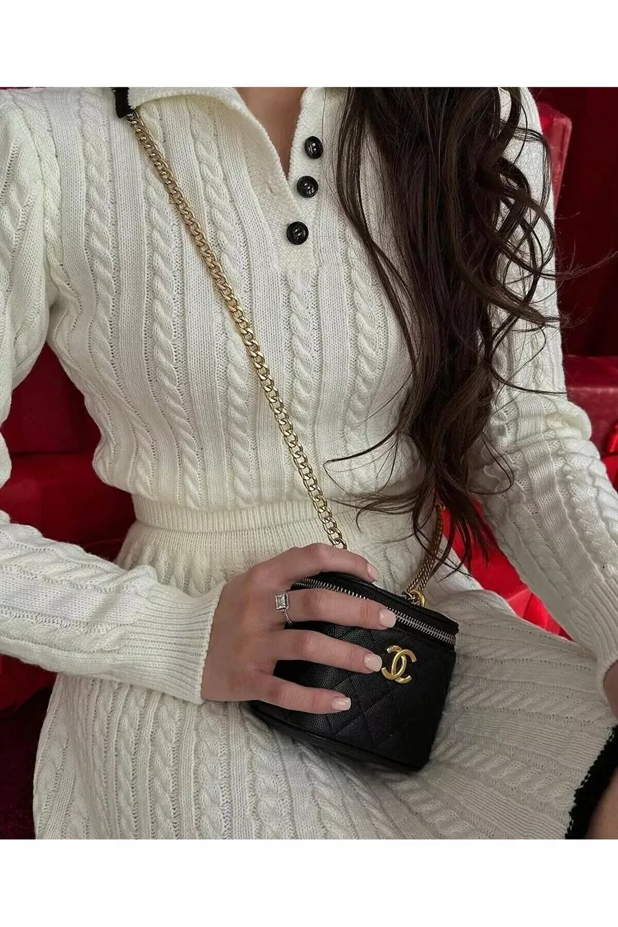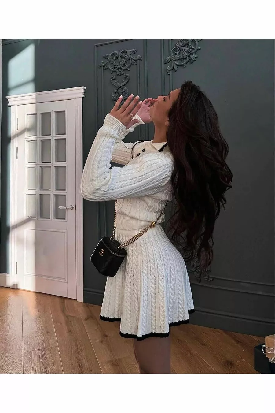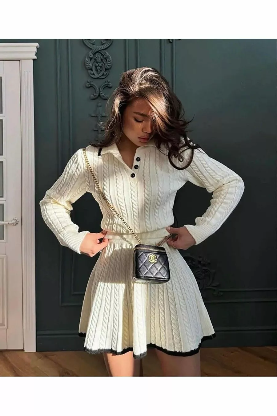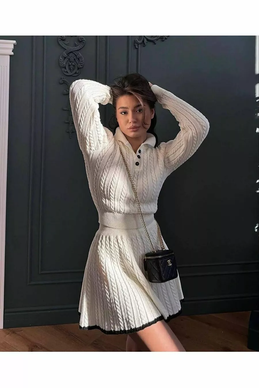 Fabric Type: Knit Material: Acrylic Pattern: Cable Knit Fit: Oversize Neck Type: Polo Neck Color: Ecru Product Detail: Pleated Pocket: Without Pockets Product Type: Plain Sleeve Length: Long Sleeve Type: Standard Sleeve Thickness: Thick Waist: Regular Waist Leg Type: Wide Leg Silhouette: Regular Occasion: Casual/Daily Length: Regular Set Type: Sweater and Skirt Additional Feature: Elastic Waist Weave Type: Knitted Persona: Feminine Belt/Strap Status: Without Belt Print/Embroidery Technique: No Print Number of Pieces: 2 Lining Status: Unlined Sustainability Detail: Yes Material Composition: 100% Acrylic/Cotton Washing Instructions: T100 Package Contents: 2 pieces Season: All Seasons Origin: TR