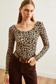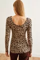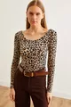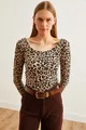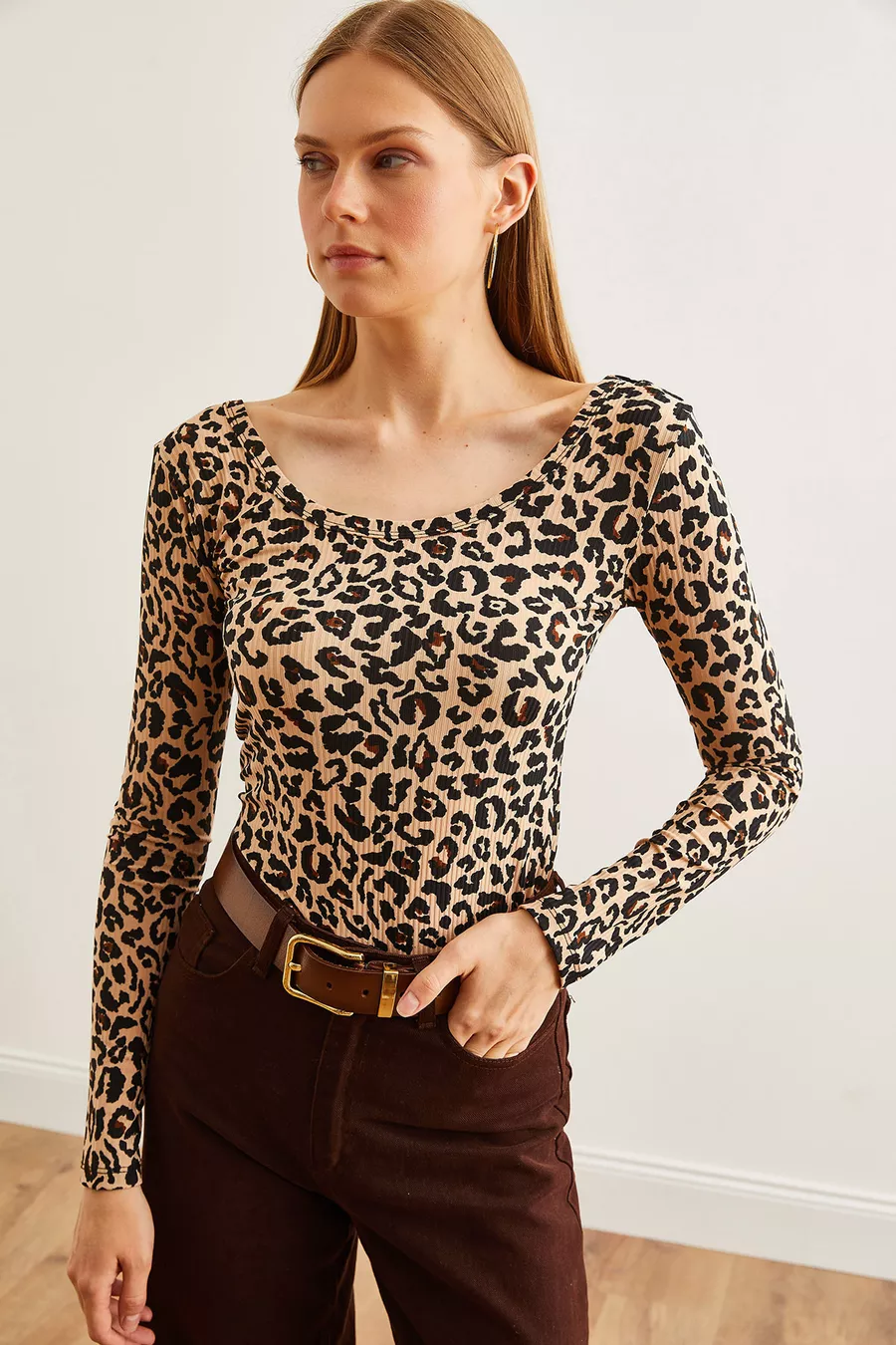Women's Leopard Beige Wide Collar Ribbed Blouse