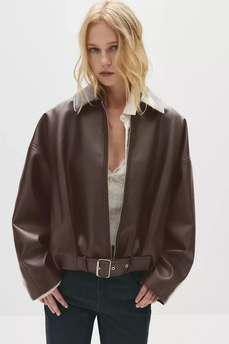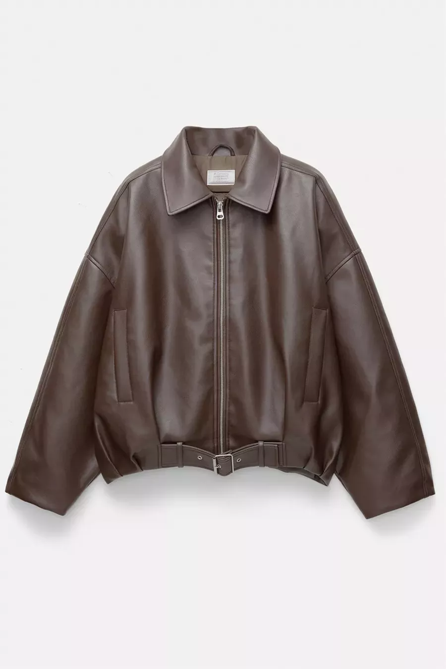 Sleeve Type: Long Sleeve Pattern: Plain Fit: Oversize Collar Type: Stand Collar Material: Faux Leather Fabric Type: Faux Leather Color: Brown Closure Type: Zippered Product Detail: Buckled Pocket: Double Pockets Sleeve Length: Long Collection: Casual / Everyday Thickness: Medium Lining: Lined Length: Regular Silhouette: Bomber Occasion: Casual / Everyday Additional Feature: Windproof Weave Type: Faux Leather Sustainability Detail: No Persona: Cool & Comfort Belt/Strap Feature: With Belt Product Type: Plain Material Composition: Faux Leather Washing Instructions: Dry Clean Season: Spring / Autumn Origin: TR Box Condition: No Box