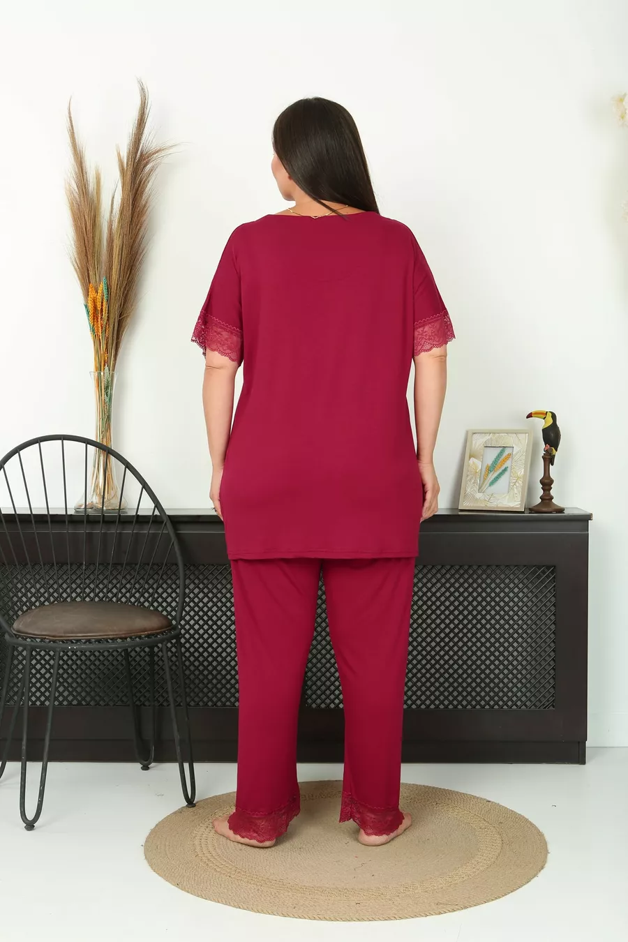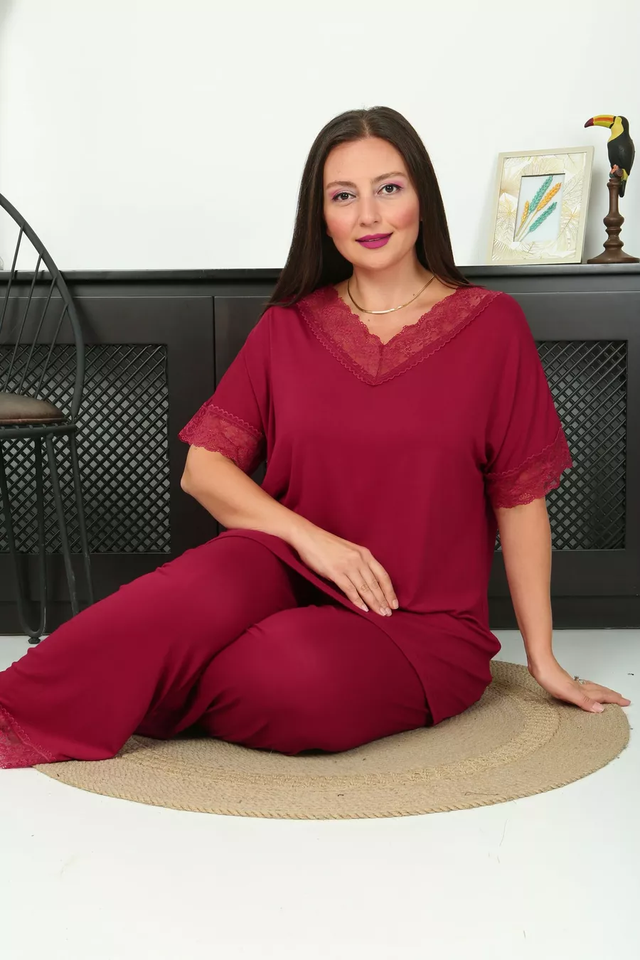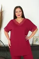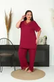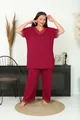Additional Feature: Stretchy Color: Burgundy Sleeve Type: Short Sleeve Pattern: Solid Neck Type: V-Neck Pant Length: Long Material: Viscose Fit: Plus Size Fabric Type: Knit Occasion: Homewear Sustainability Detail: No Silhouette: Long Sleeve Length: Short Weave Type: Polyviscose Waist: Regular Waist Top-Bottom Set: Tunic with Pants Persona: Young Material Composition: COTTON VISCOSE Number of Pieces: 2 Pieces Washing Instructions: 30 DEGREES Pant Type: Wide Leg Collection: Plus Size Package Contents: 2 pcs Length: Long Season: All Seasons Origin: TR