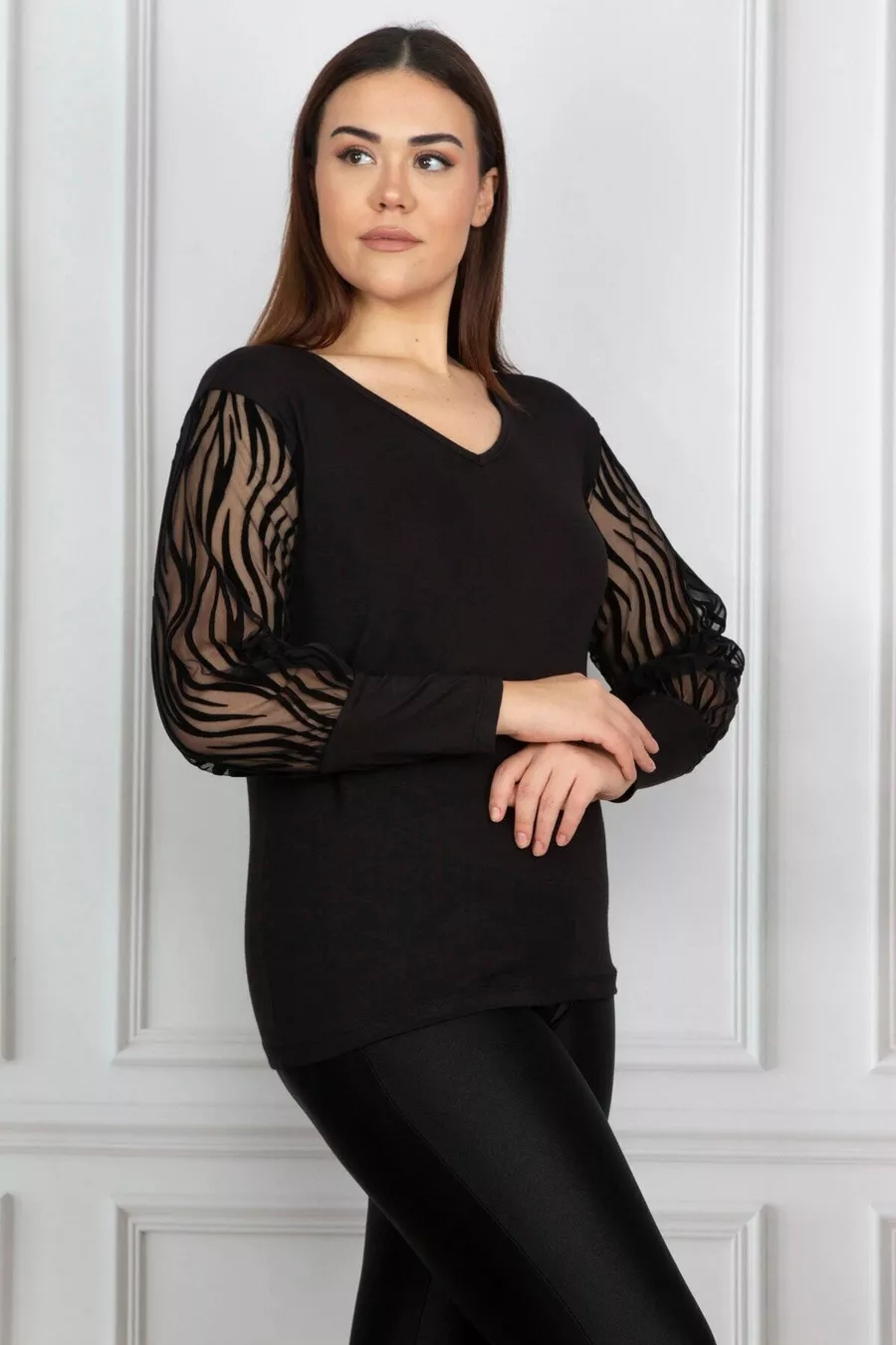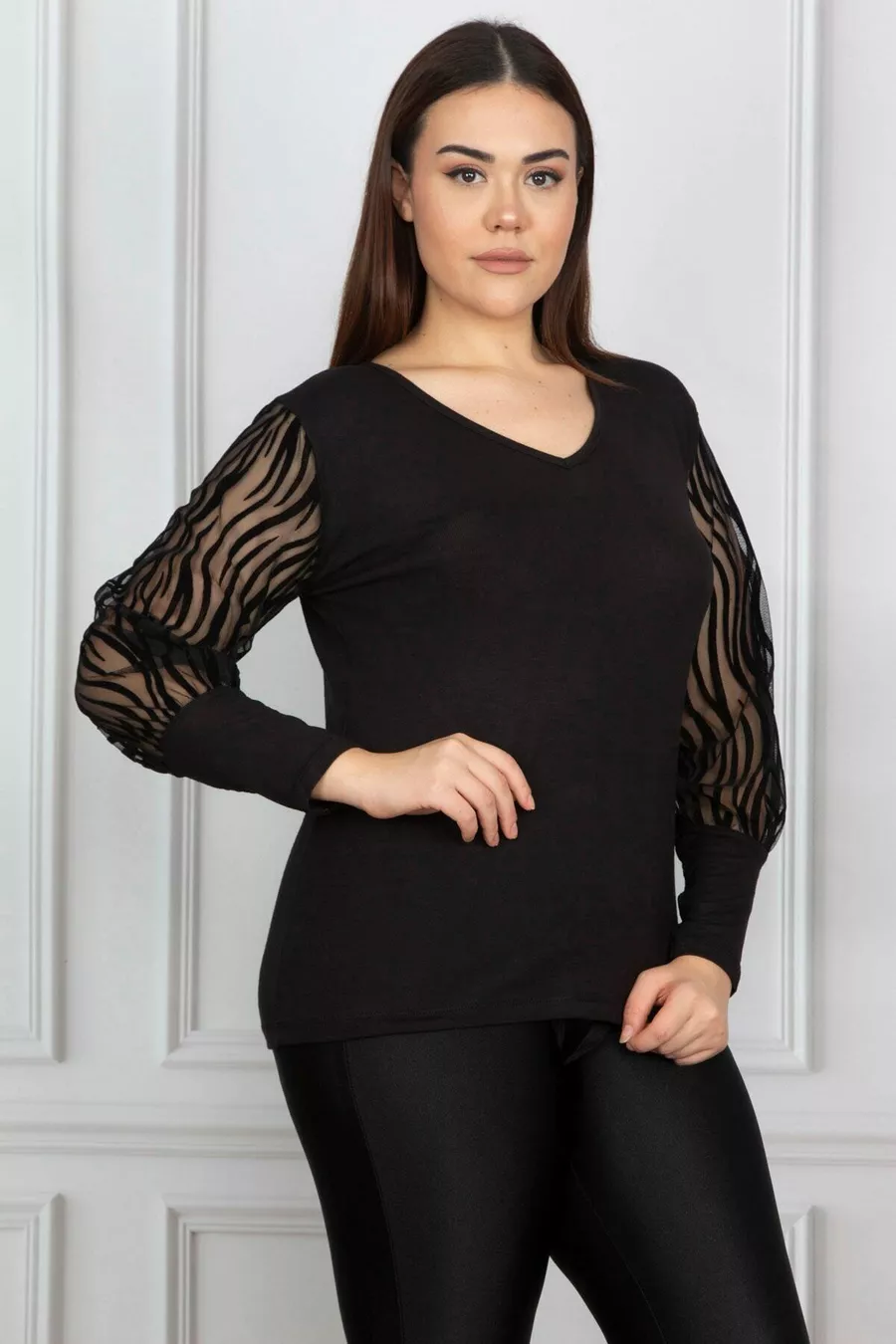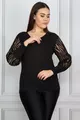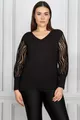 Women's Plus Size Black Flocked Sleeve Tulle Blouse