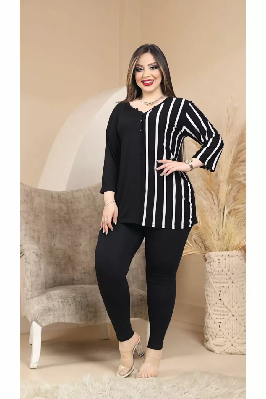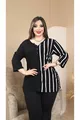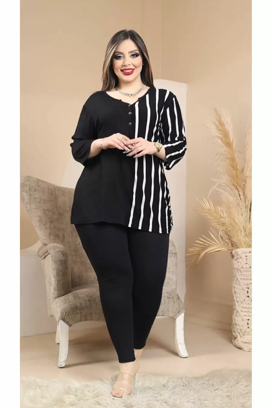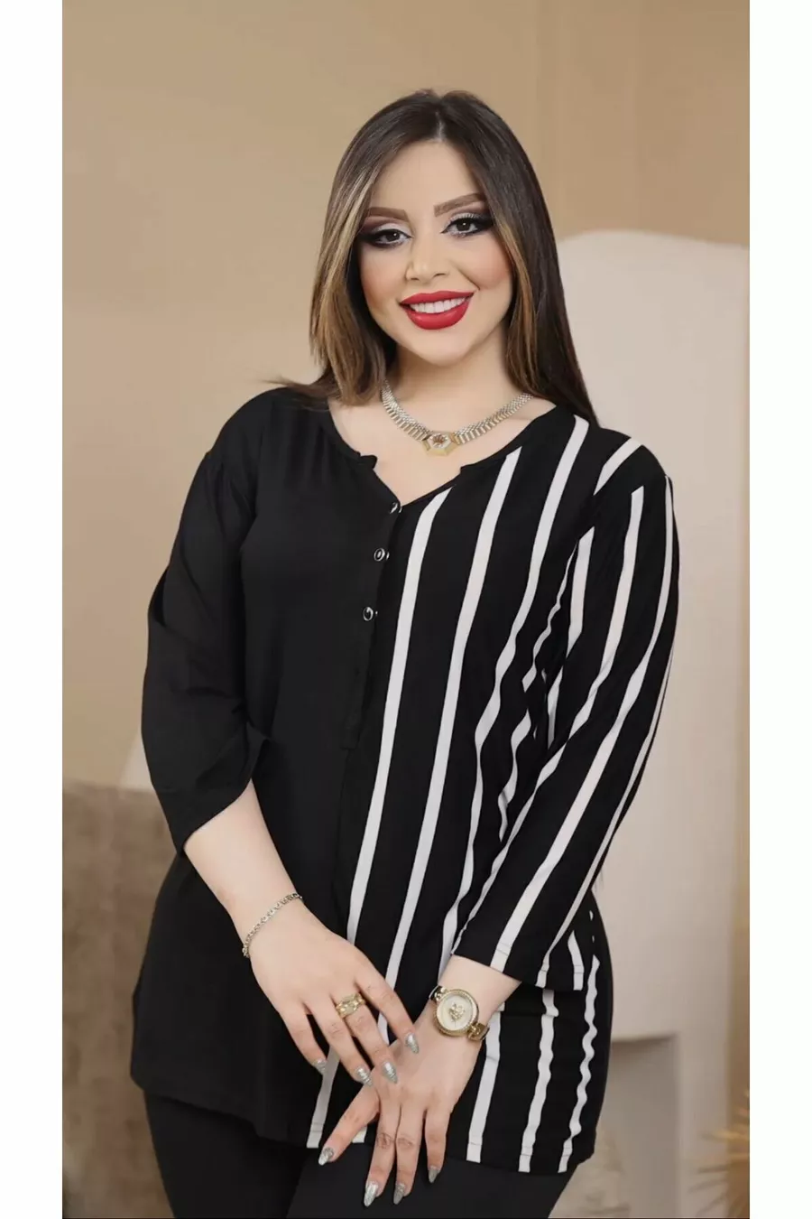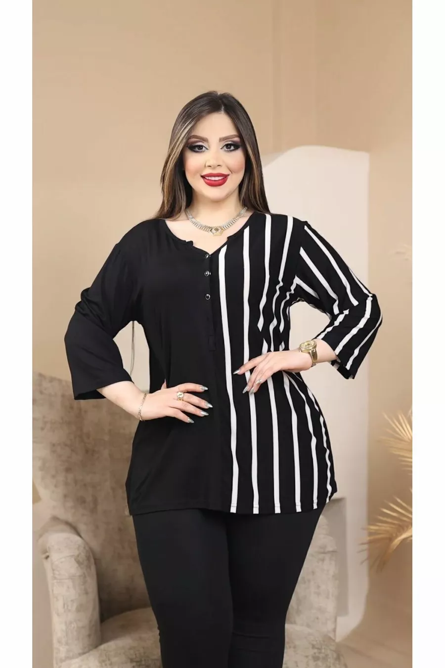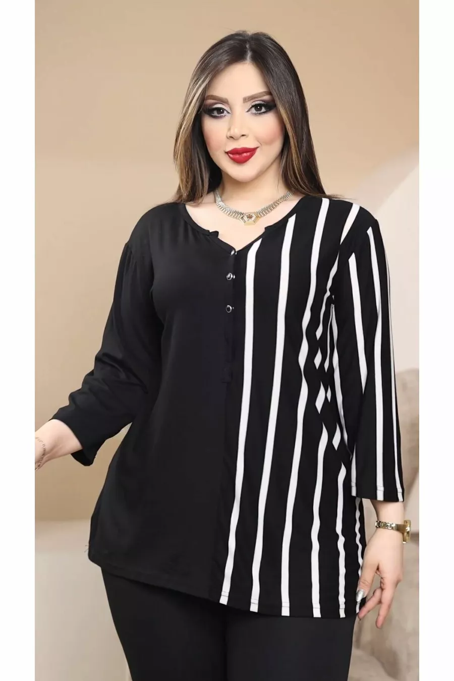 Pattern: Striped Fit: Plus Size Neck Type: Crew Neck Fabric Type: Woven Material: Viscose Sleeve Type: Turn-up Sleeve Color: Black Occasion: Casual/Everyday Length: Standard Sleeve Length: Turn-up Sleeve Print/Embroidery Technique: Plain Additional Feature: Stretchy Pockets: None Belt/Waistband: Without Belt Sustainability Detail: No Silhouette: Basic Thickness: Thin Washing Instructions: T09 Collection: Plus Size Package Contents: Single
