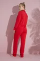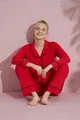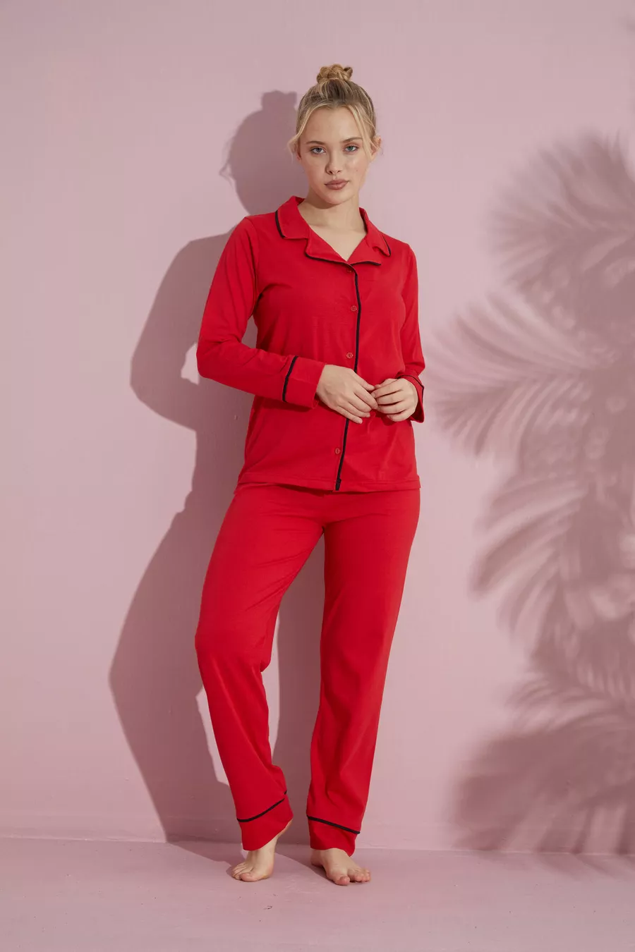 Women's Red Long-Sleeve Cotton Buttoned Piped Pajama Set