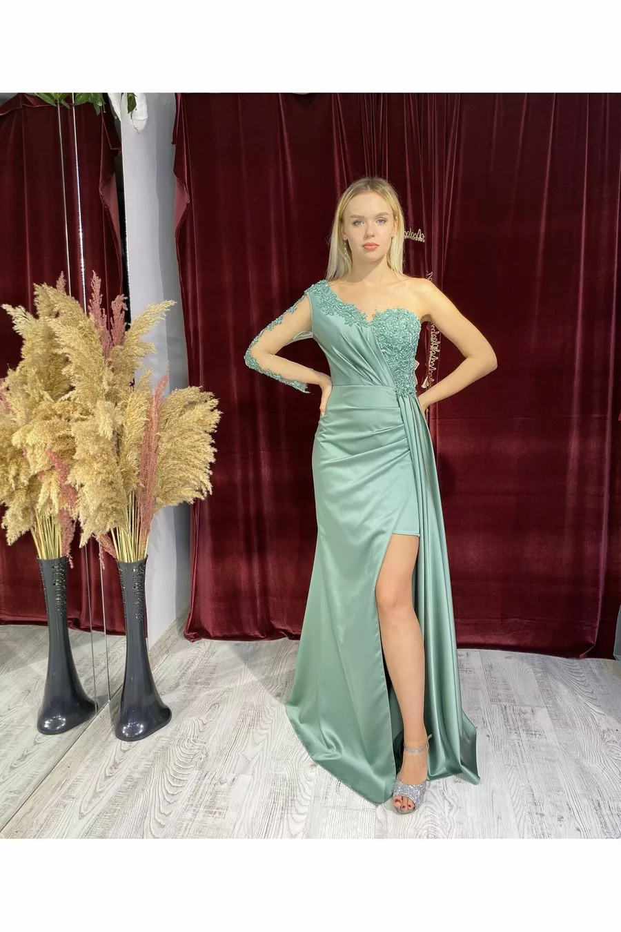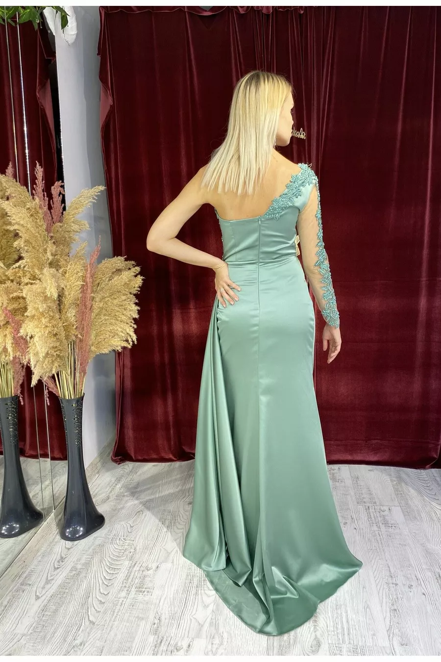 This product will be sent by \xa0 Eren Evening Dress\xa0. More than 10 stocks are offered to be sold at the campaign price. The seller determines the sales price of the product you have examined. A product can be sold by more than one seller. The sellers of the products offered for sale by more than one seller are ranked according to the price they set for the product, the seller ratings, the delivery status, the promotions in the products, whether the shipping is free or not, and whether the products can be delivered with fast delivery, the stock and categories of the products. A maximum of \xa05 pieces of this product can be ordered.\Queenmadam reserves the right to cancel orders over xa05.\xa0This limit is not valid for corporate orders, and different limits can be set for corporate orders. Free returns within 15 days. Click \xa0 for more information. Single Sleeve Beaded Deep Slit Satin Evening Dress