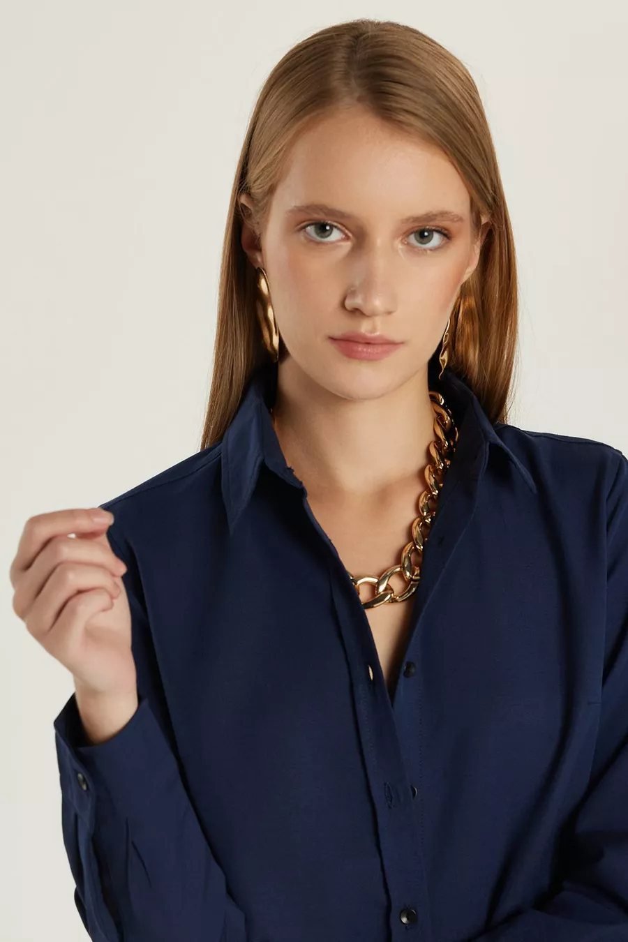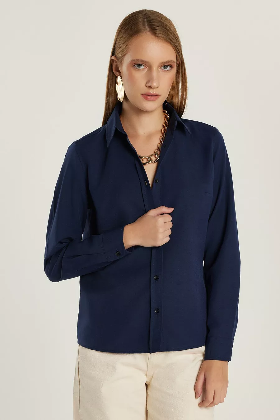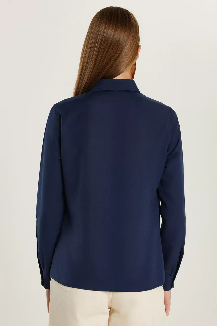 Women's Slim Fit Fitted Long Sleeve Cotton Textured Navy Basic Shirt