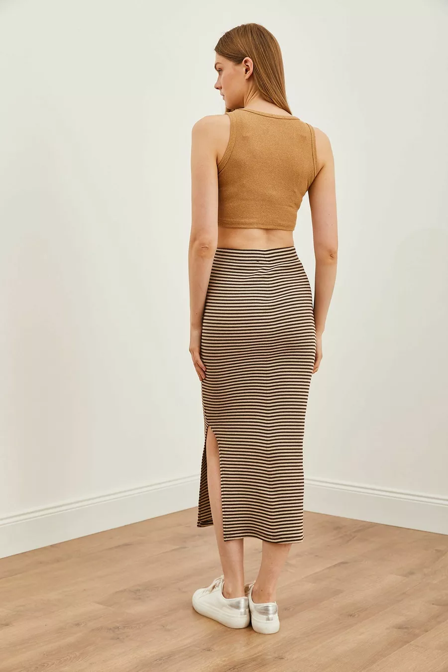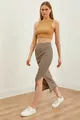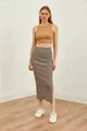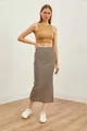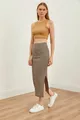 Women's Stone Brown Slit Striped Lycra Midi Skirt