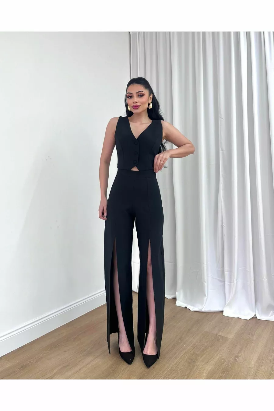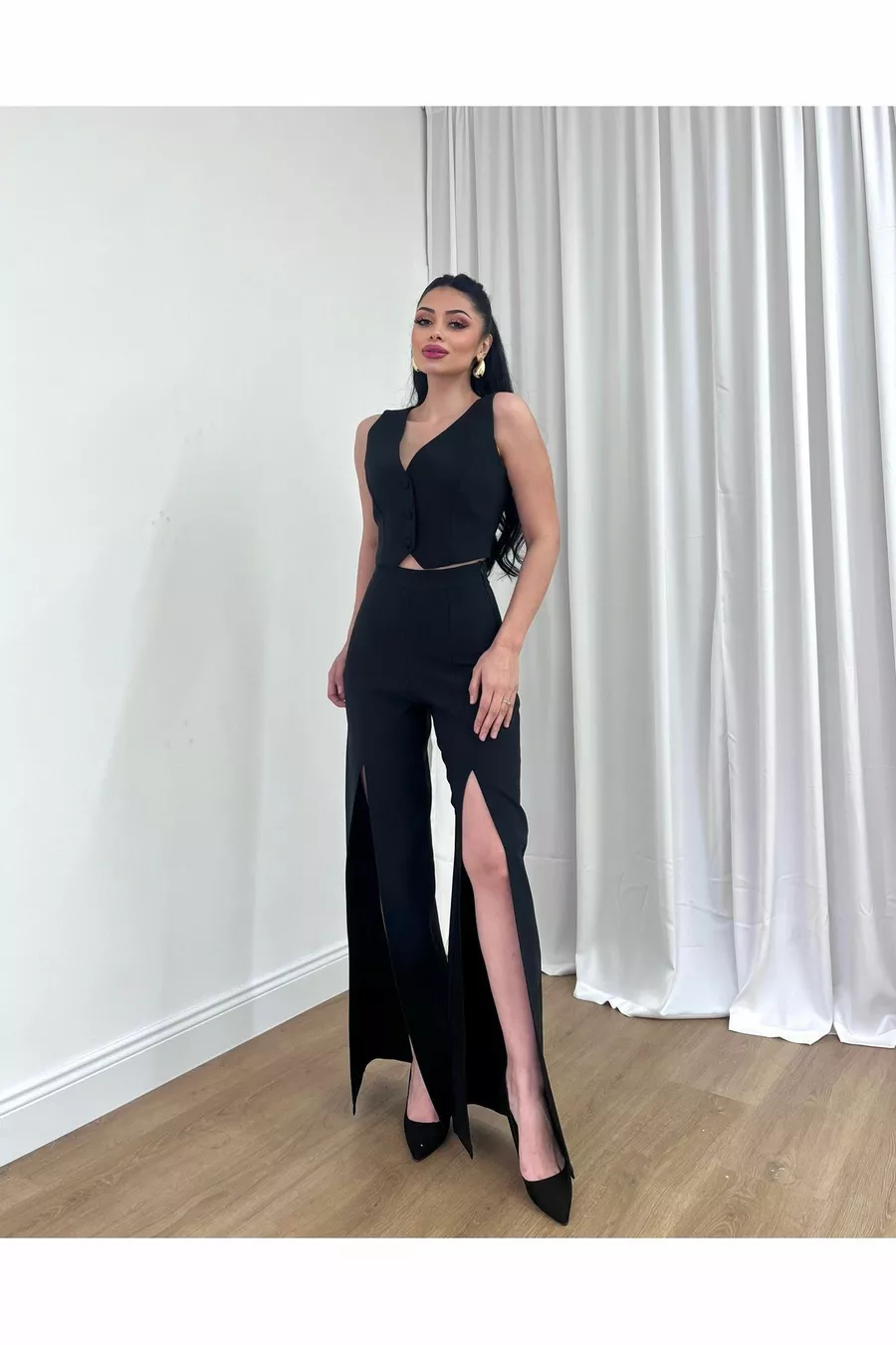 This product will be shipped by \xa0 Misscix Fashion\xa0. There are less than 5 stocks to be sold at the campaign price. The seller determines the sales price of the product you have examined. A product can be sold by more than one seller. The sellers of the products offered for sale by more than one seller are ranked according to the price they set for the product, the seller ratings, the delivery status, the promotions in the products, whether the shipping is free or not, and whether the products can be delivered with fast delivery, the stock and categories of the products. A maximum of \xa010 pieces of this product can be ordered.\xa010 units can be ordered by Queenmadam.\xa0This limit is not valid for corporate orders, and different limits can be set for corporate orders. Free returns within 15 days. Click \xa0 for more information. "Vest Pants double Evening Dress Set is Full Fit. The vest part is buttoned at the front and has an adjustable belt at the back. It has a deep V and no sleeves. The trousers are High Waist and have a side zipper. The trousers are lined. The trousers are wide-legged and have a stylish slit detail at the front. The suit is slightly shiny and does not show inside. Pants Length: 110cm Size S Waist: 66cmHips: 96 cmVest Chest: 84cm Size M Waist: 70cmHips 100cmVest Chest: 88cm Size L Waist: 74cmHips 105cmVest Chest: 92cm The model in the picture is 1.68 meters tall, 52 kg and wears her own size S in the image. Suitable for the Spring Summer season. You can easily use it on stylish night outs, engagement, wedding, party, promgraduation, prom, cocktailbridesmaidnedime, corporate meetings and smart casual."