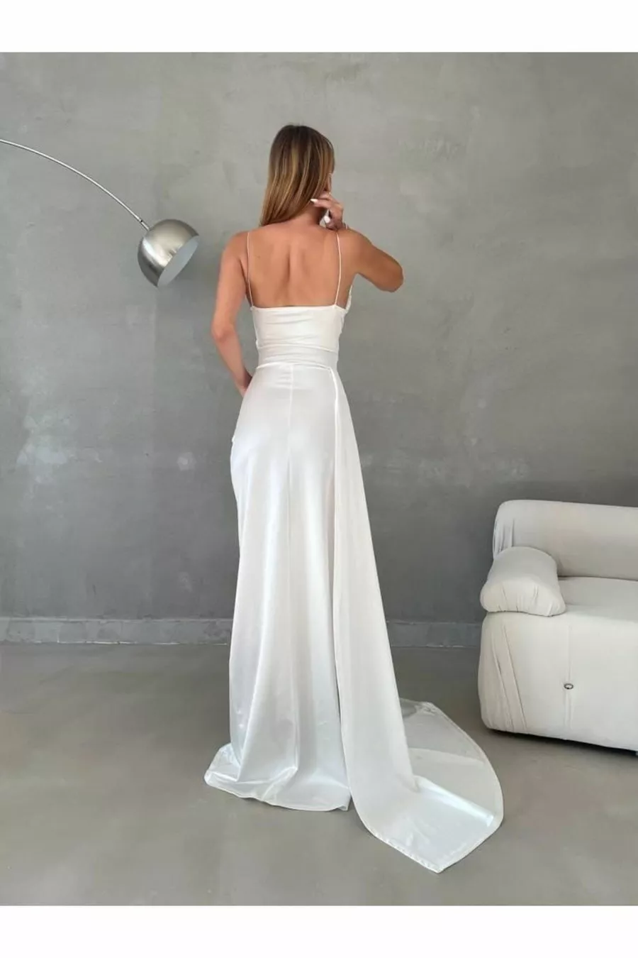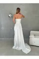 Women's White Strapless Degaje Collar Thin Strap Drape Detail Long Tail Slit Satin Evening Dress