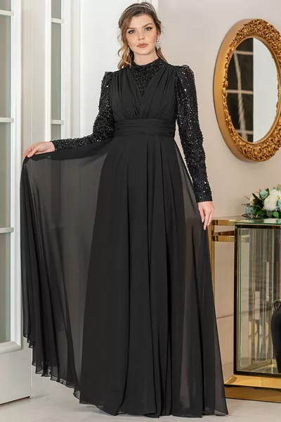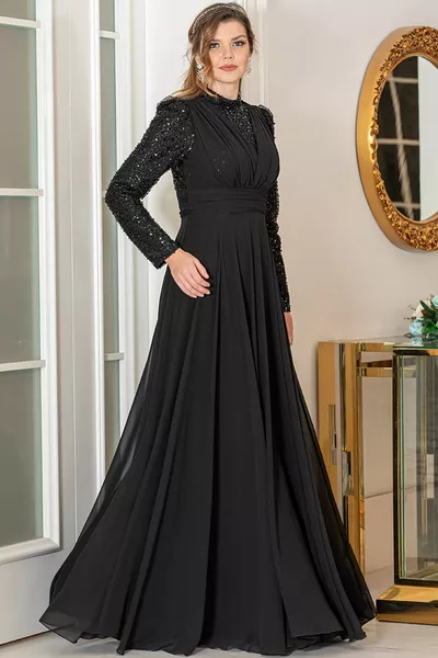 Women's Long Slit Rope Strap Front Pleated Evening Dress Engagement Henna Wedding Evening Dress Black