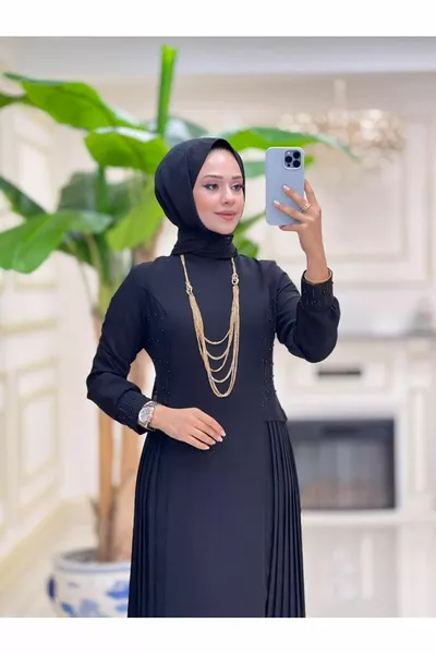 Chiffon Cape Belted Hijab Evening Dress - Black - Refka