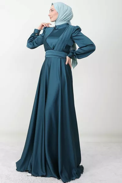 Shoulder Half Ruffle Detailed Belted Satin Evening Dress