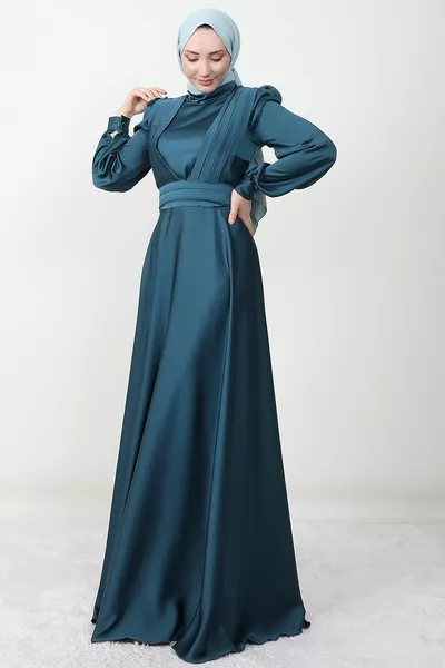 WOMEN'S GREEN (EMERALD) ARCHED STONE DETAILED EVENING DRESS T