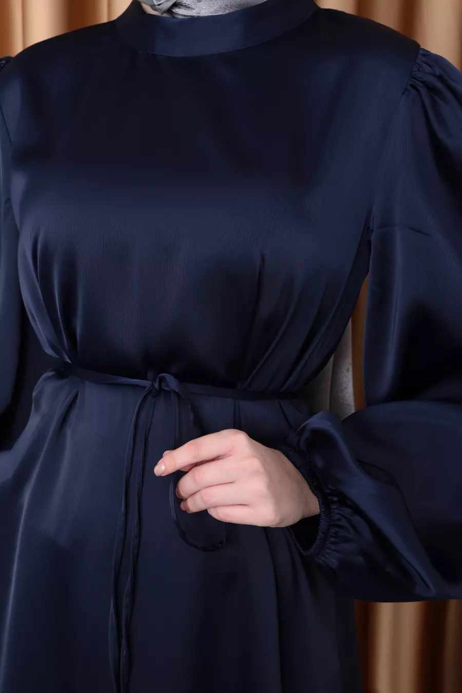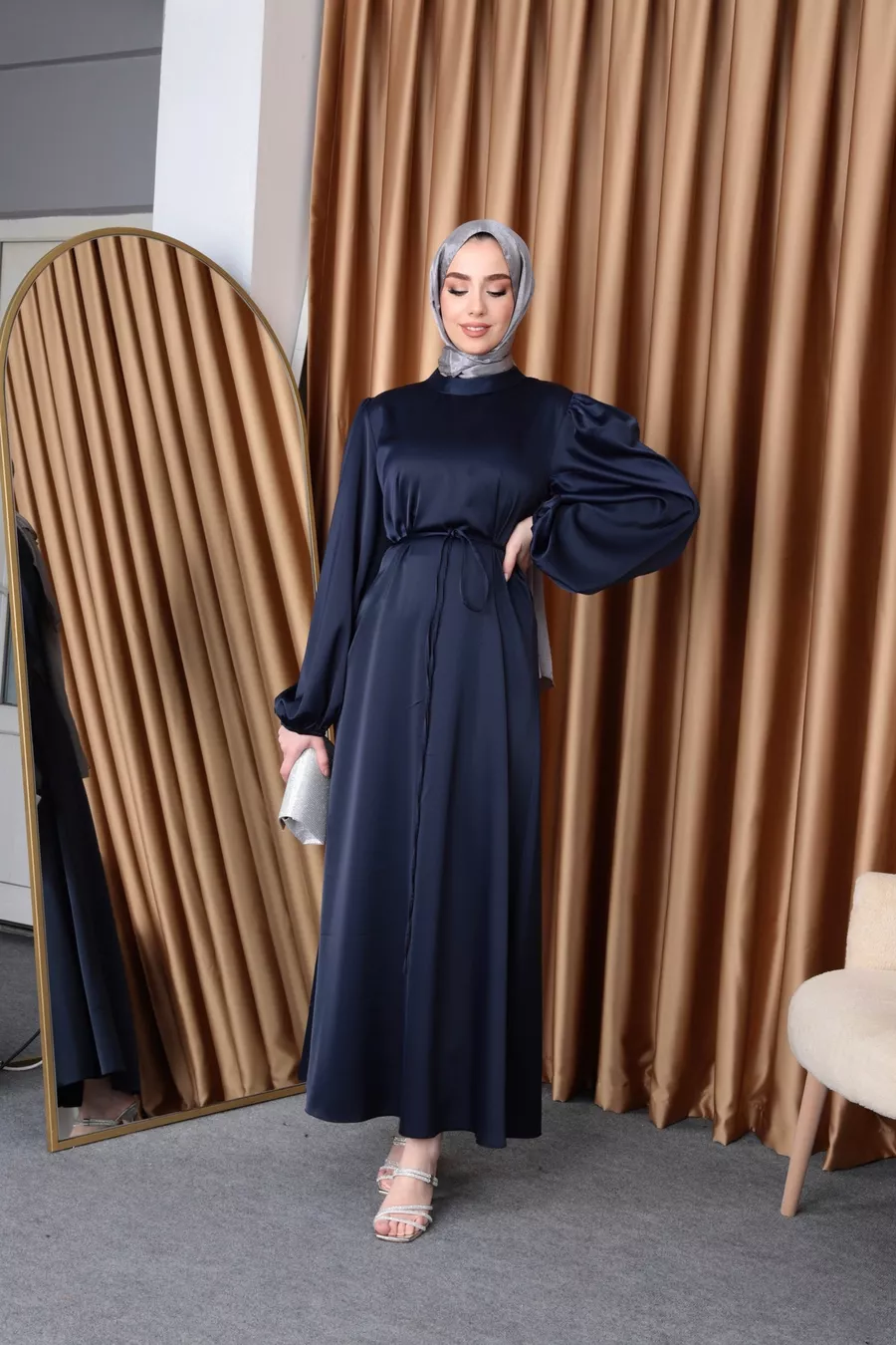 Abito Coprente Oversize in Raso con Maniche a Palloncino e Cintura