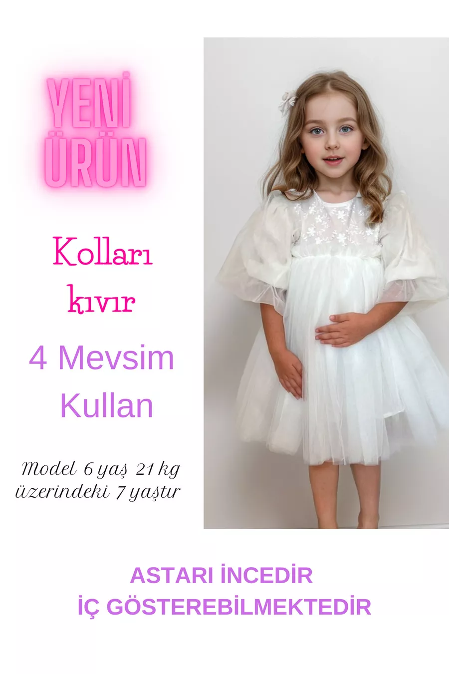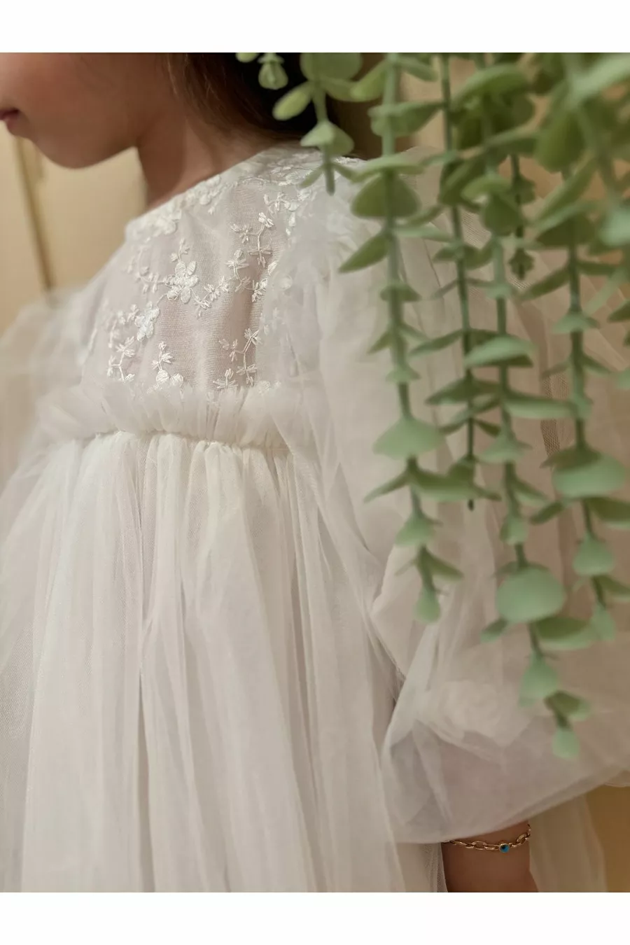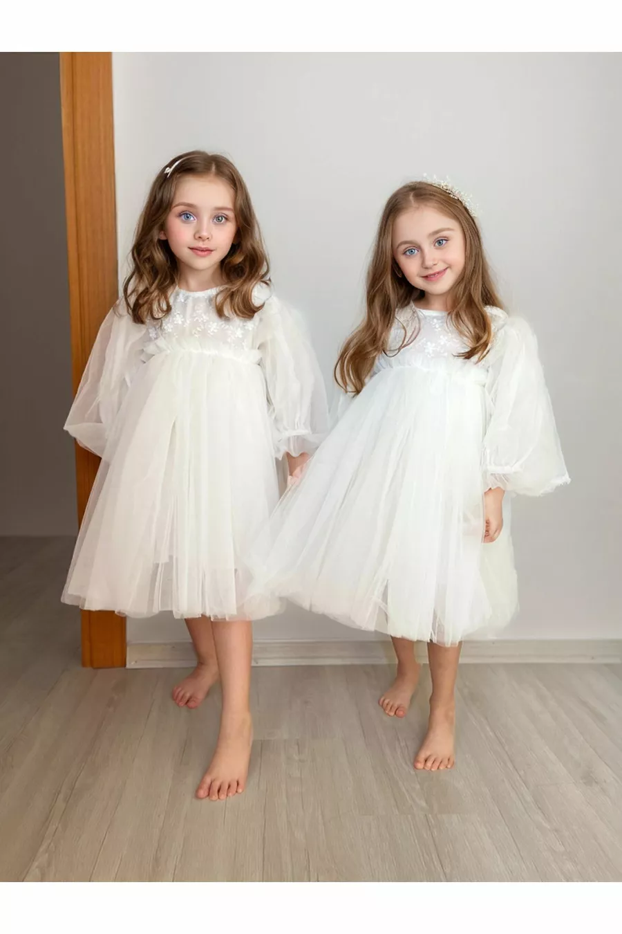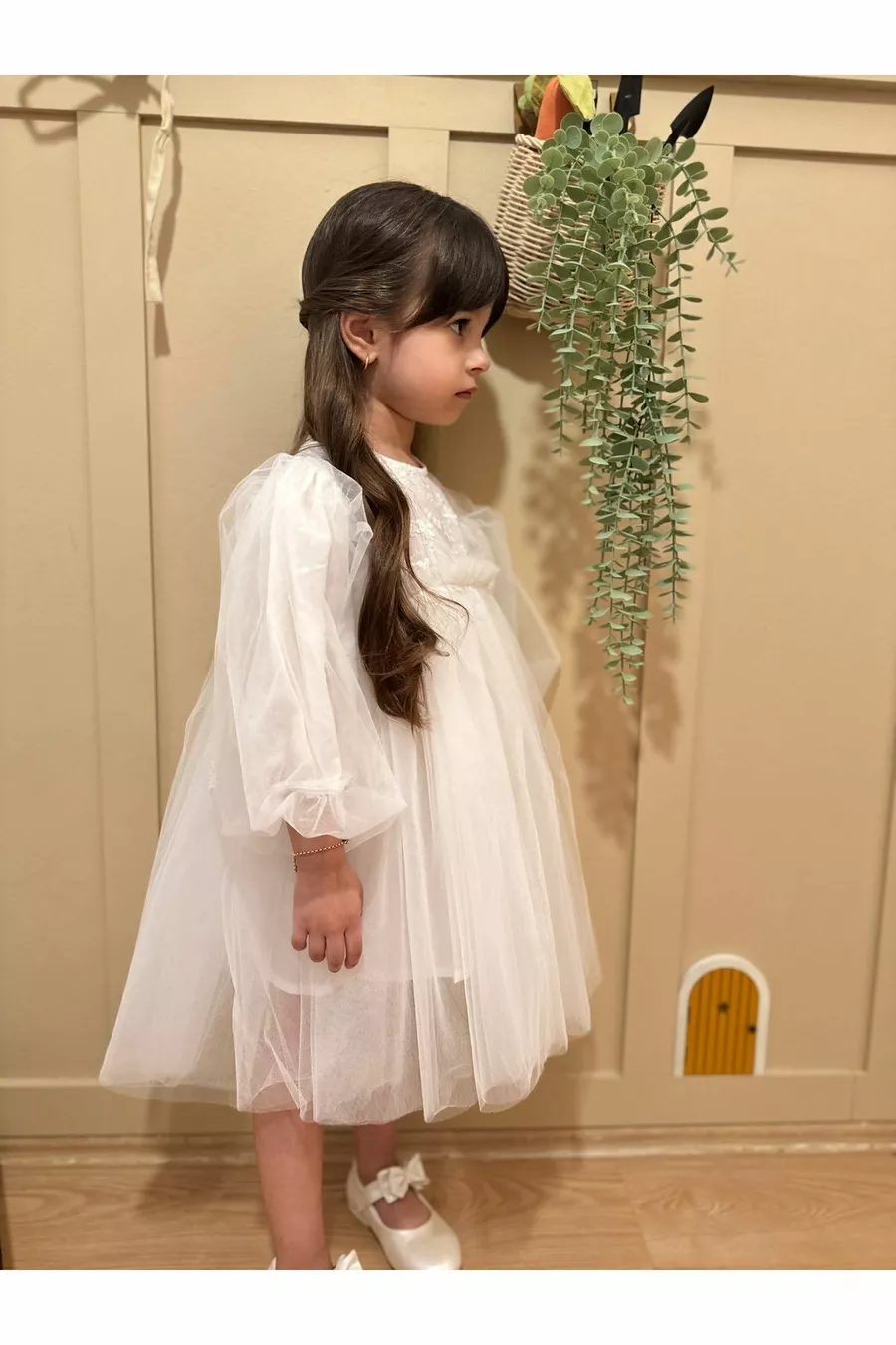 Abito da festa per bambina con maniche lunghe in tulle, batuffolo bianco, gonna a tutu