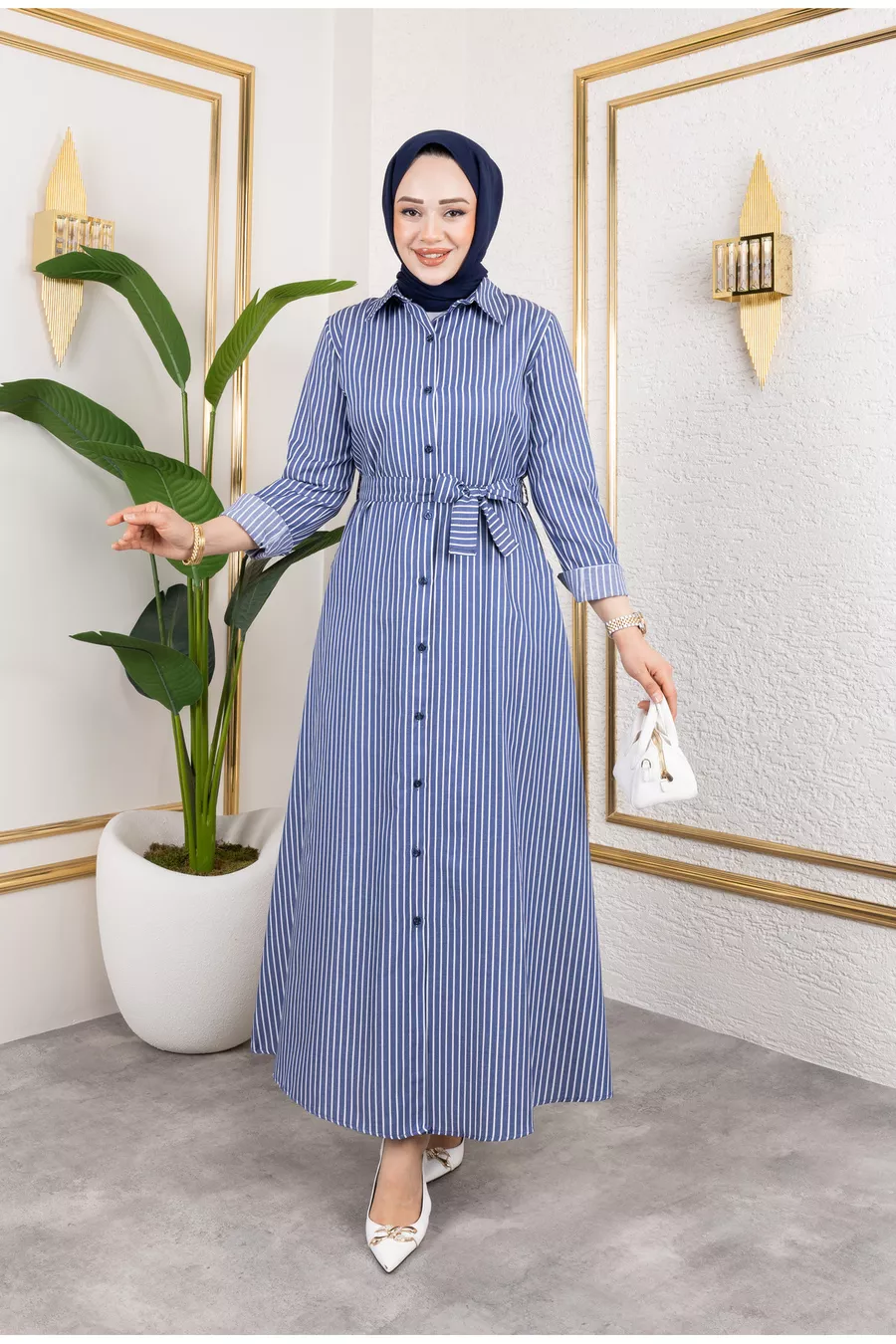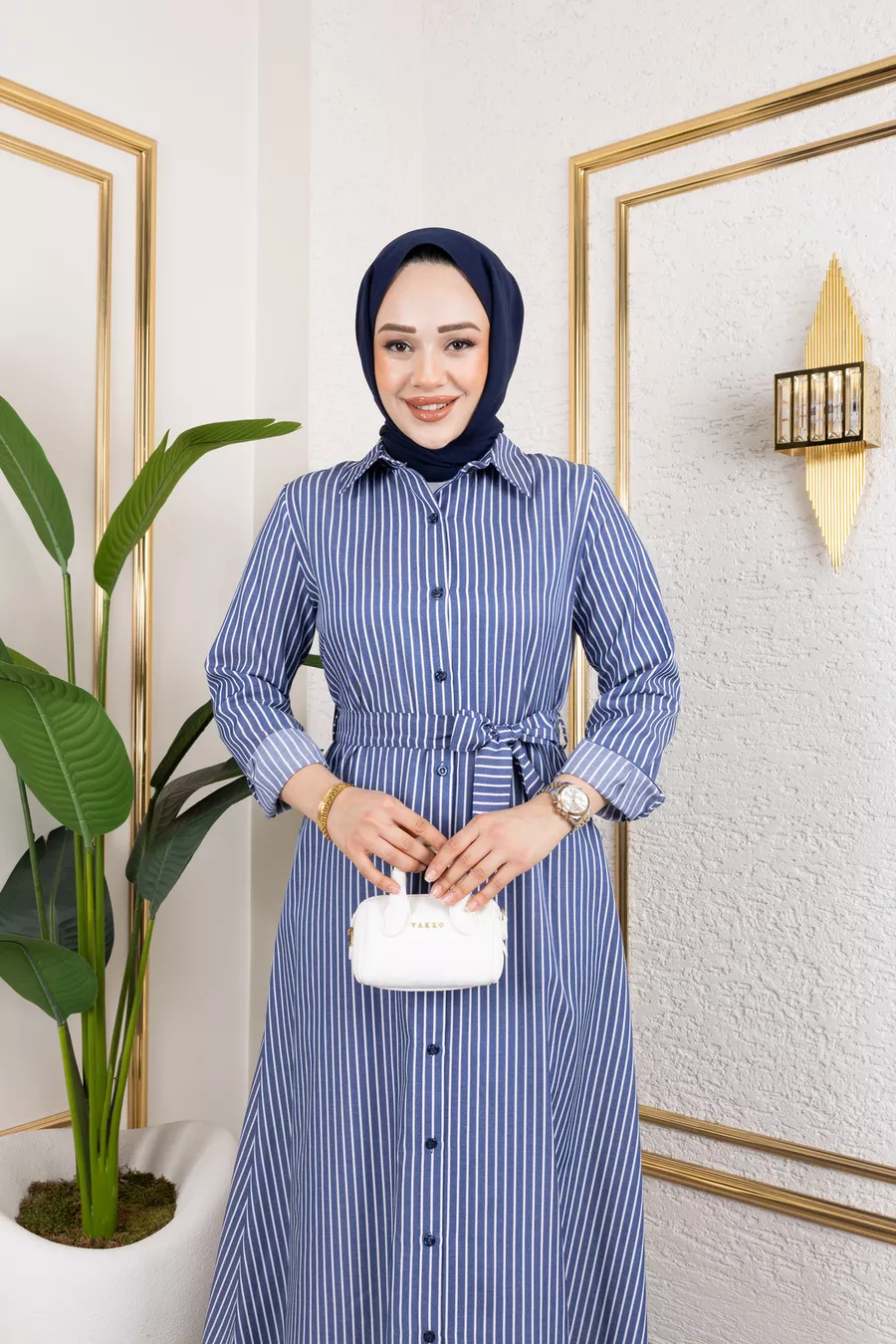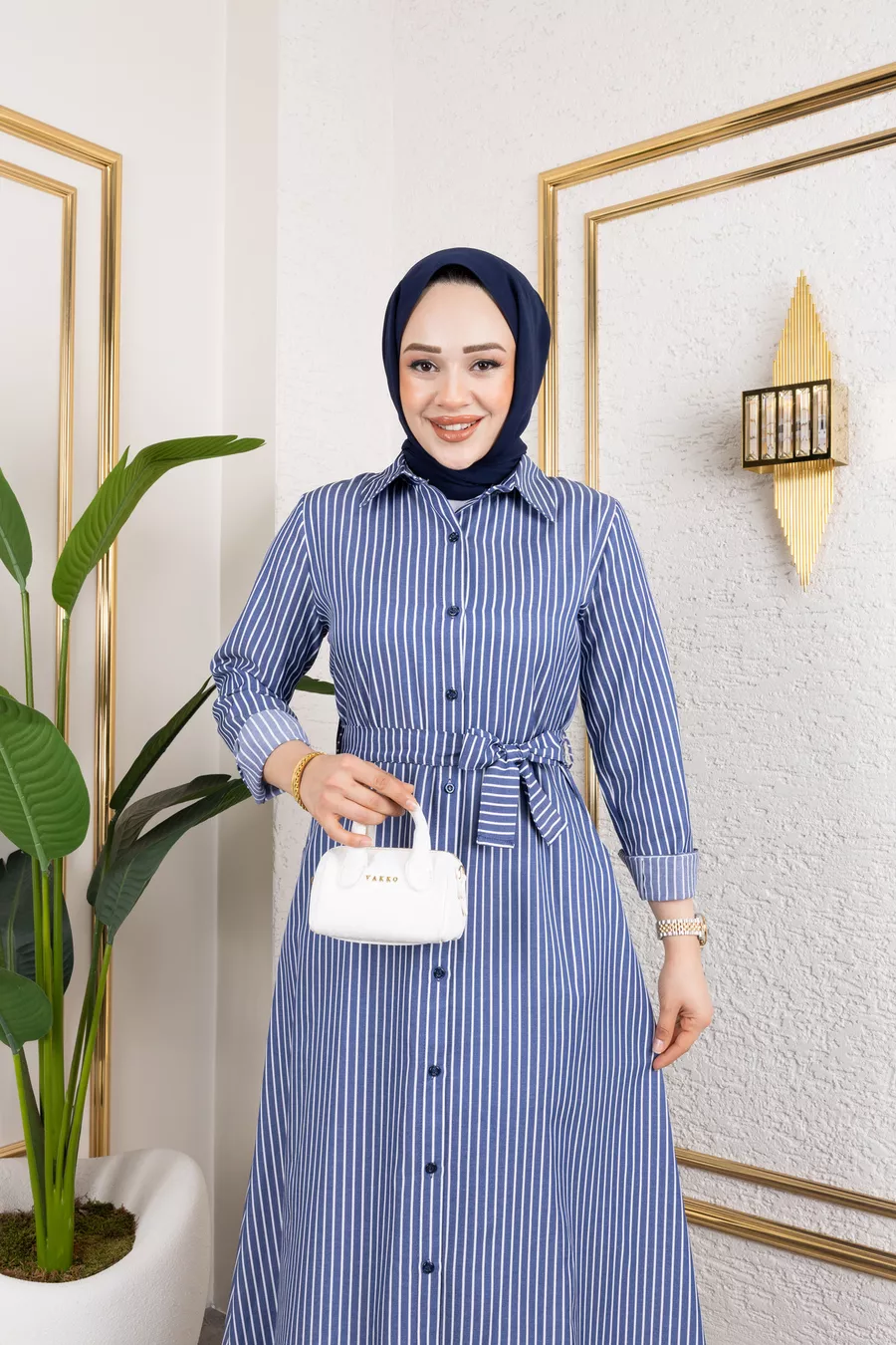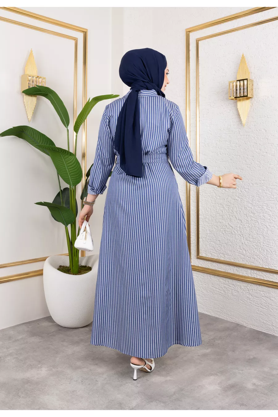 Abito da donna in satin blu lungo con righe bianche e cintura a fascia