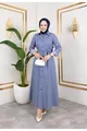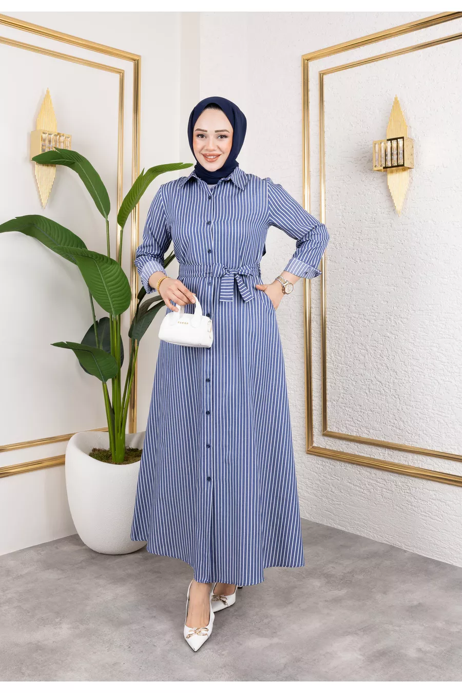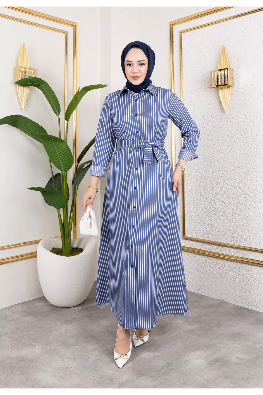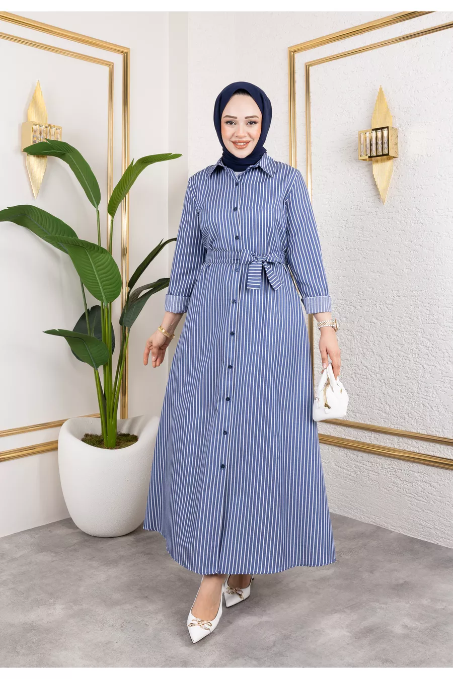 Abito da donna in satin blu lungo con righe bianche e cintura a fascia