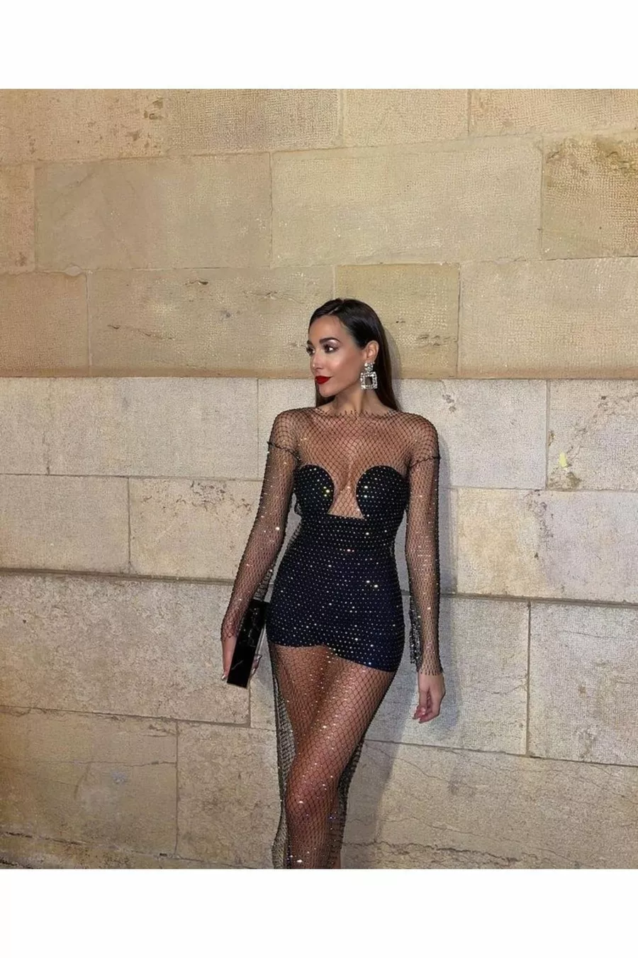 Abito da sera elegante da donna in rete con cristalli, maniche lunghe