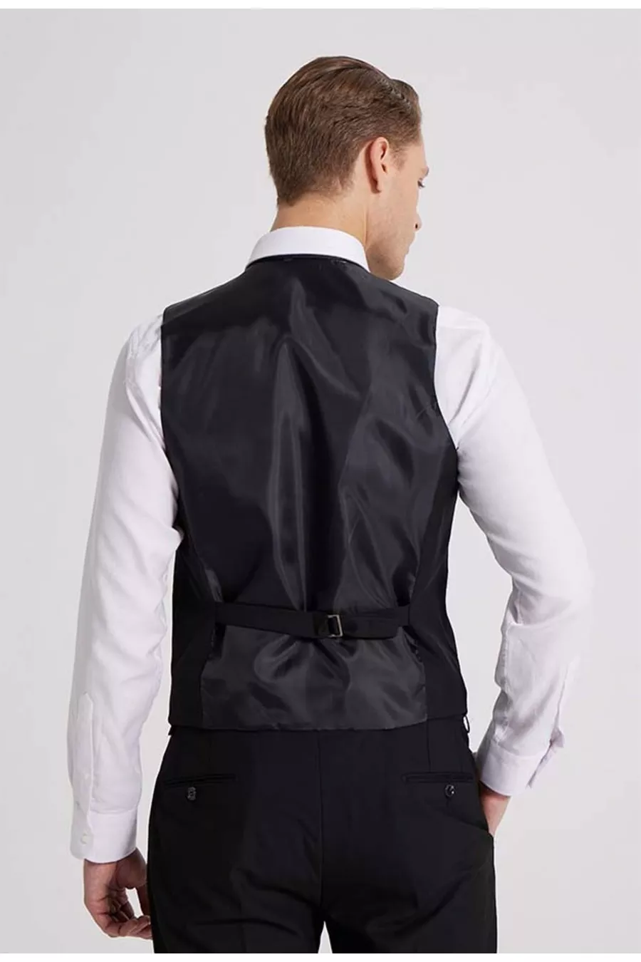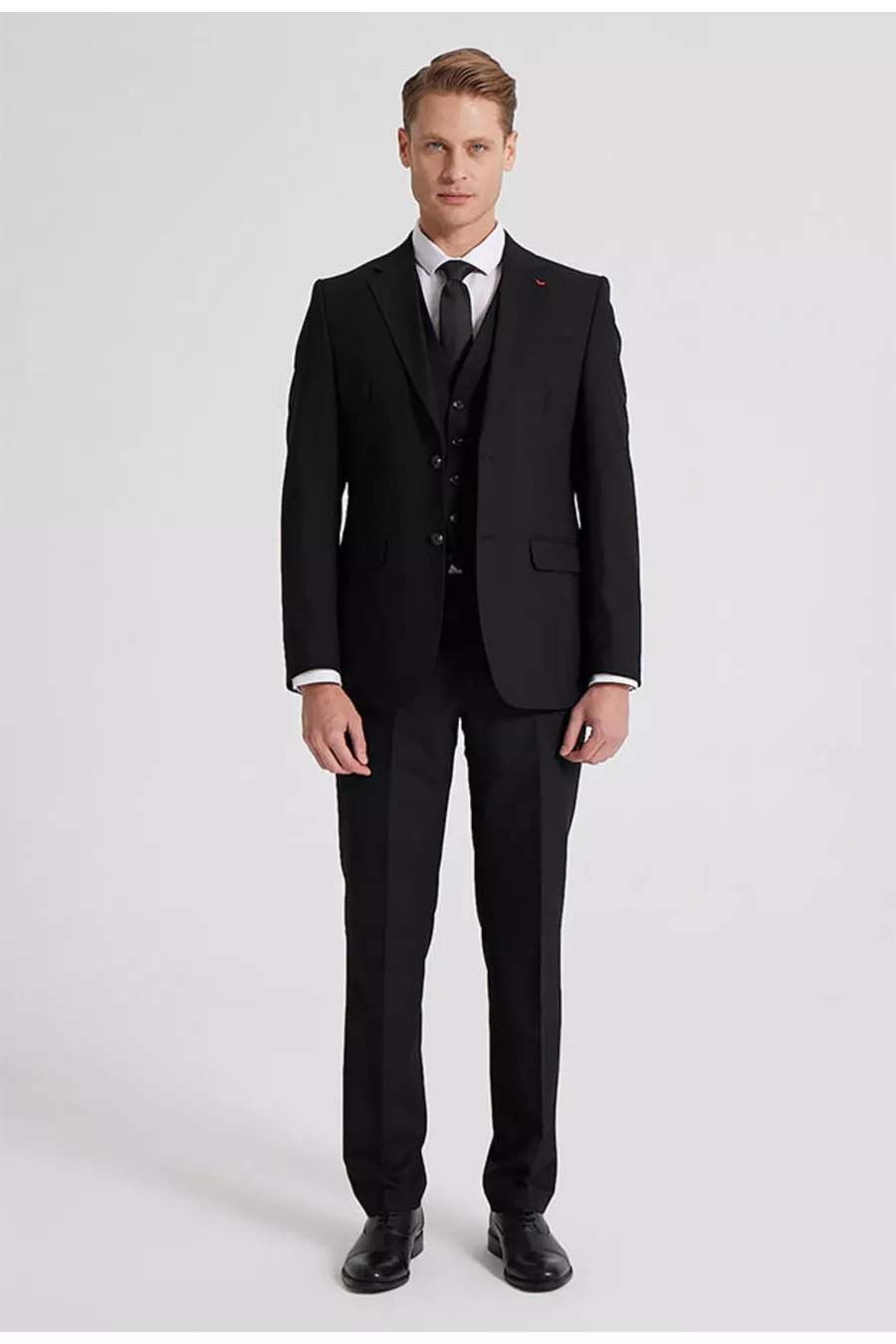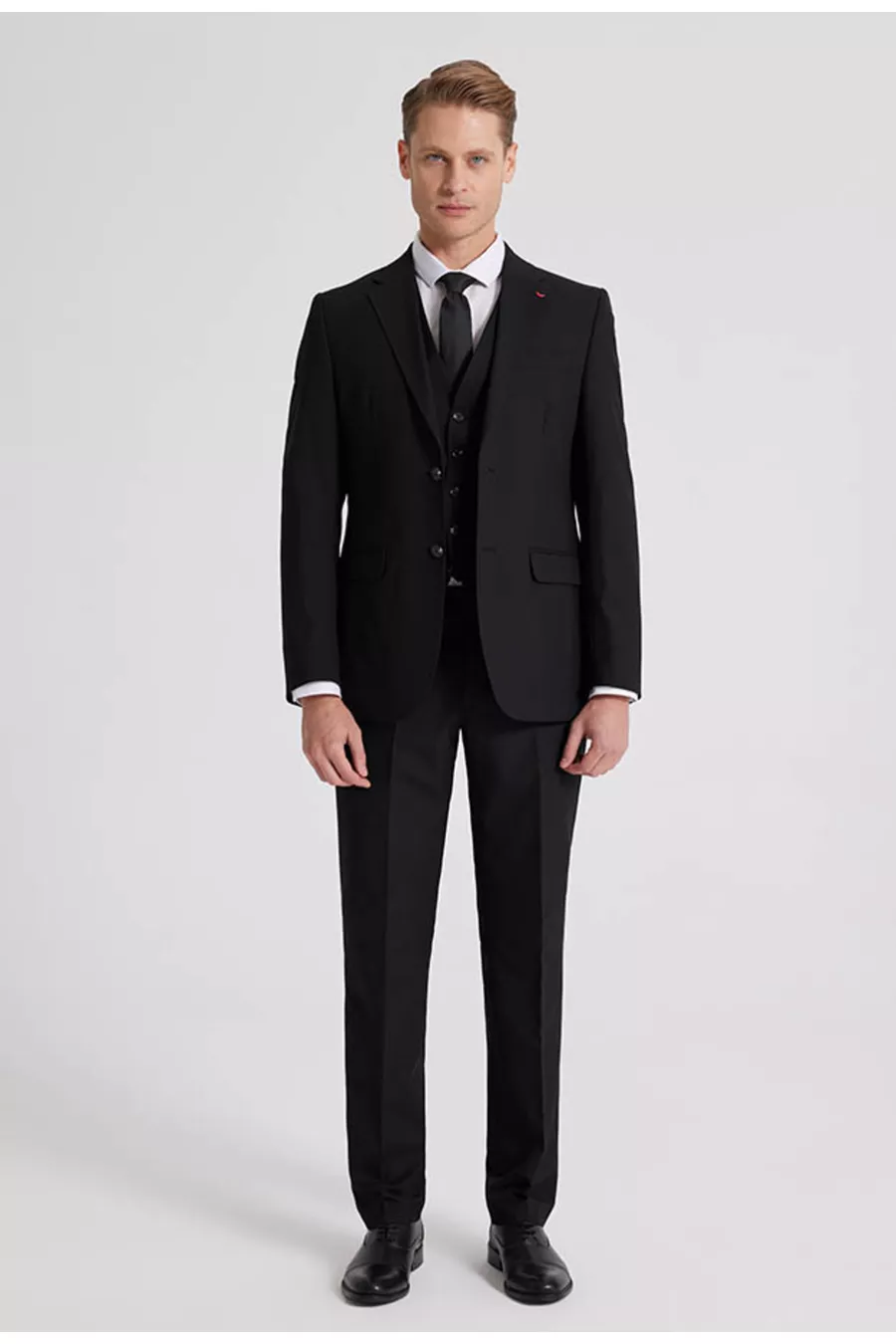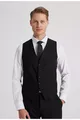 Abito da uomo DS Damat slim fit nero con collo monopetto, spacco singolo, foderato con gilet