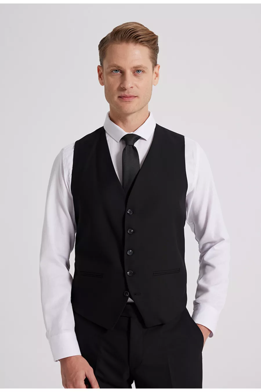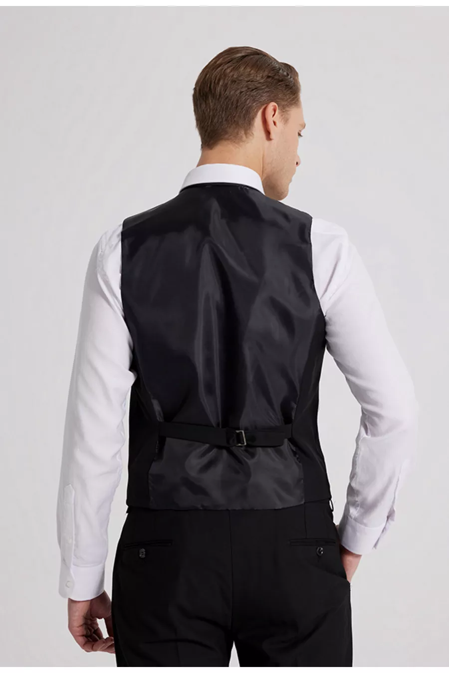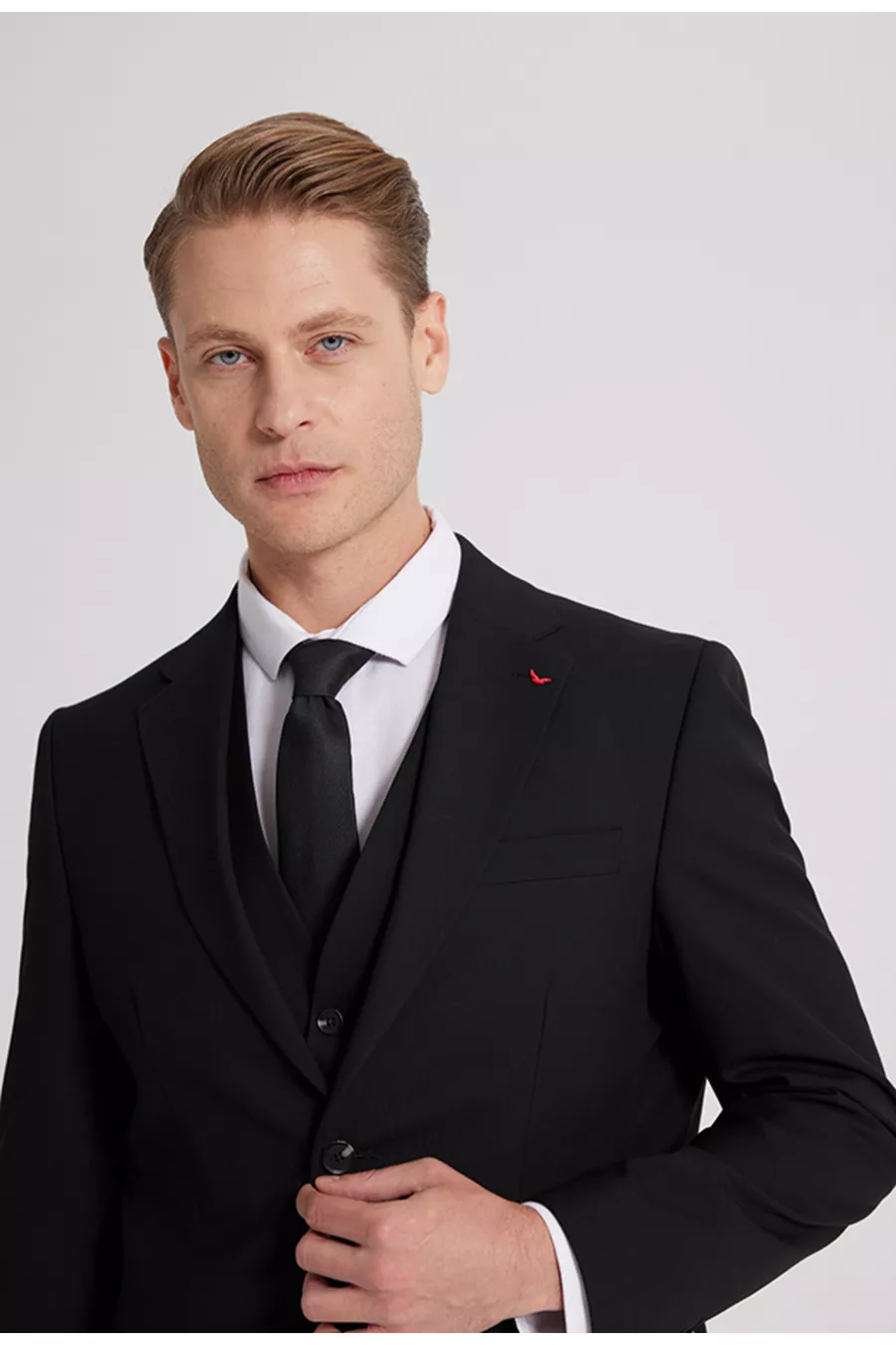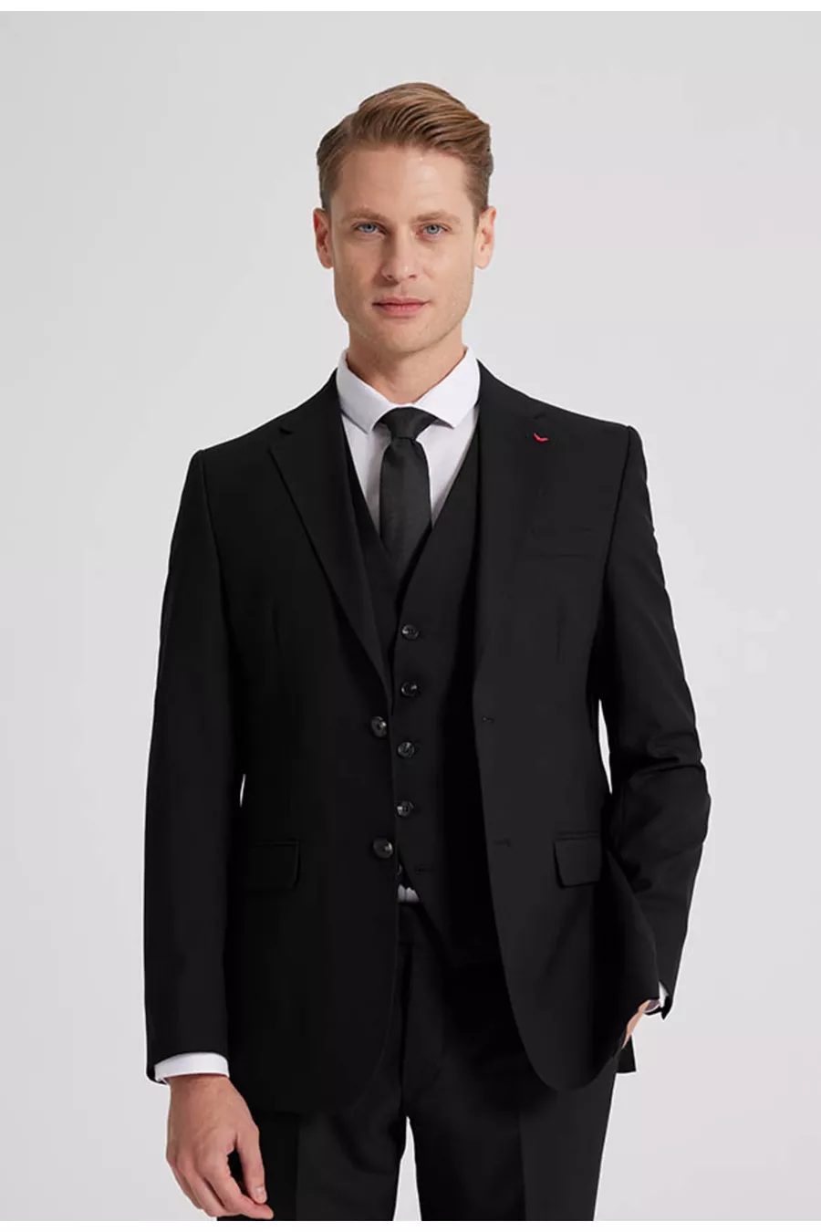 Abito da uomo DS Damat slim fit nero con collo monopetto, spacco singolo, foderato con gilet