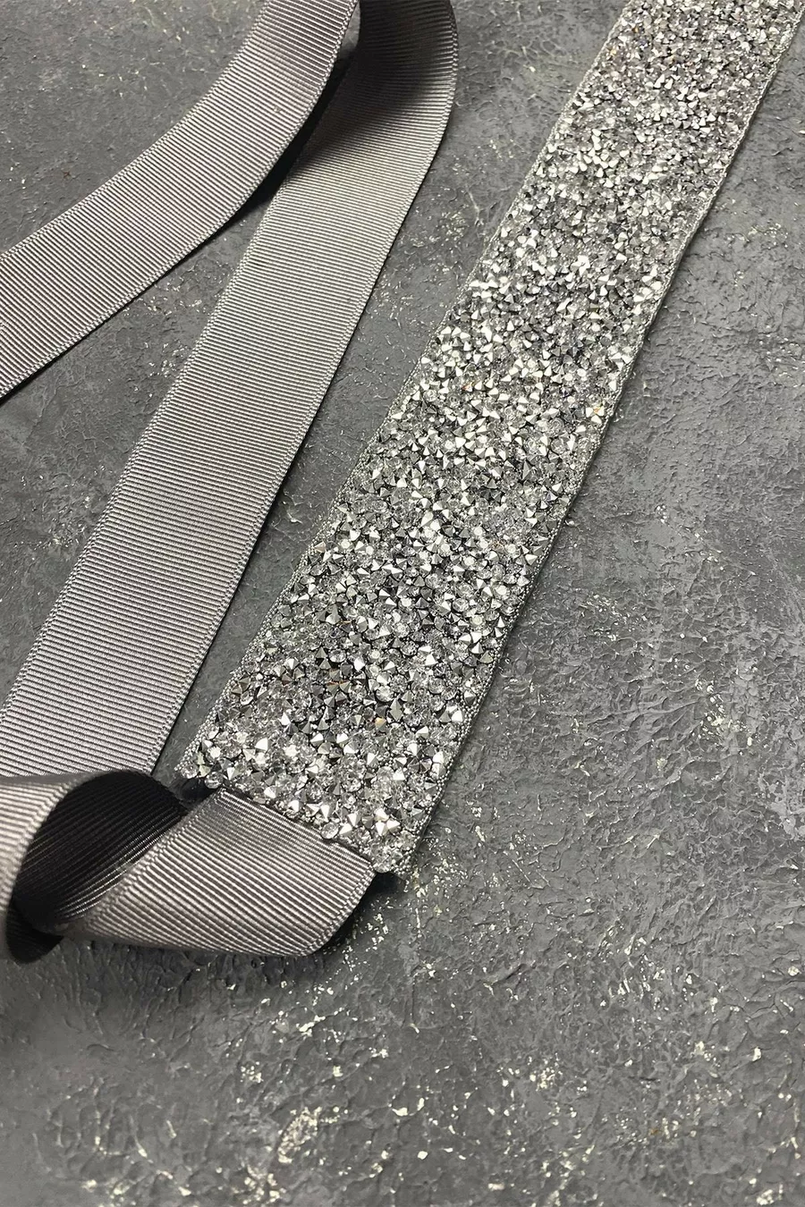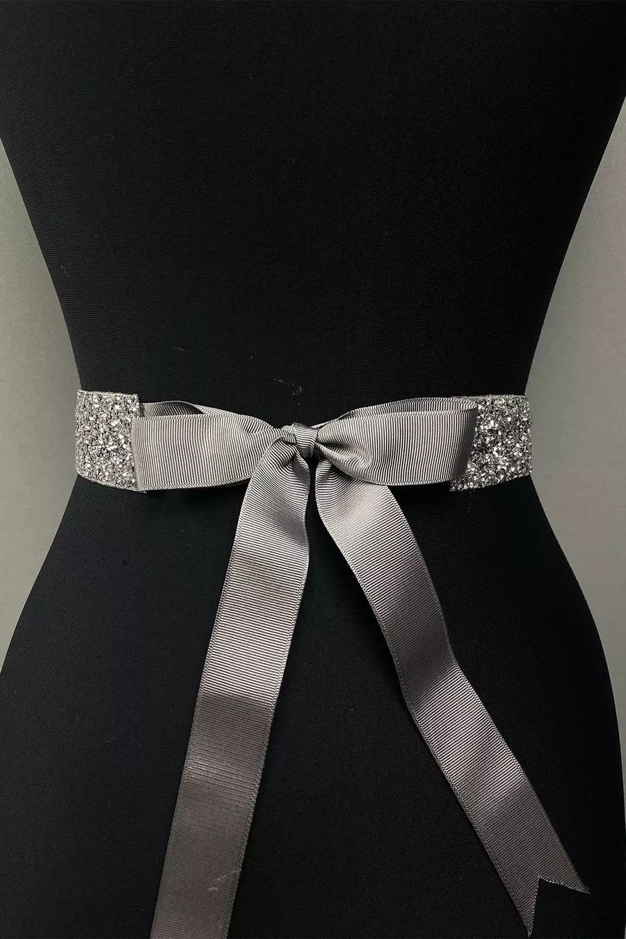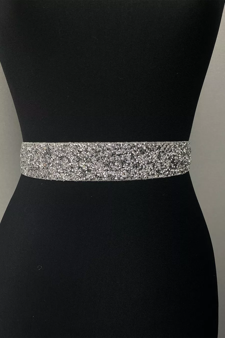 Abito da sera con perline lucide in argento e pietre ricamate con cintura in vita