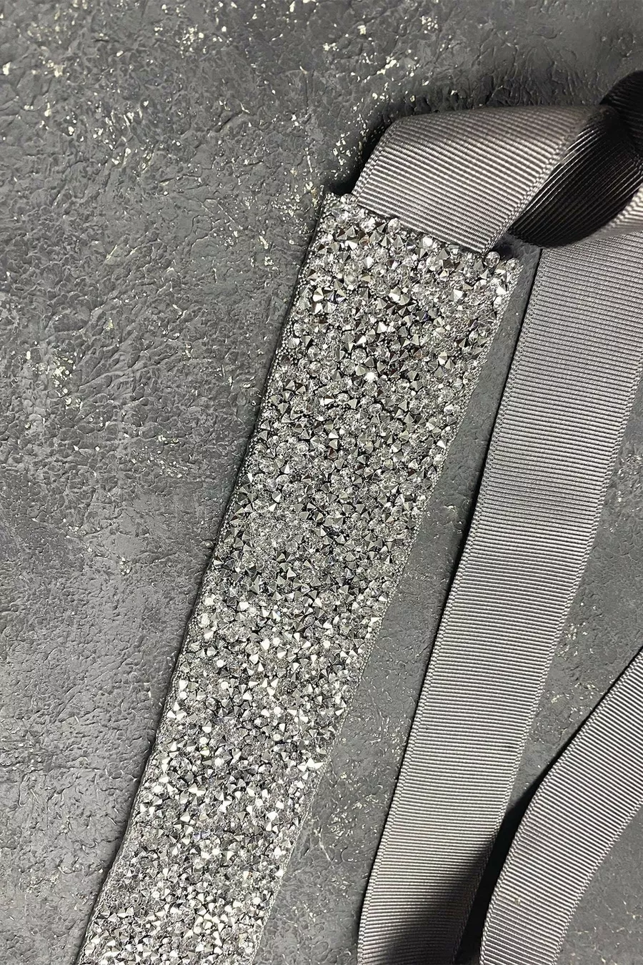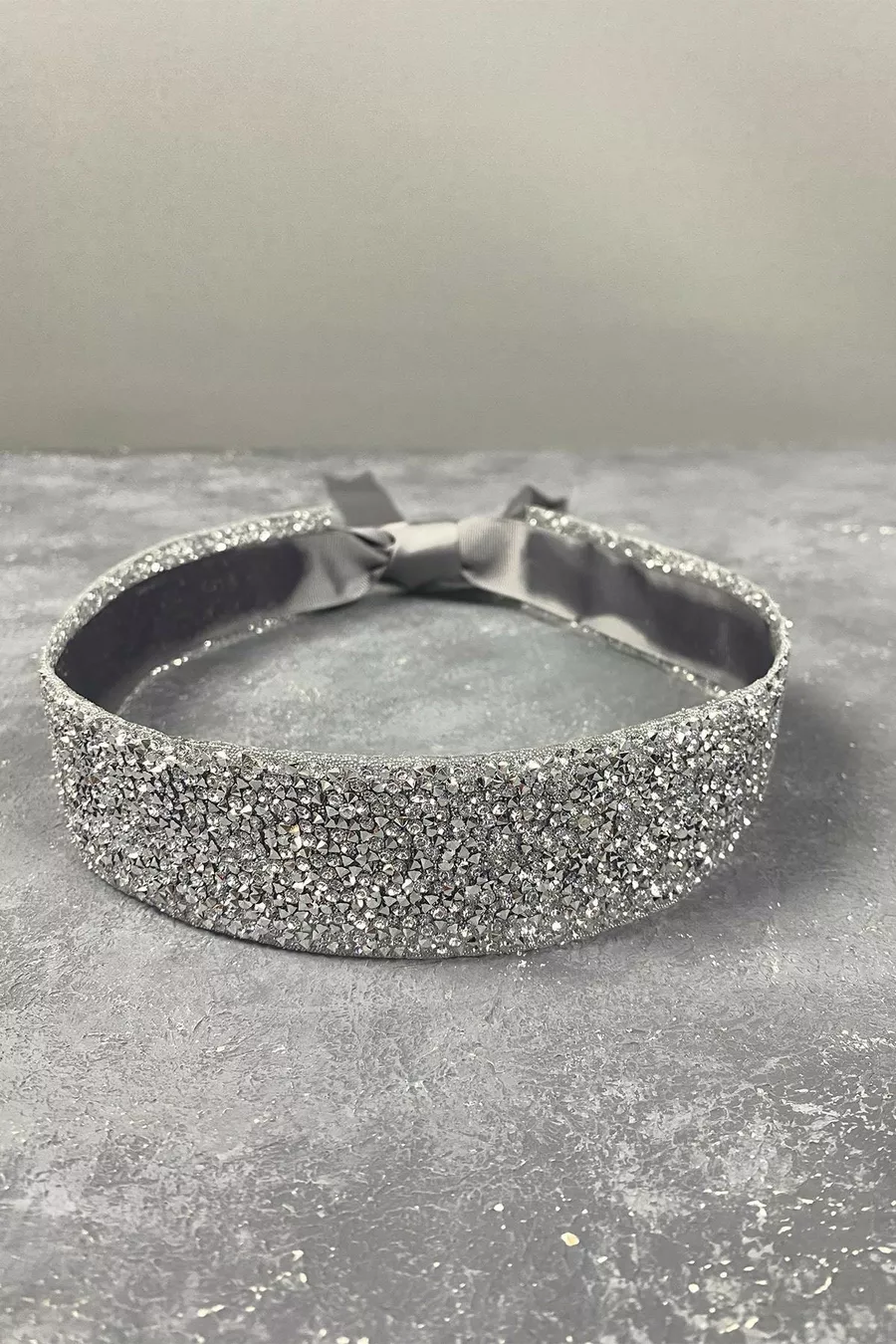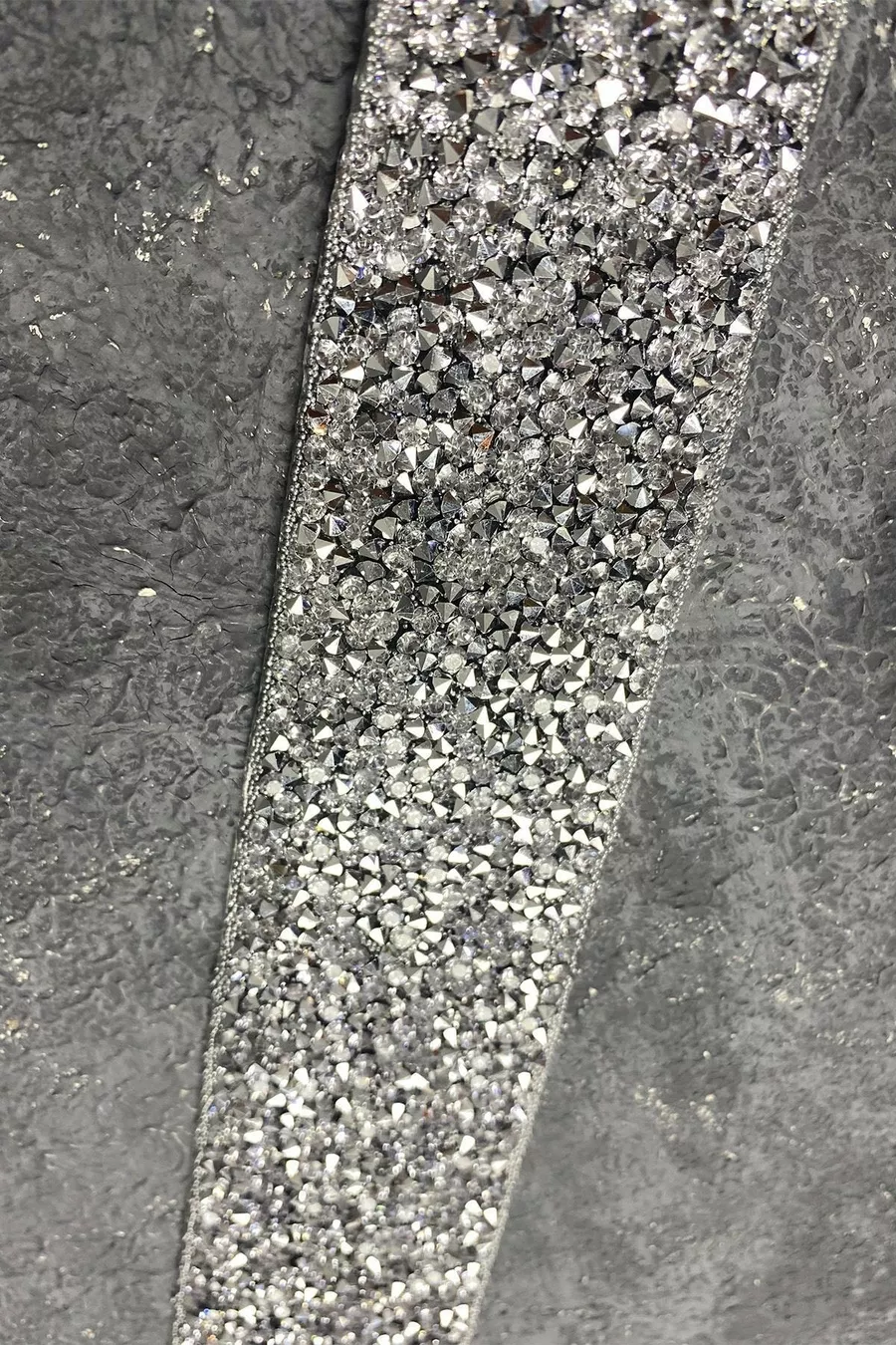 Abito da sera con perline lucide in argento e pietre ricamate con cintura in vita