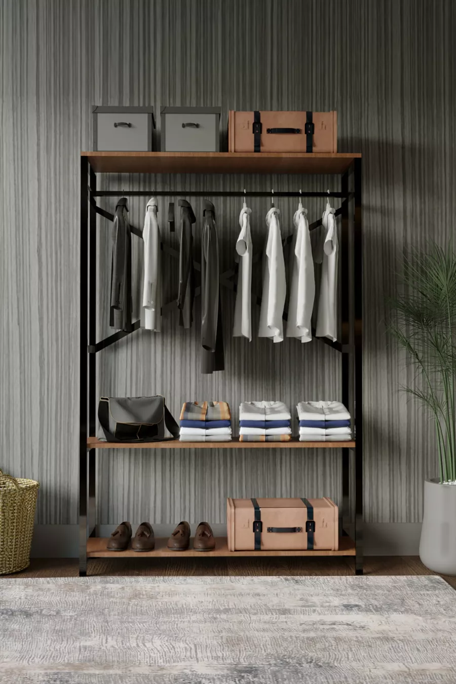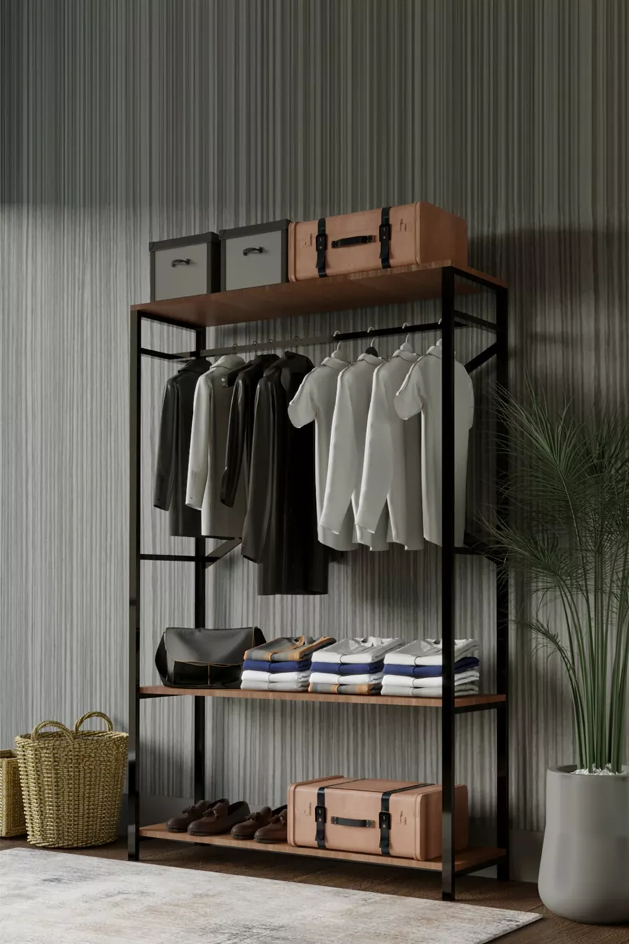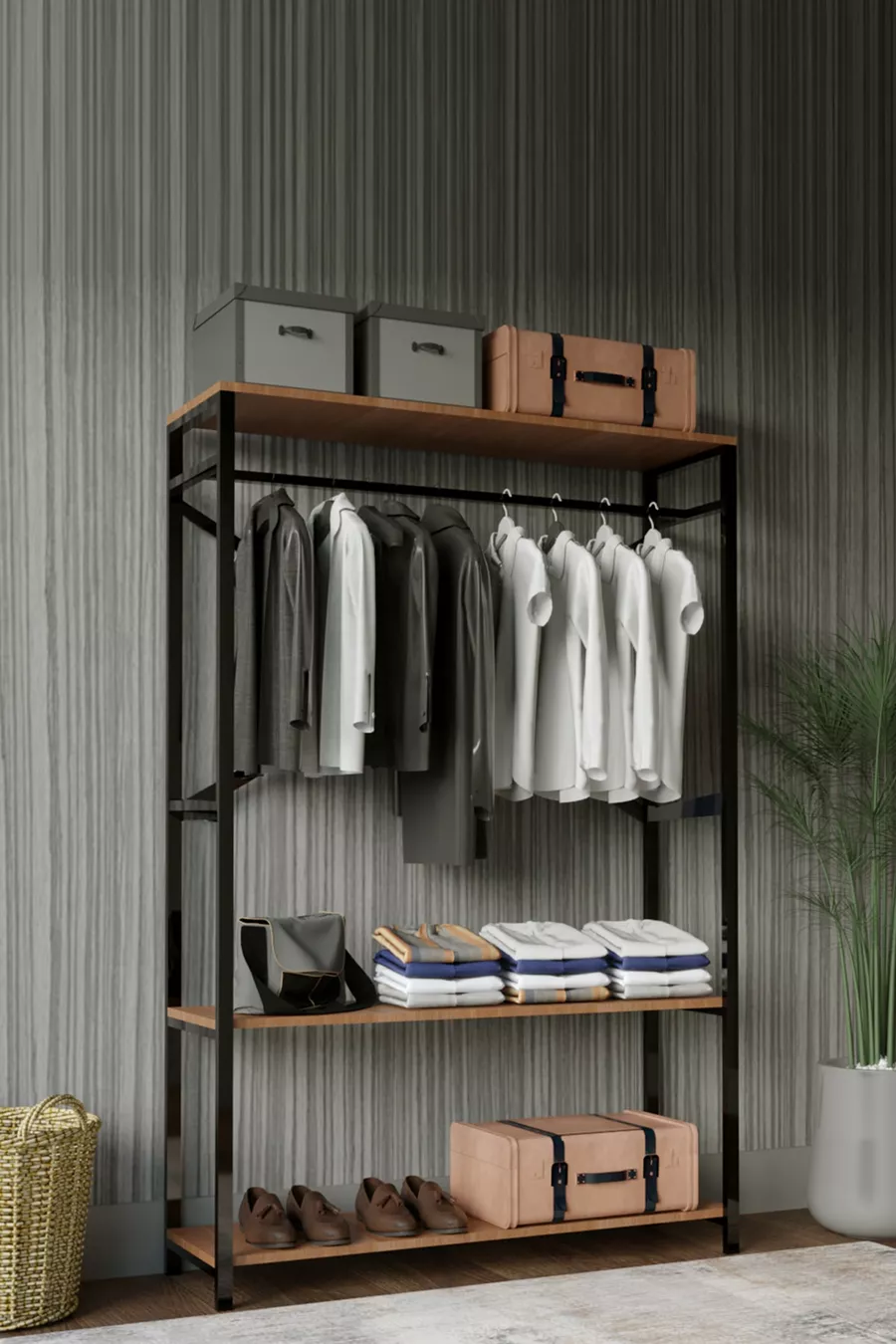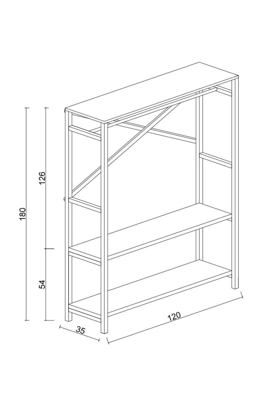 Funzione: Armadio aperto Colore: Marrone Larghezza: 120 cm Profondità: 35 cm Numero di ante: Senza ante Materiale del corpo: Metallo Funzione specchio: Senza specchio Periodo di garanzia: 2 anni Stile: Classico Caratteristica: Con piedini