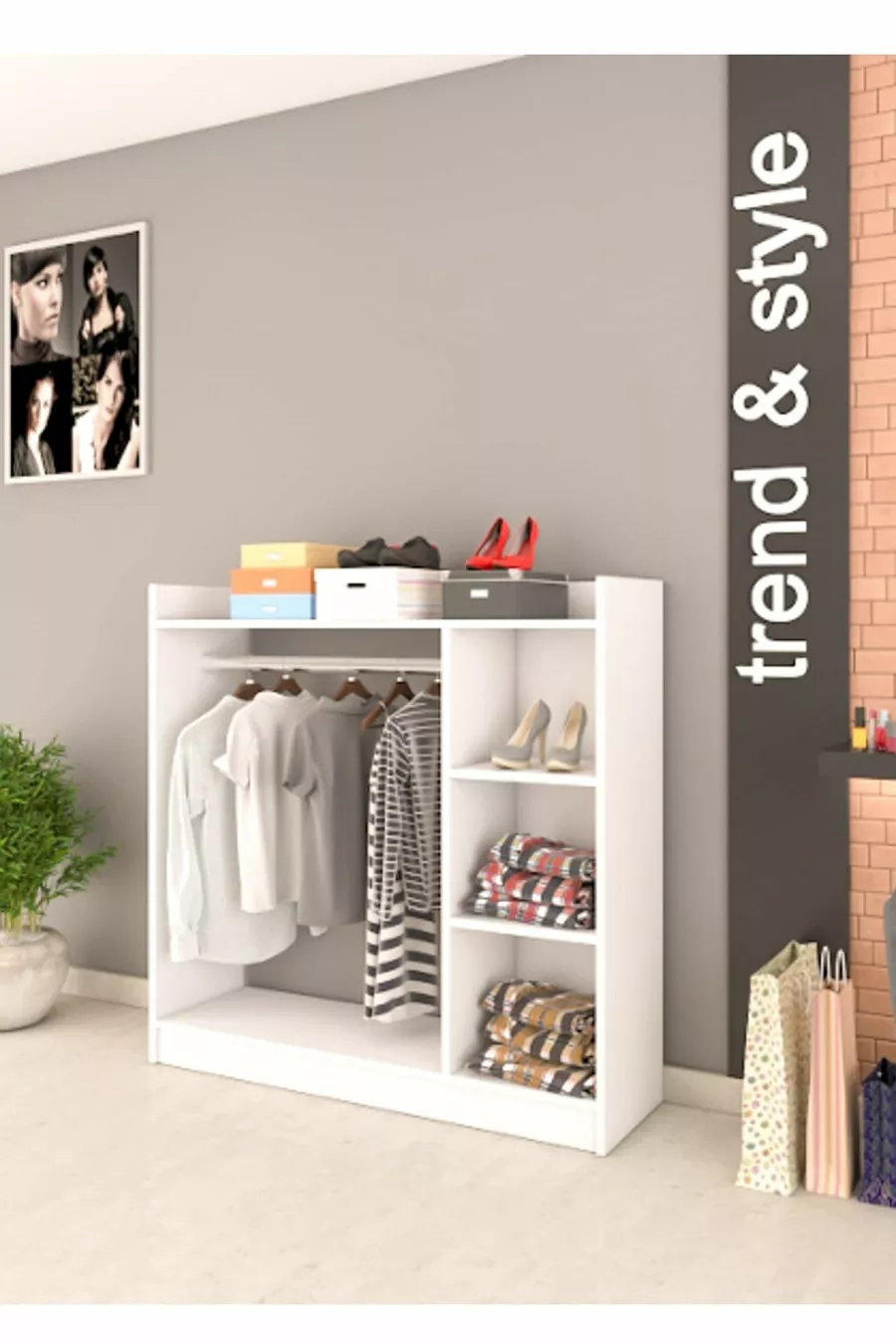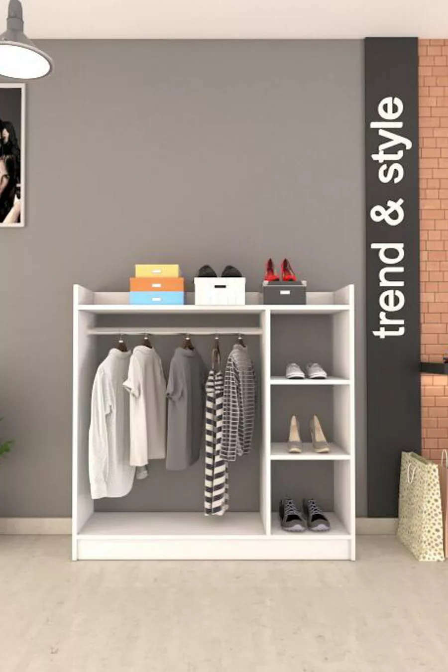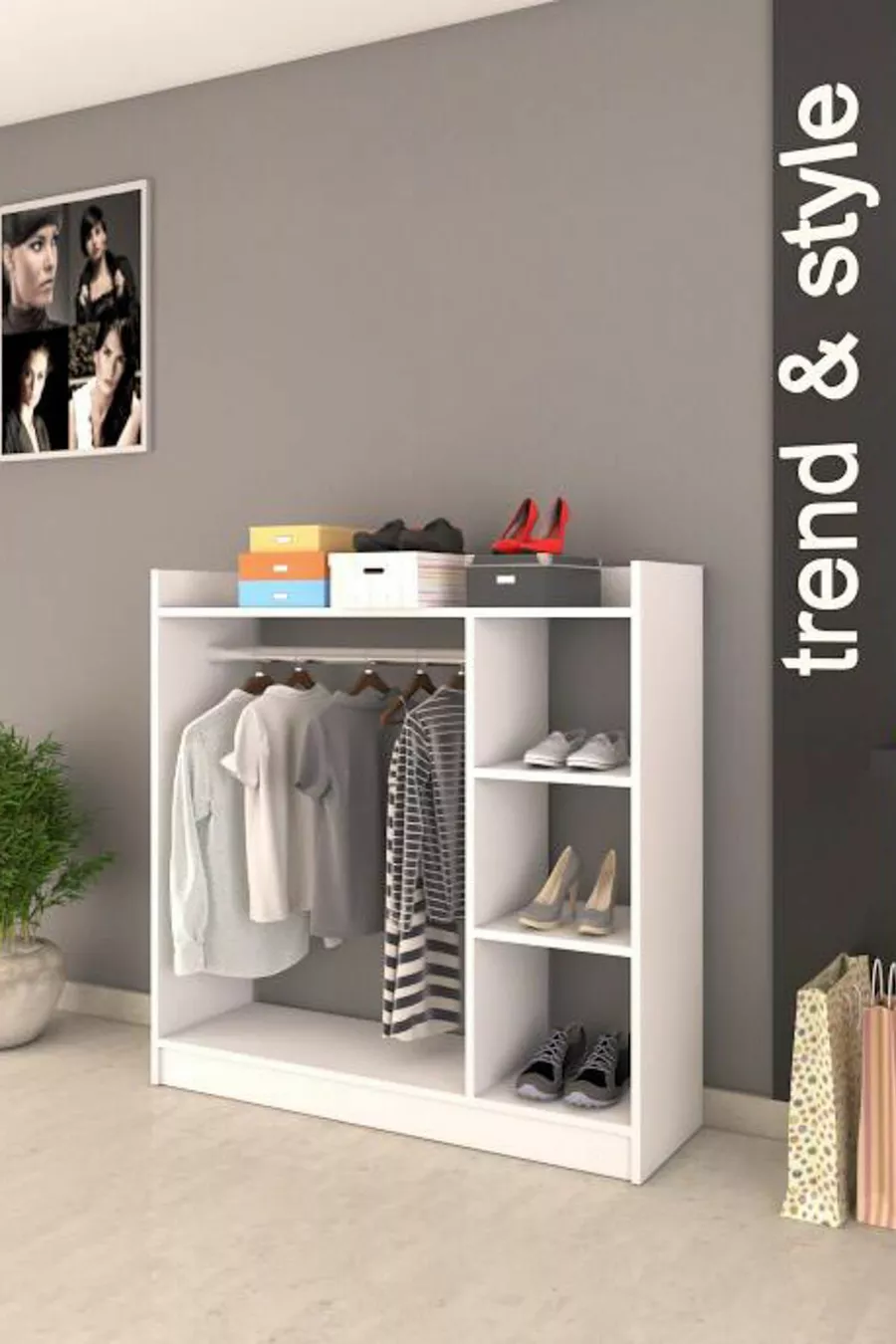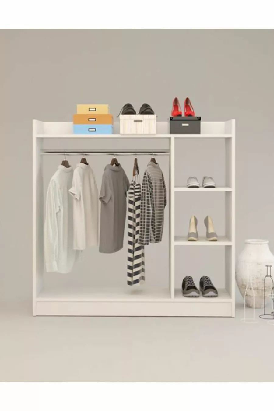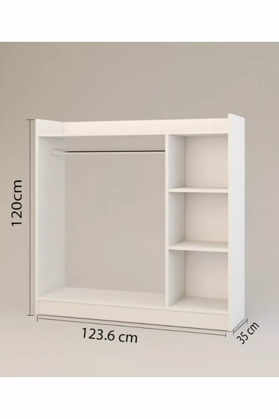 Funzione: Armadio aperto Colore: Bianco Larghezza: 123 cm Profondità: 35 cm Numero di ante: Senza ante Materiale del corpo: Truciolare Funzione specchio: Senza specchio Periodo di garanzia: 2 anni Stile: Moderno Tema / Stile: Moderno Origine: TR
