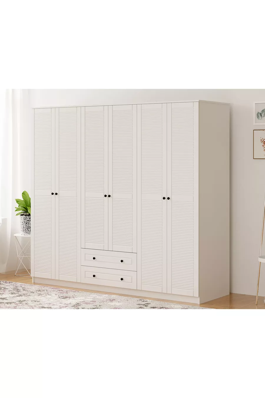 Funzione: Con anta Colore: Bianco Larghezza: 210 cm Profondità: 52 cm Numero di ante: 6 Materiale del corpo: Truciolare Funzione specchio: Senza specchio Periodo di garanzia: 2 anni Stile: Country Tema / Stile: Country Origine: TR Caratteristica: Con cassetti