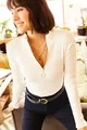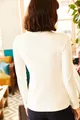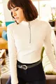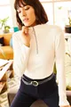 Blusa da donna color ecru con collo a dolcevita, zip nera e tessuto elasticizzato