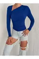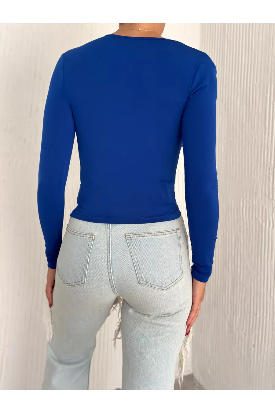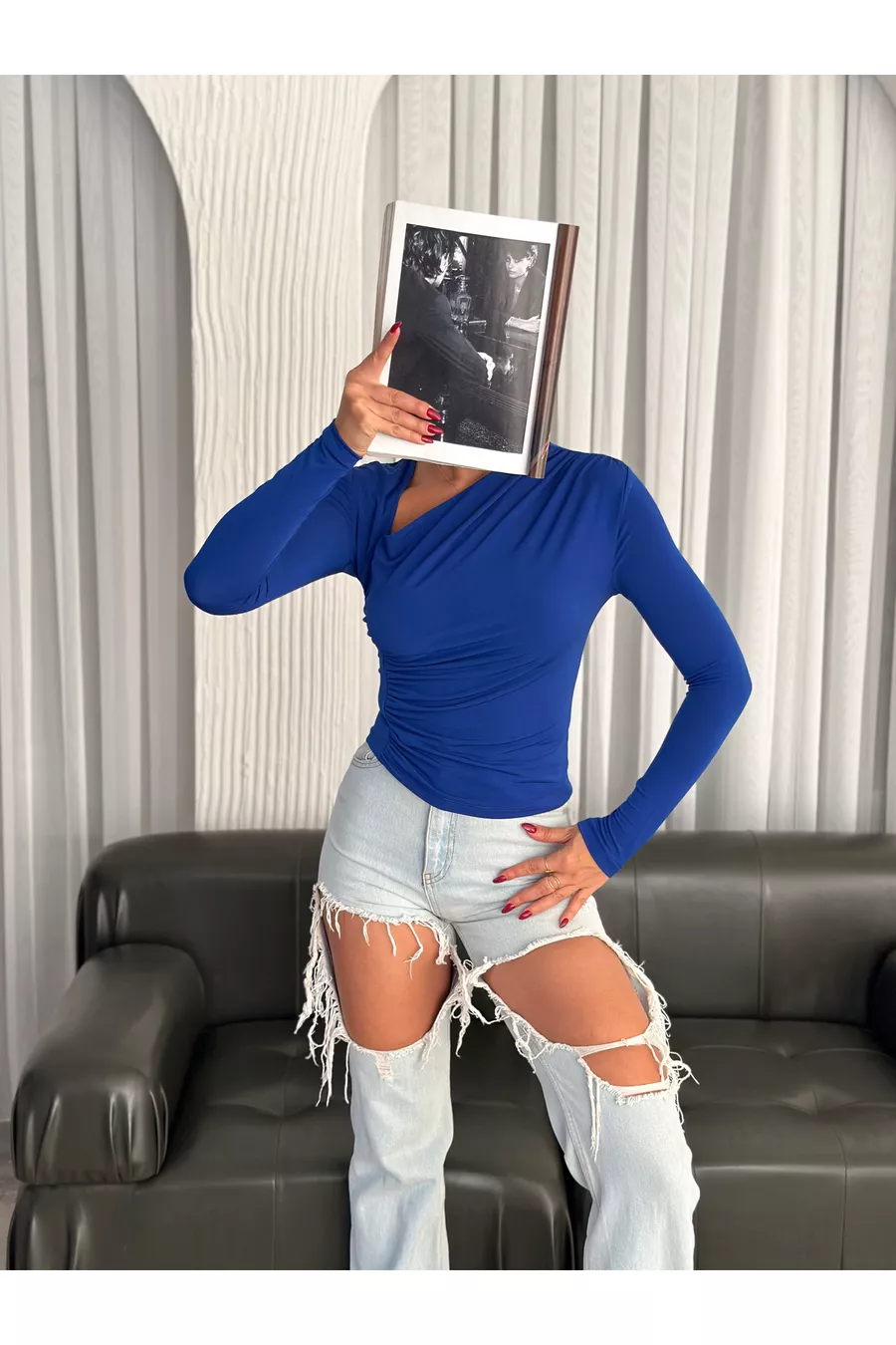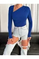 Blusa da donna in tessuto sandy blu con scollatura a V e dettaglio doppio strato sul davanti